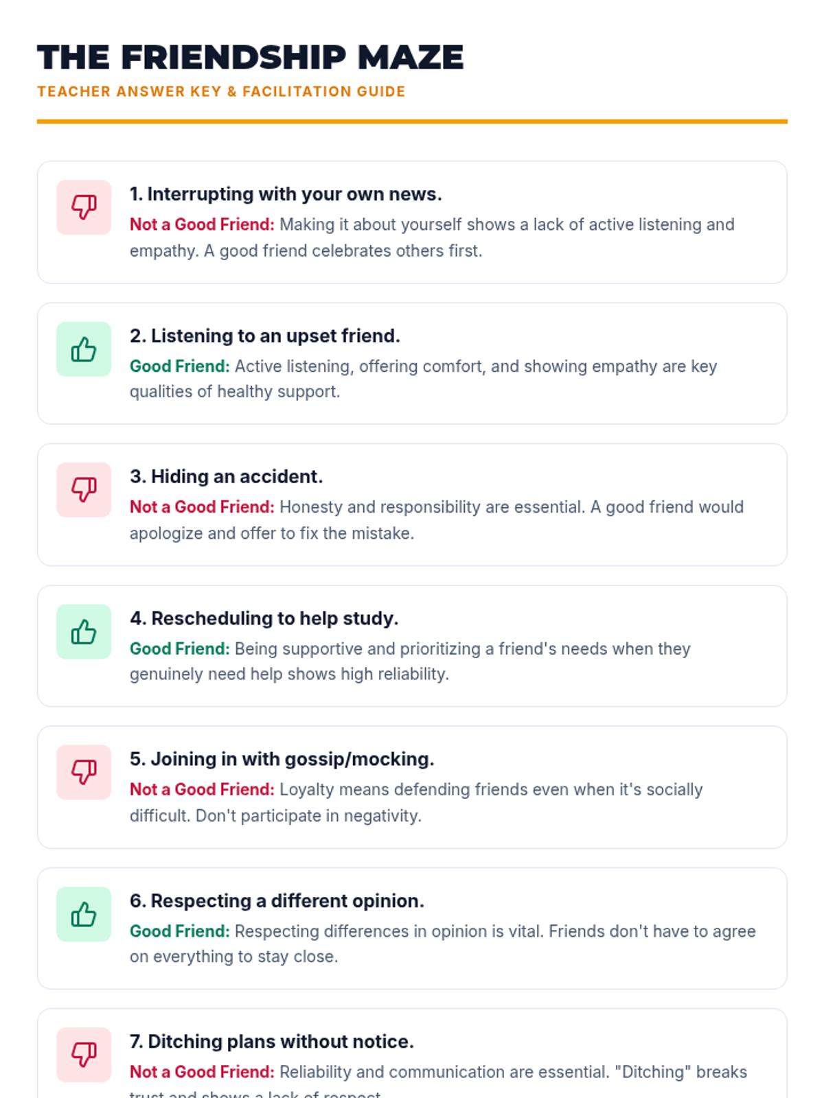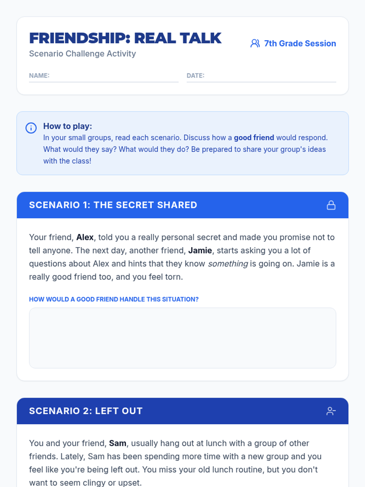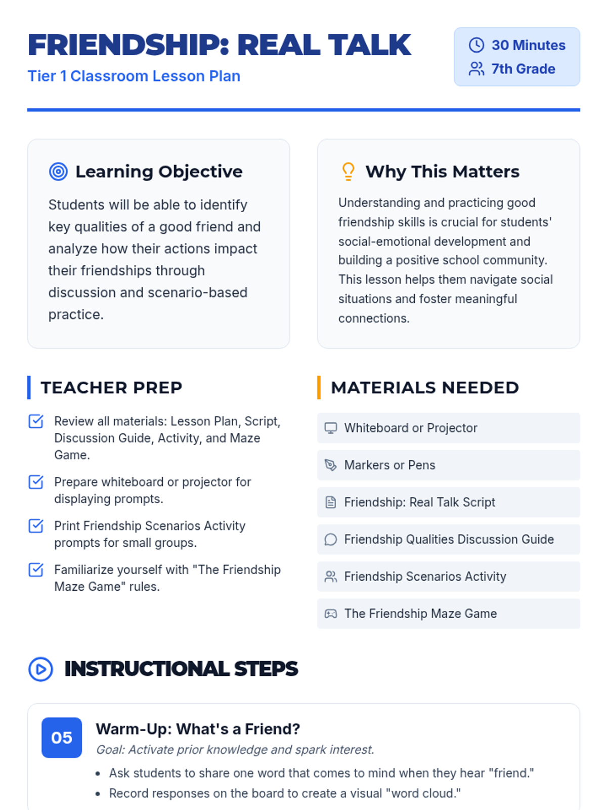 A 30-minute interactive lesson for 7th graders to explore the qualities of healthy friendships and practice supportive communication through scenarios and a quick-response game.
