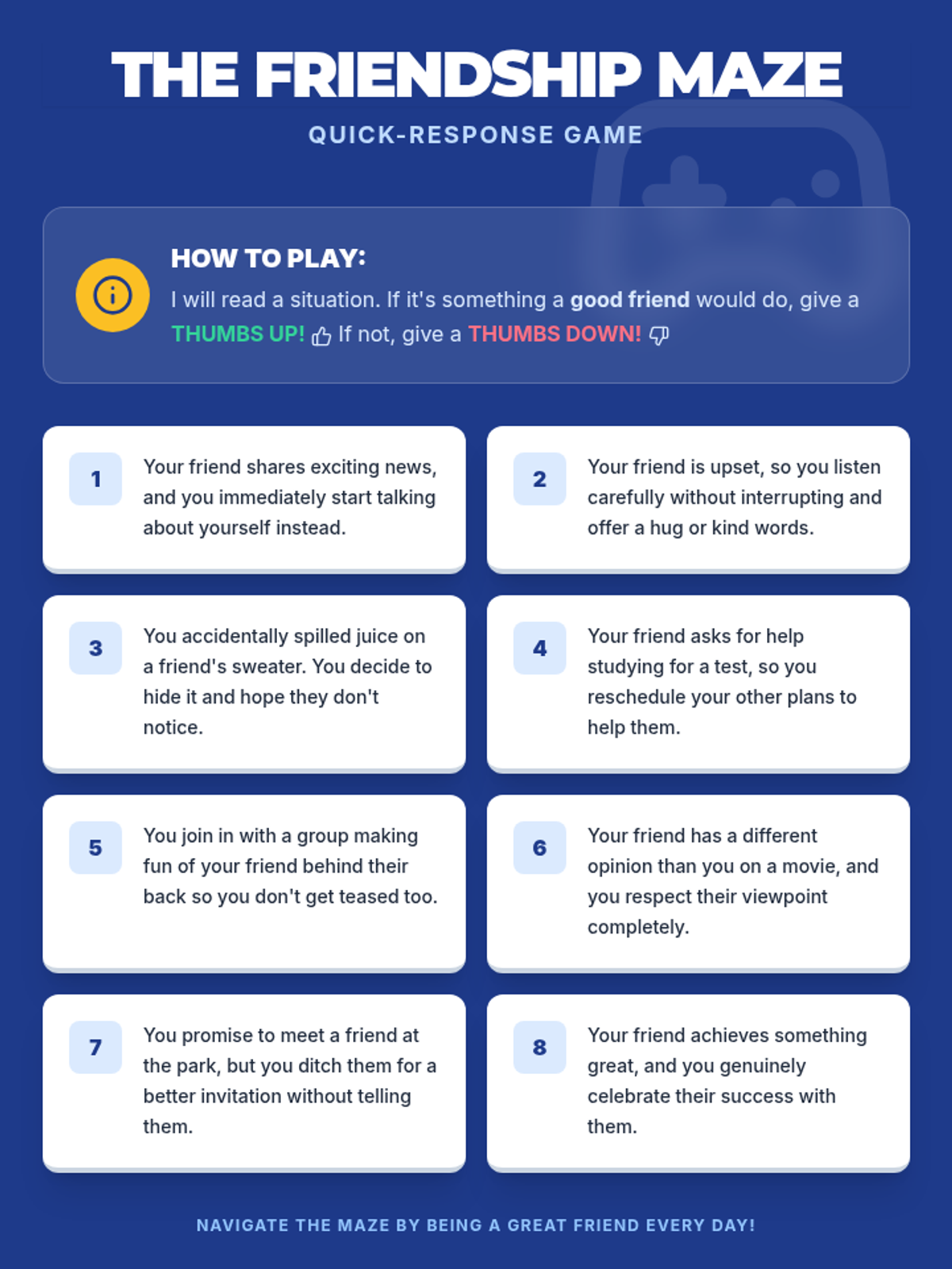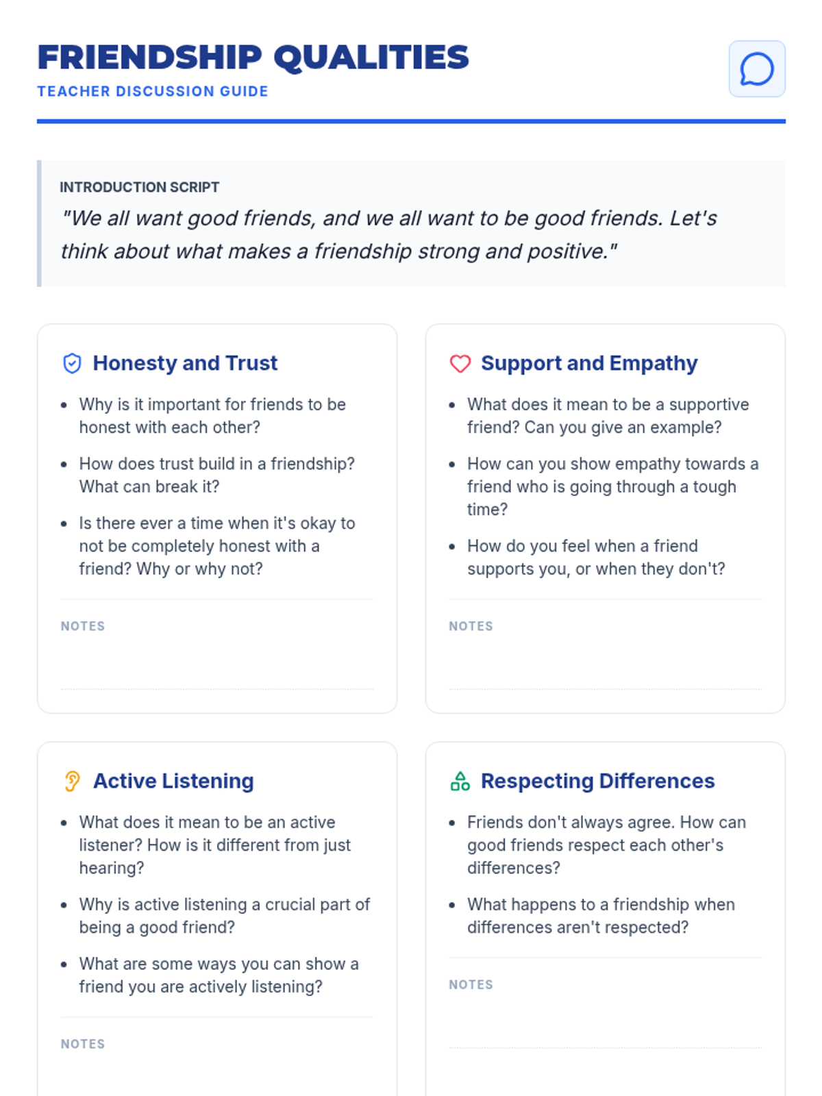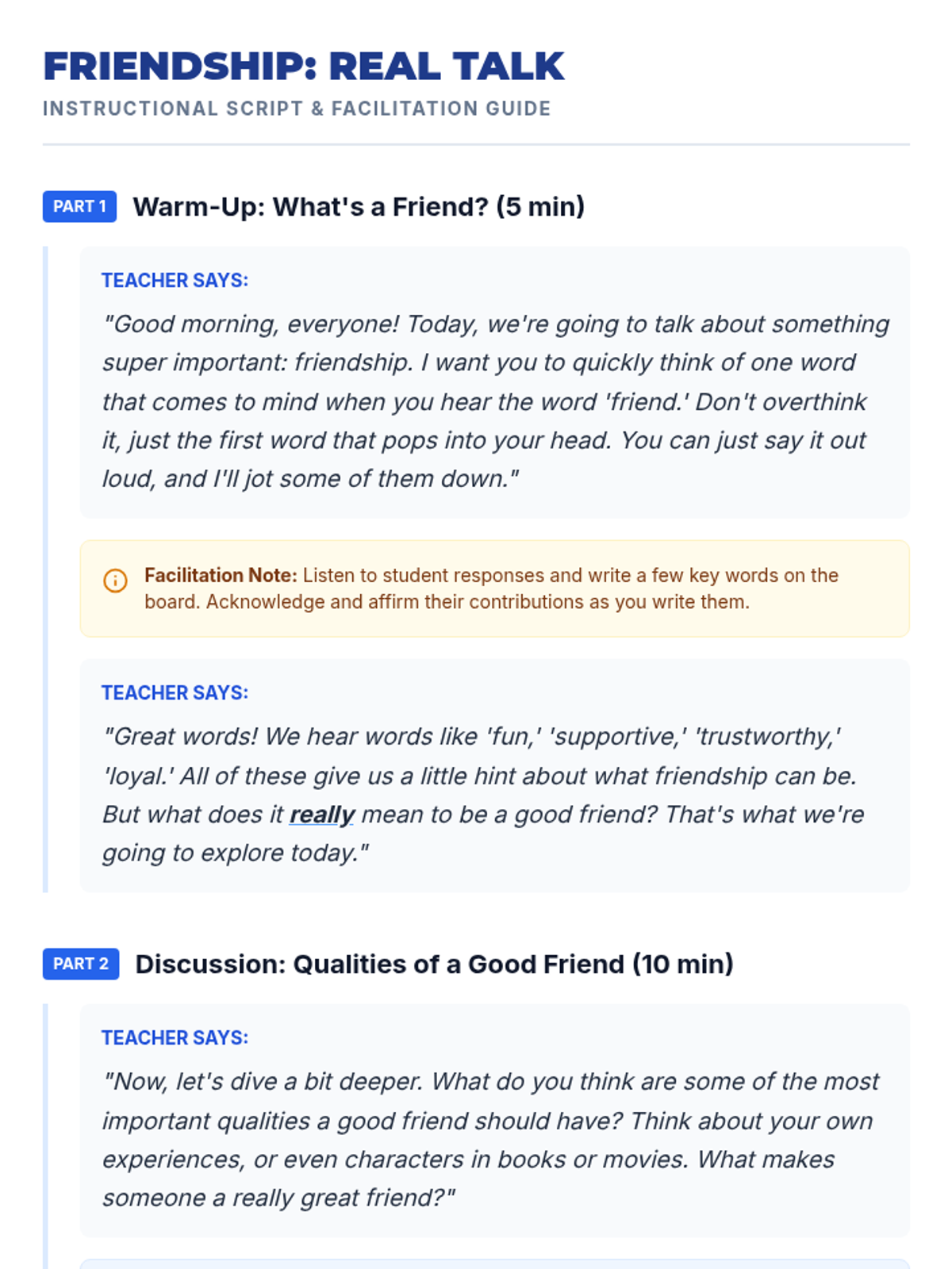 A 30-minute interactive lesson for 7th graders to explore the qualities of healthy friendships and practice supportive communication through scenarios and a quick-response game.