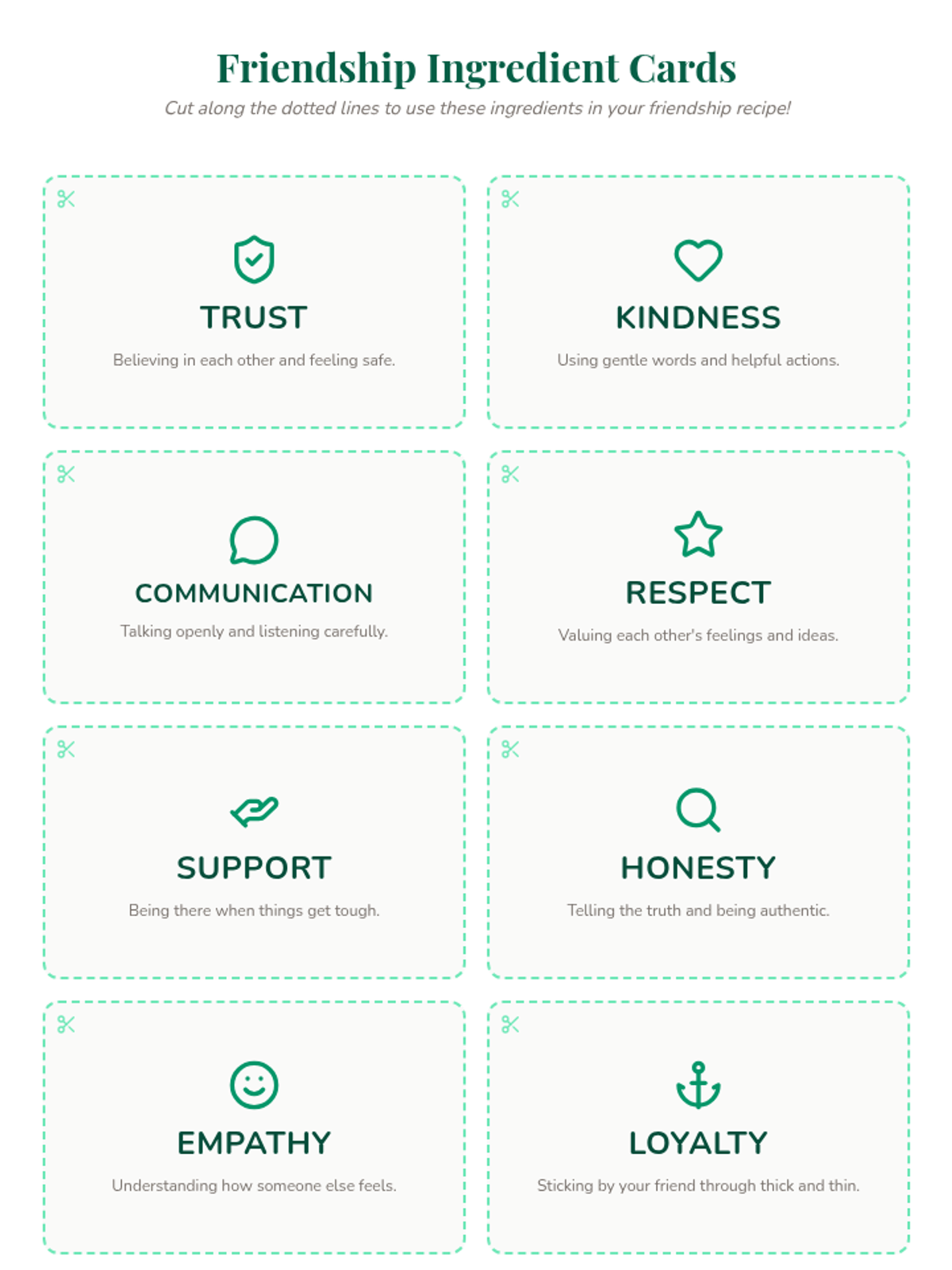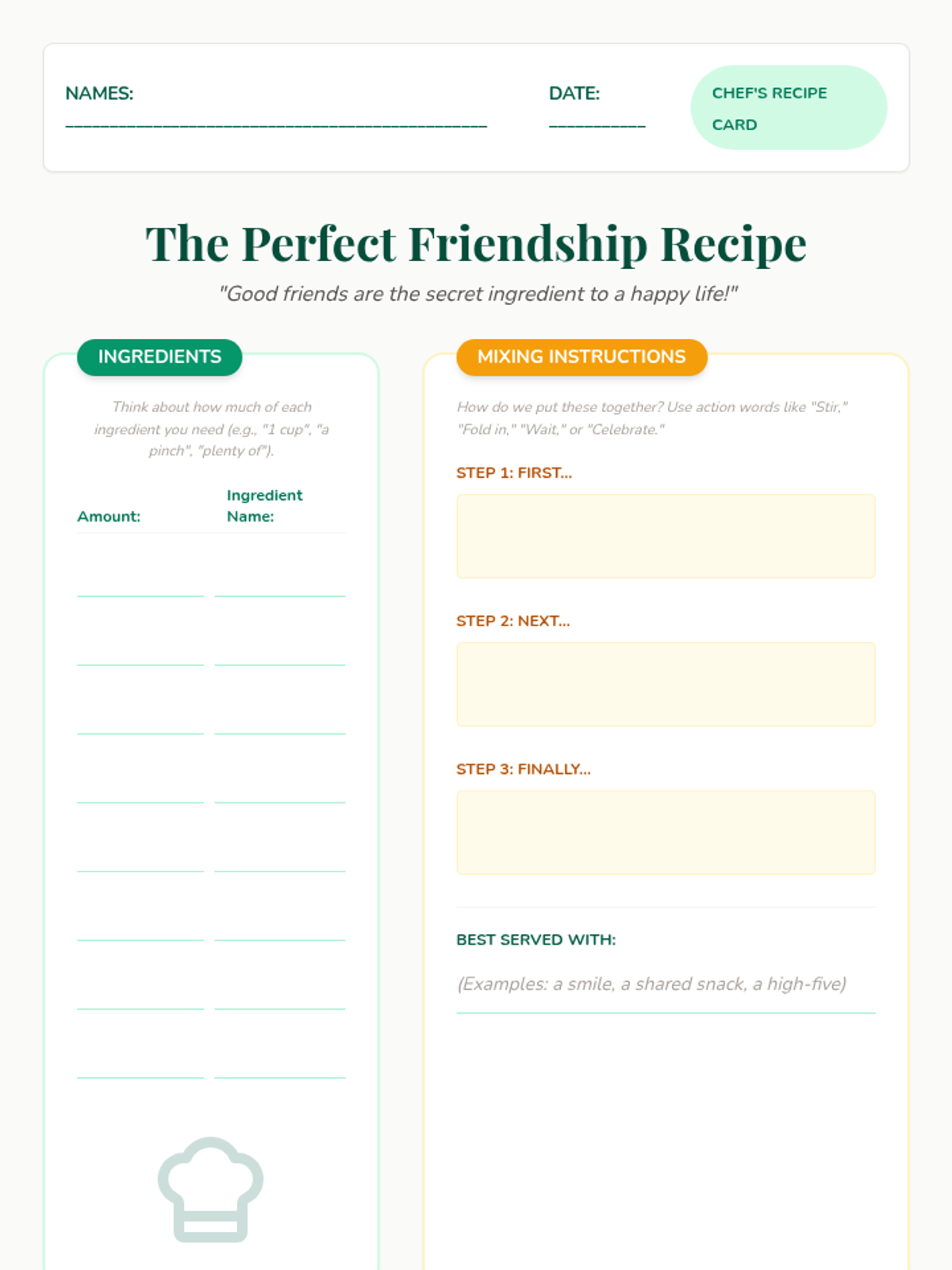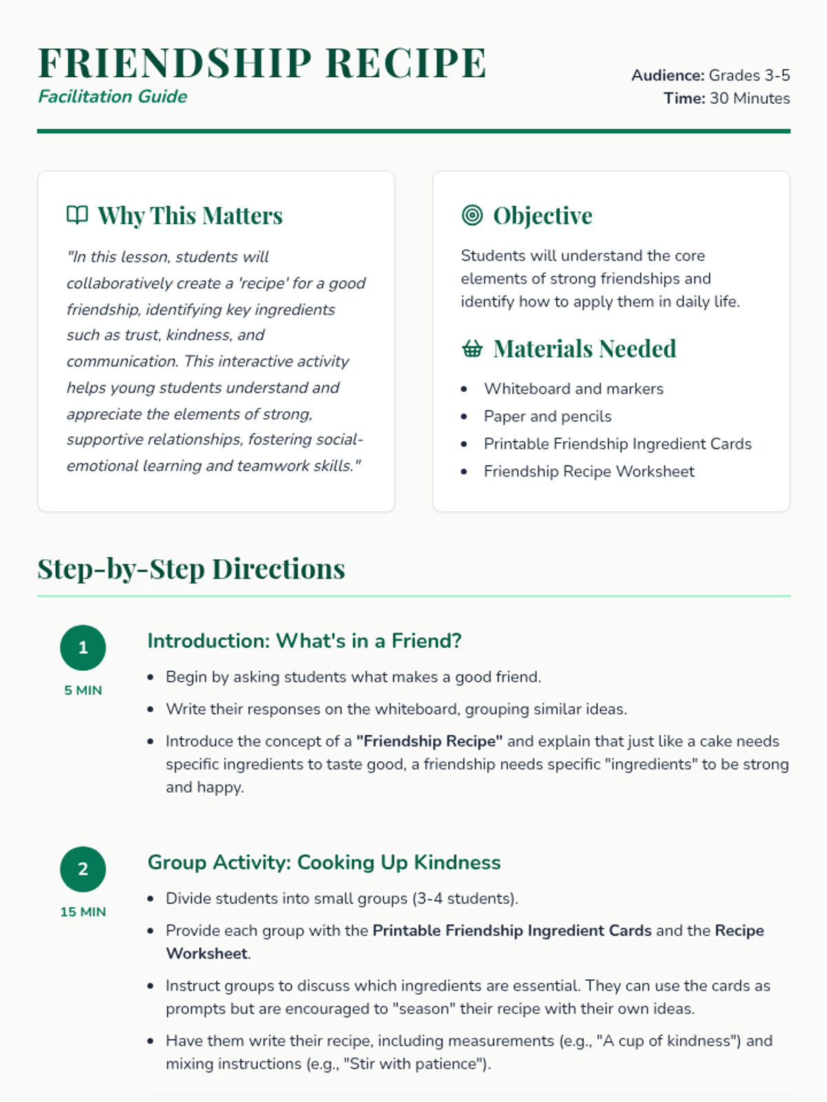 In this lesson, students will collaboratively create a 'recipe' for a good friendship, identifying key ingredients such as trust, kindness, and communication to understand the elements of strong, supportive relationships.