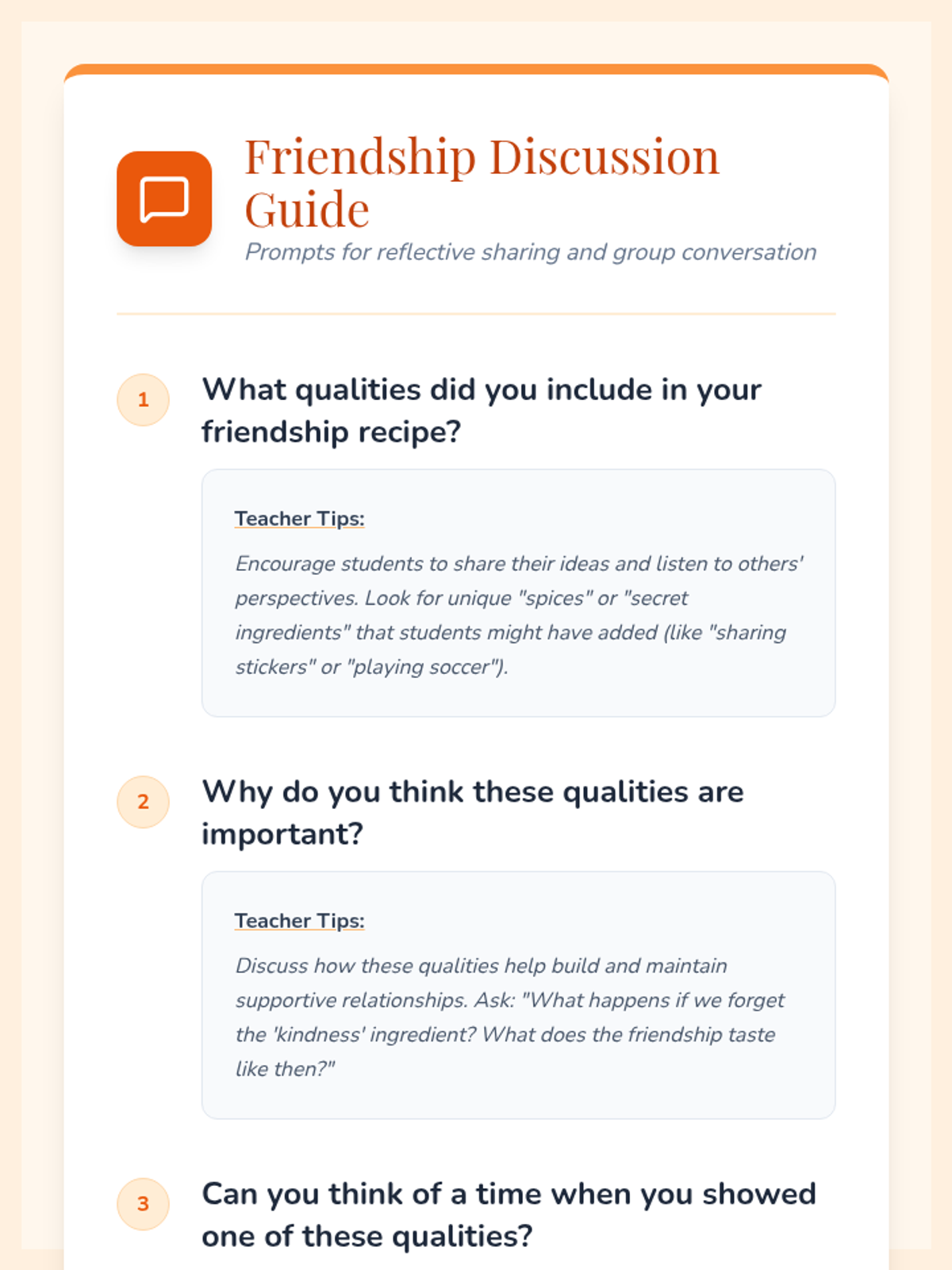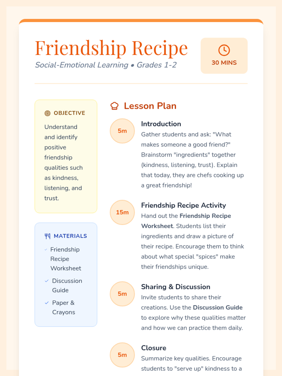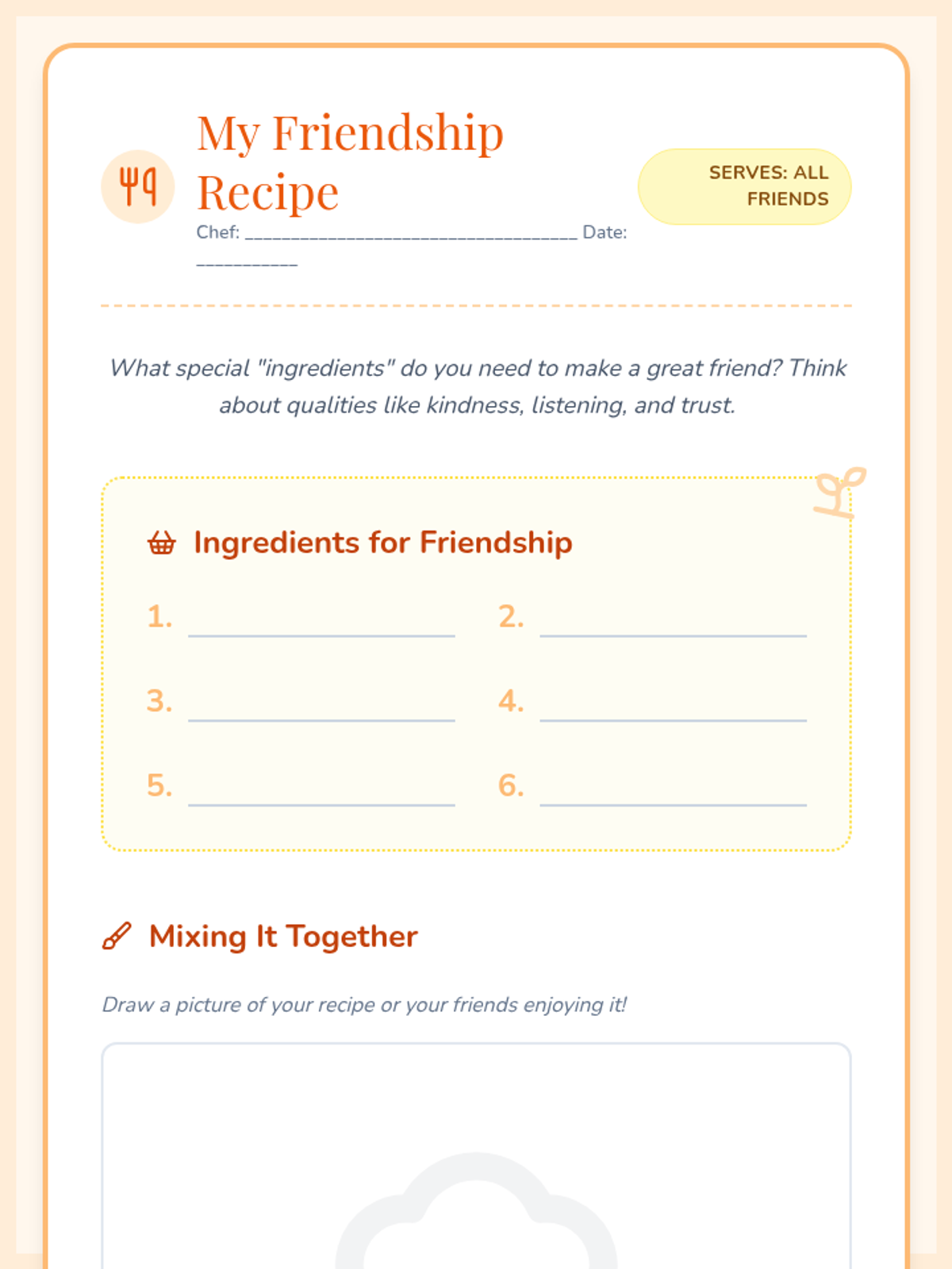 Students explore the 'ingredients' of a good friend, creating their own friendship recipes to build social-emotional skills and empathy.