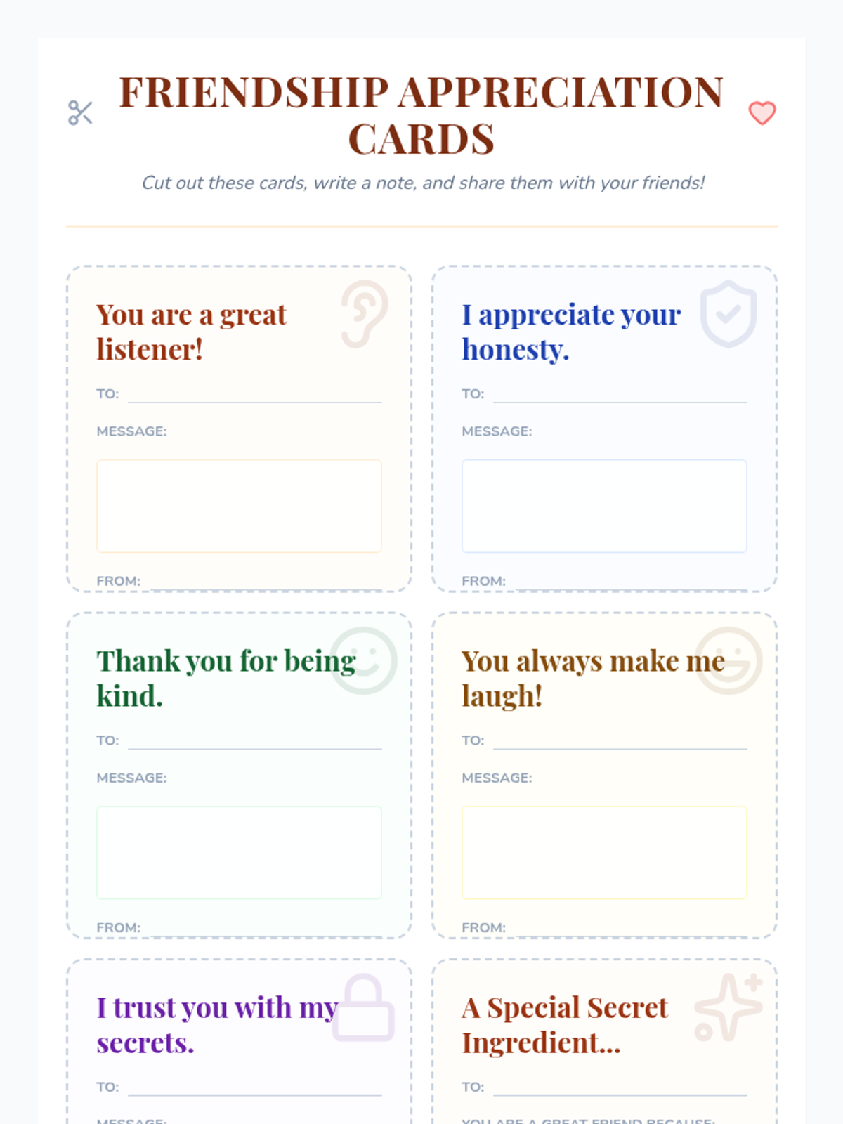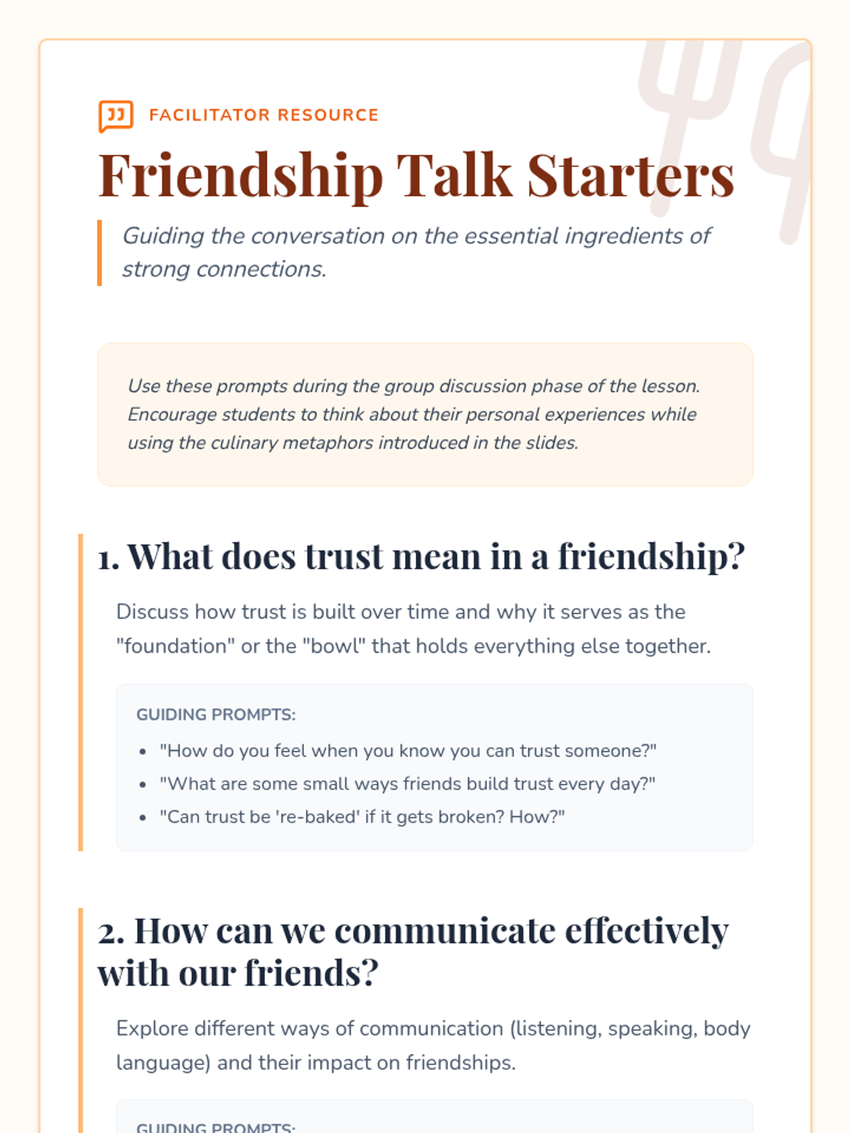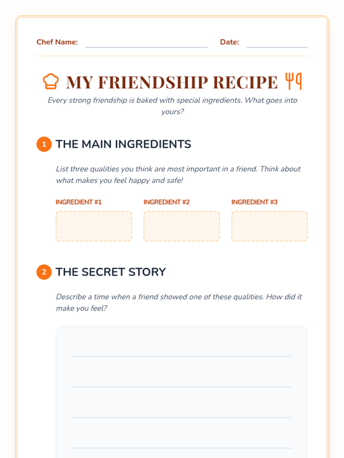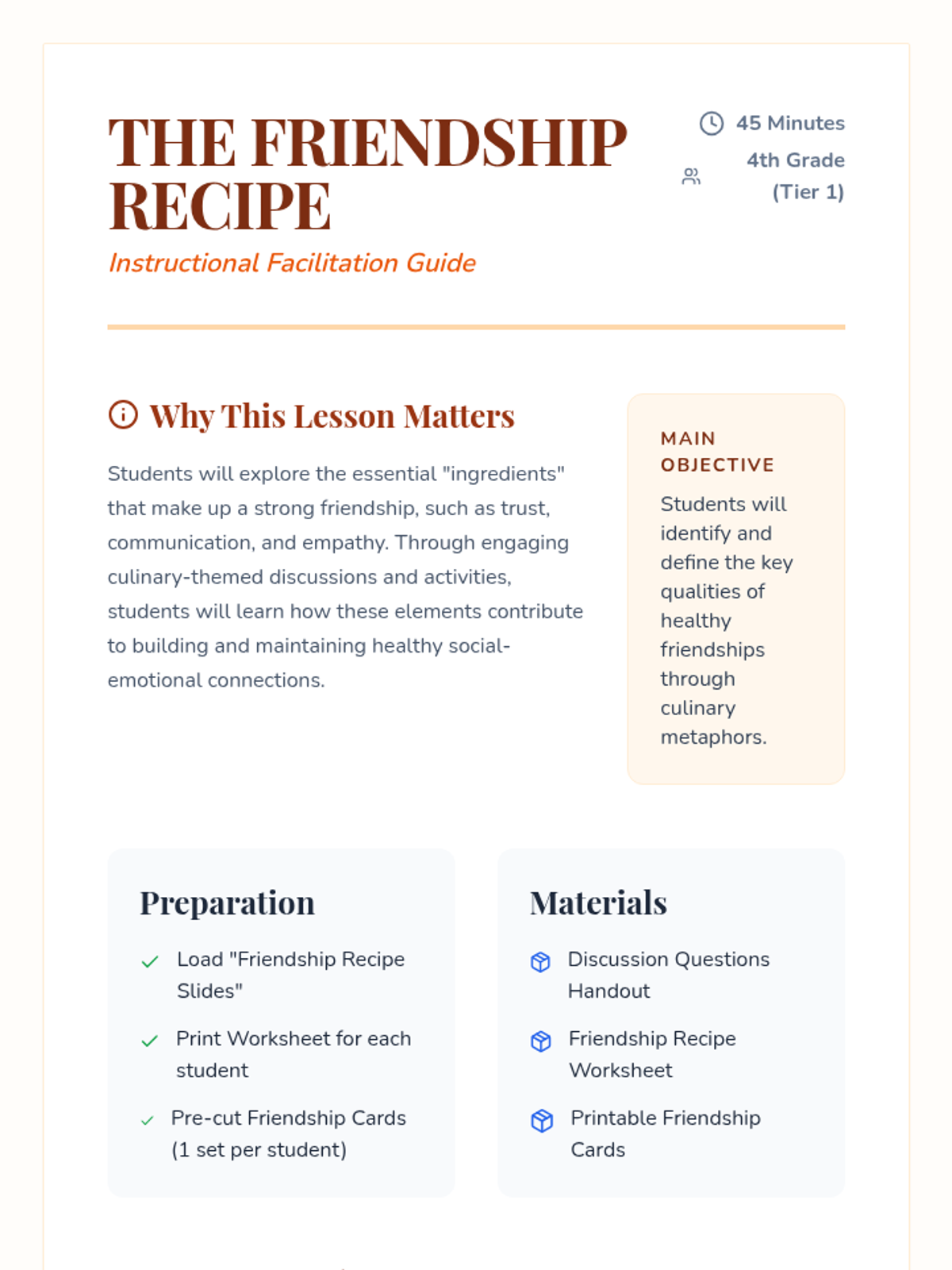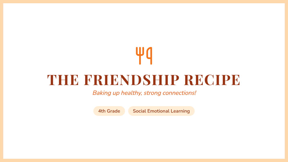 Students explore the 'ingredients' of a healthy friendship, including trust, communication, and empathy, through a culinary-themed lesson that culminates in creating their own friendship recipes and appreciation cards.