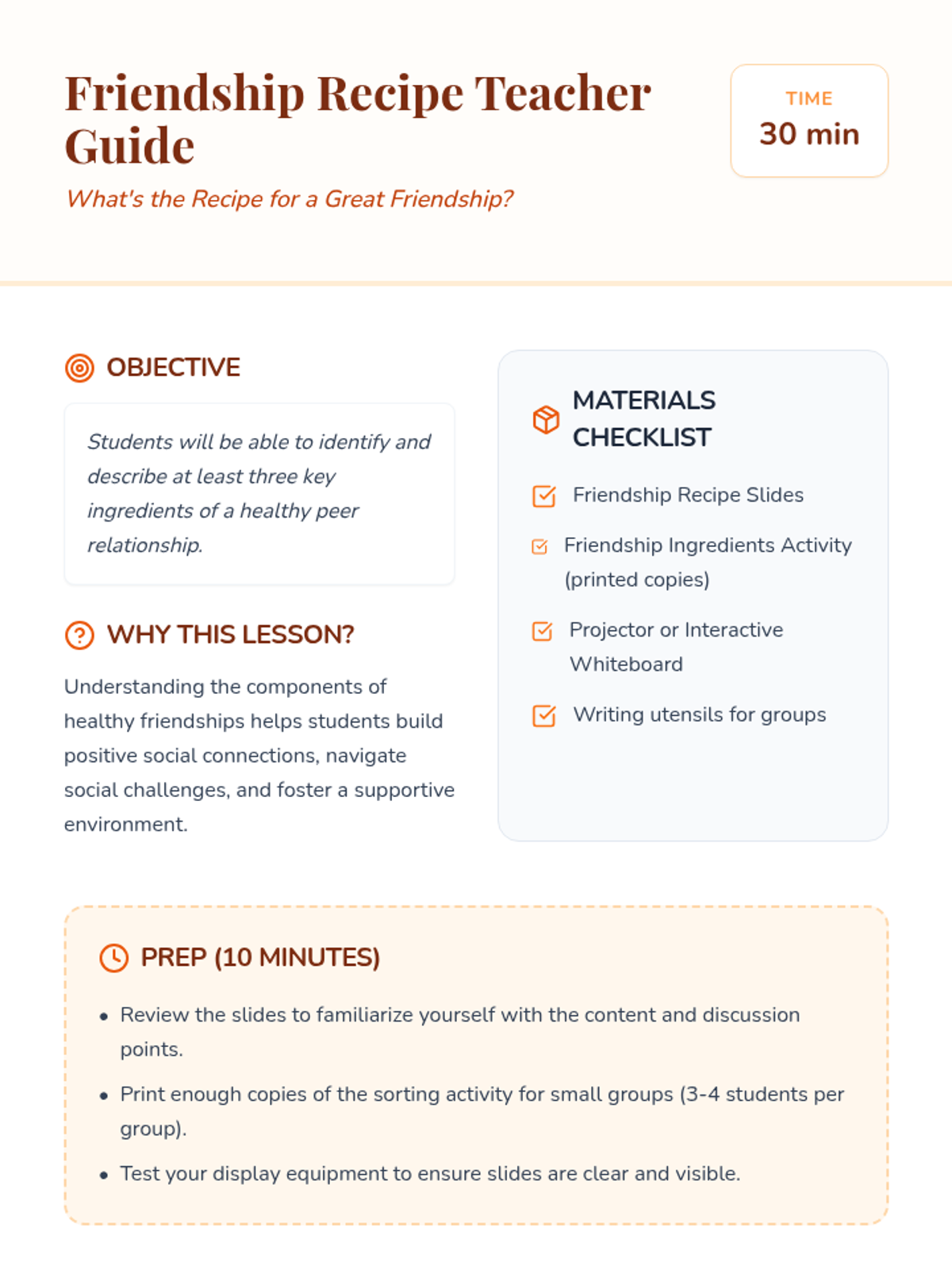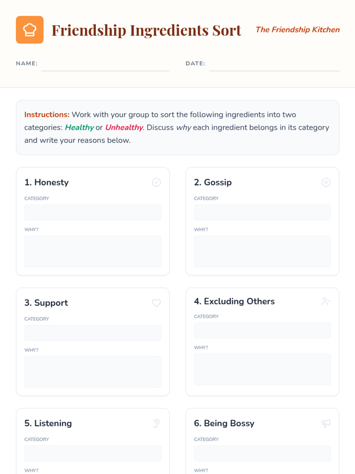 A 30-minute lesson for 6th-grade students to identify key ingredients for healthy peer relationships using a recipe analogy. Students will distinguish between healthy and unhealthy traits through discussion and a hands-on sorting activity.