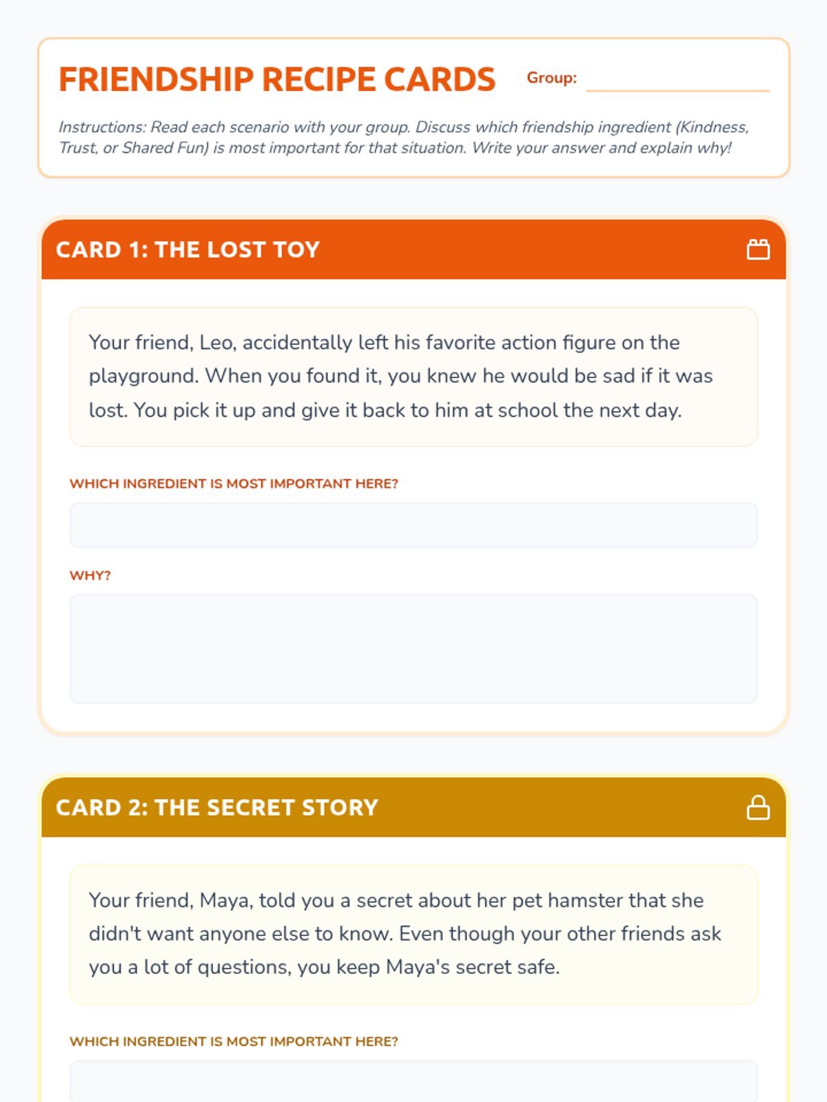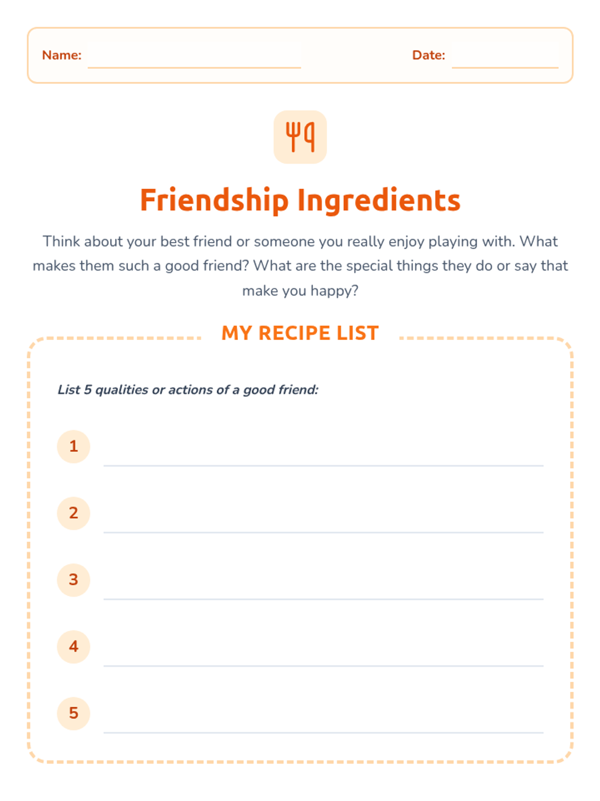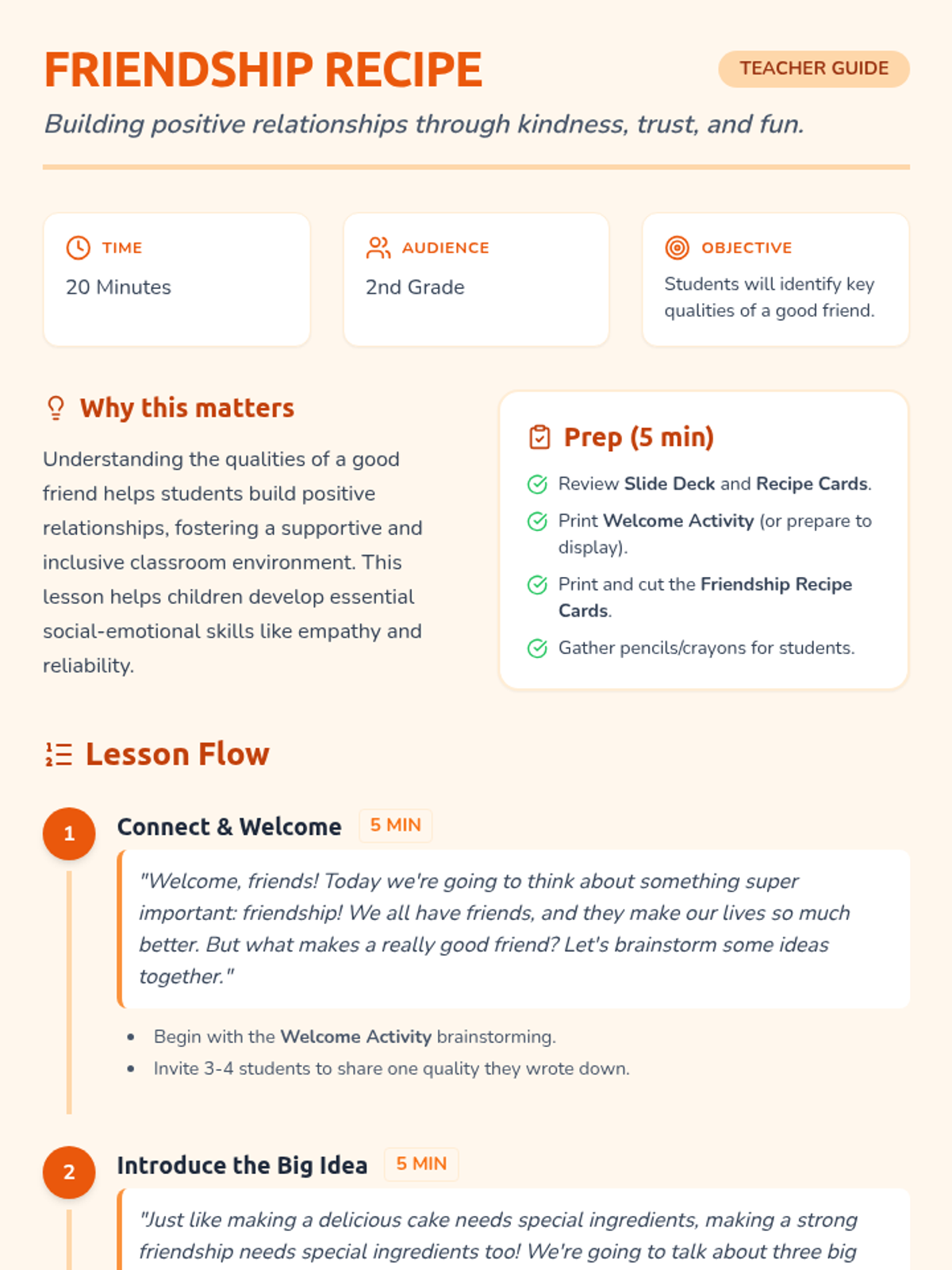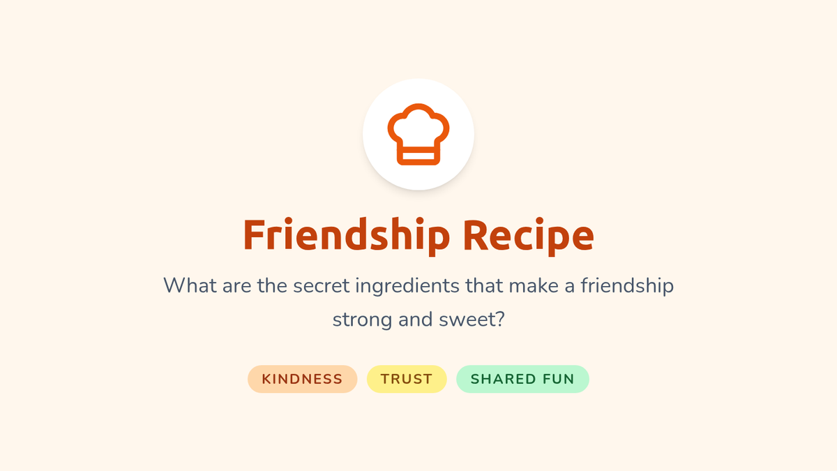 A 20-minute SEL lesson for 2nd graders to identify and discuss key qualities of a good friend using a 'recipe' metaphor, focusing on kindness, trust, and shared fun.