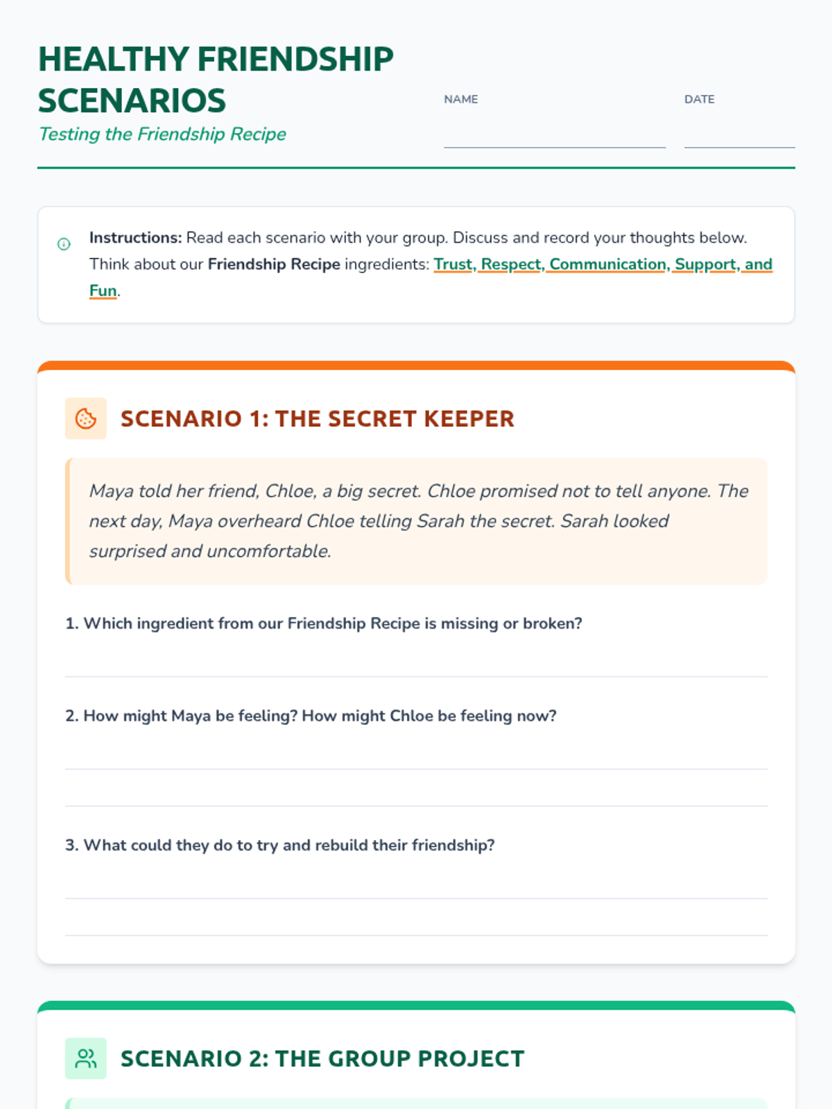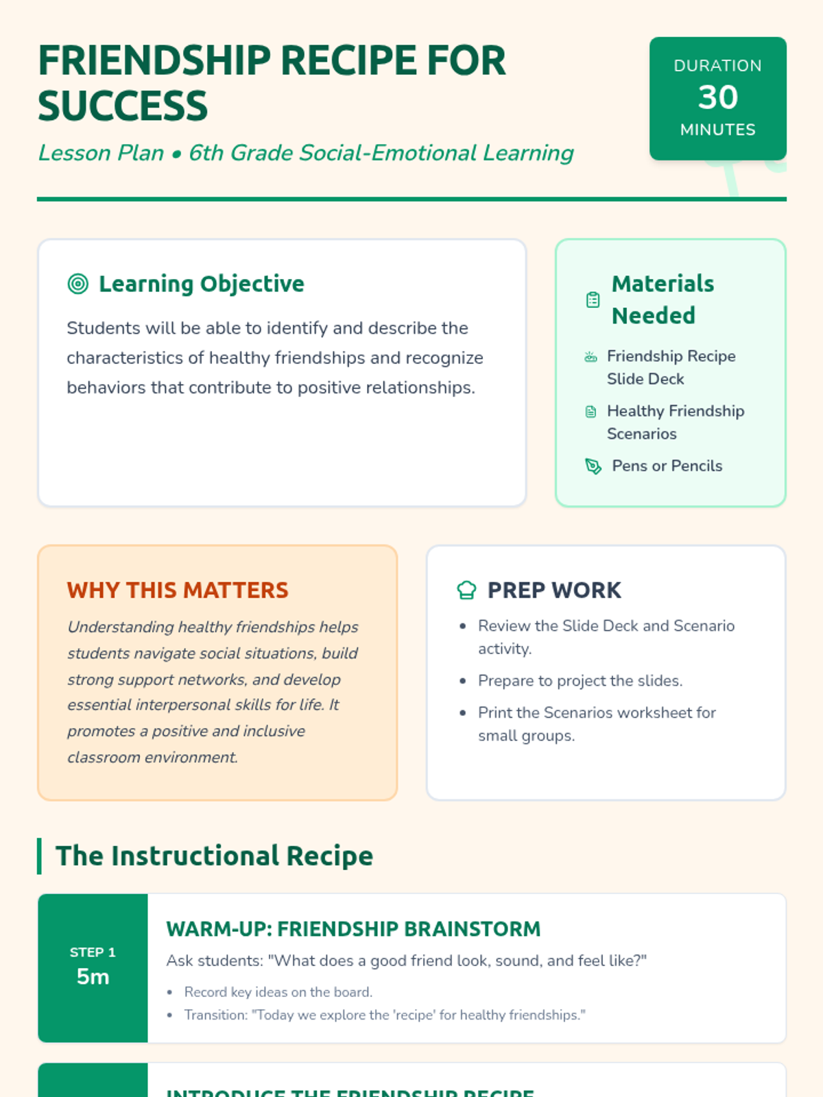 This lesson helps 6th-grade students understand the key ingredients of healthy friendships and identify what makes a good friend. It's a foundational lesson for building positive social relationships. Audience: 6th Grade. Duration: 30 minutes. Sessions: 1.