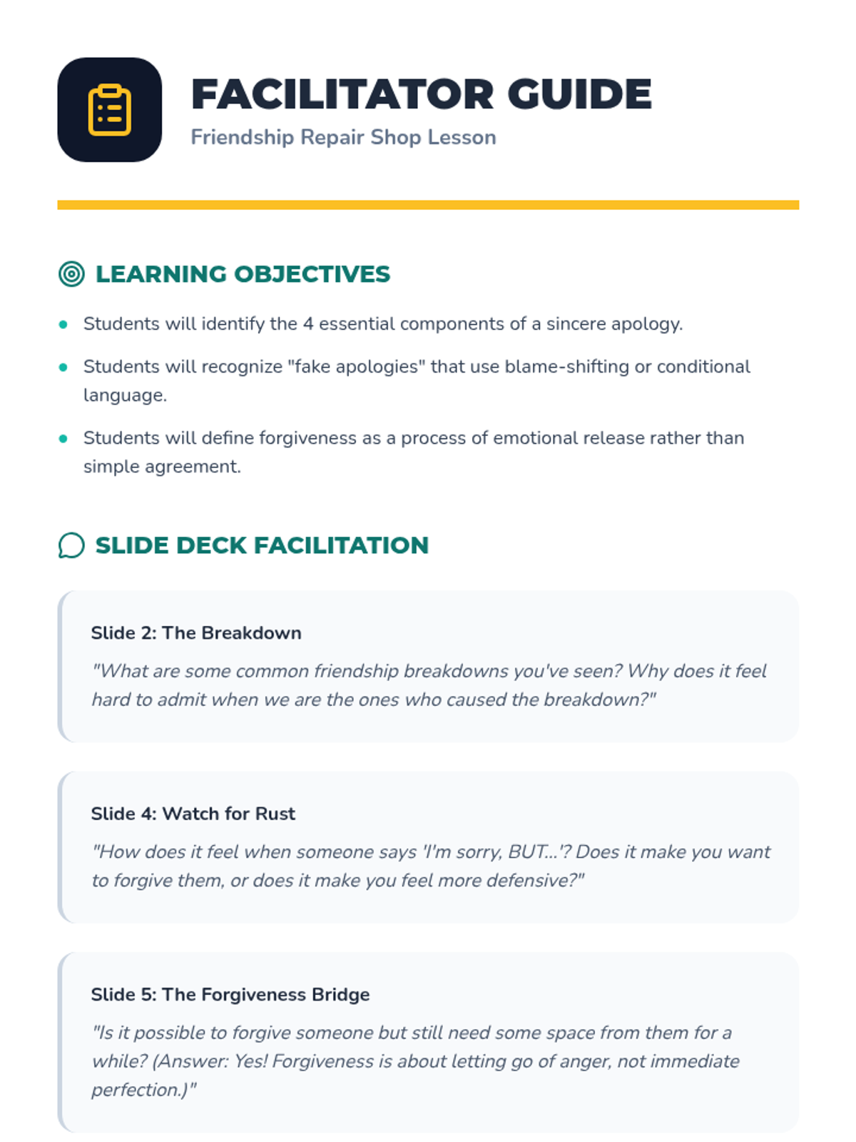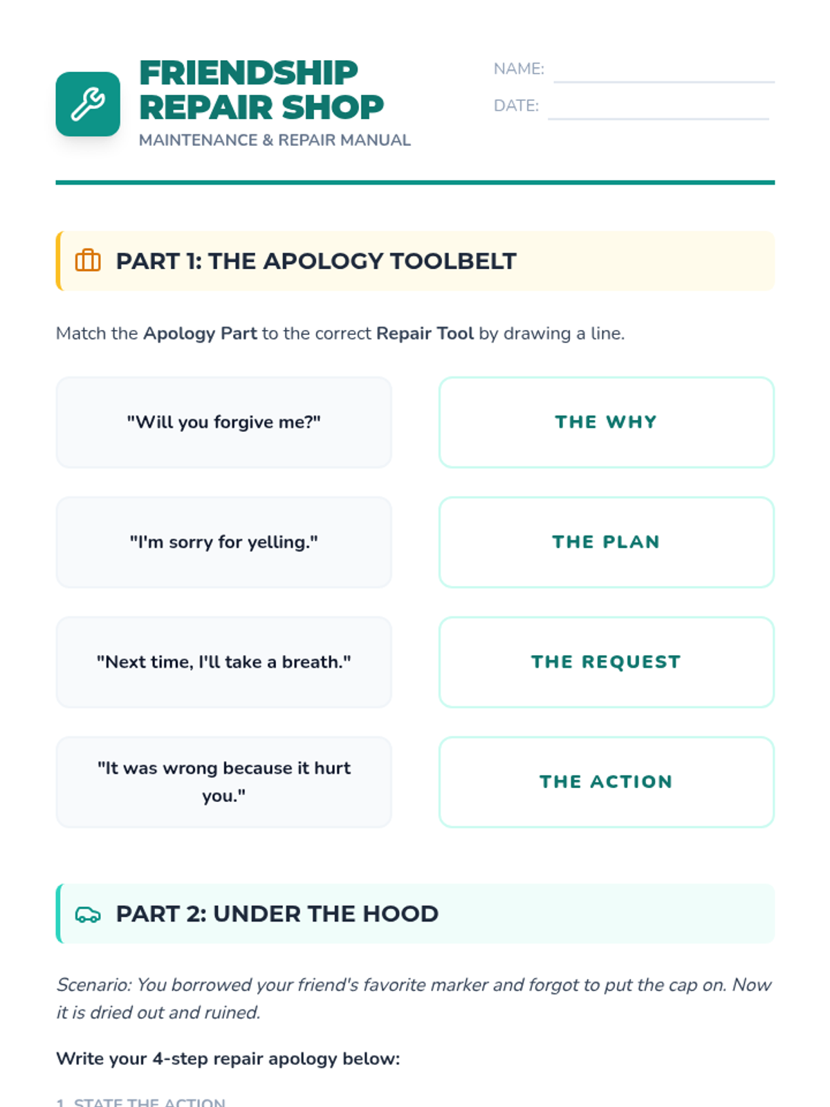 A lesson focused on teaching 4th graders how to navigate peer conflict by using a four-step apology and understanding the process of forgiveness through a 'Friendship Repair Shop' theme.