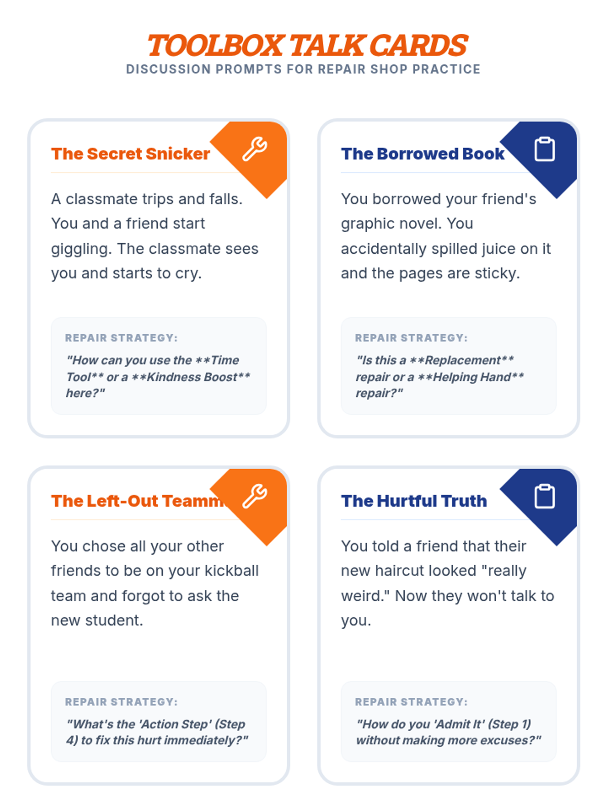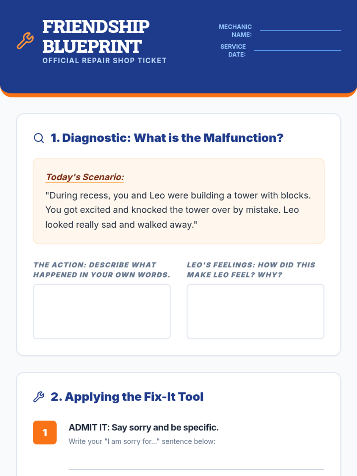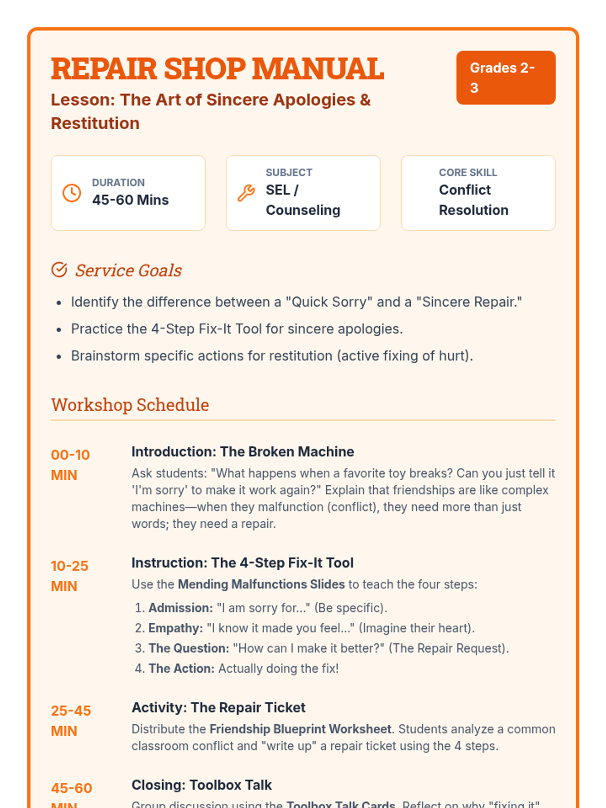 A social-emotional learning lesson for 2nd and 3rd graders focused on sincere apologies and active restitution. Students learn to identify friendship 'malfunctions' and use specific tools to mend relationships and fix the hurt.
