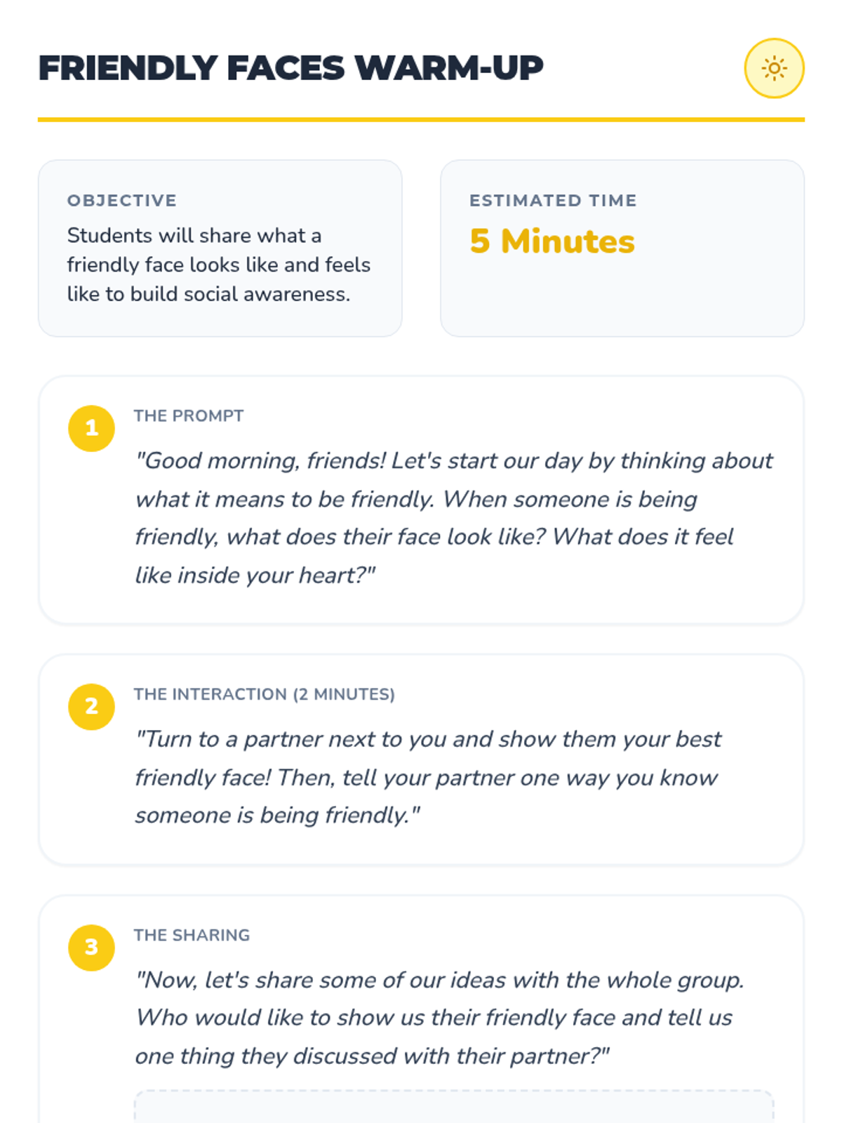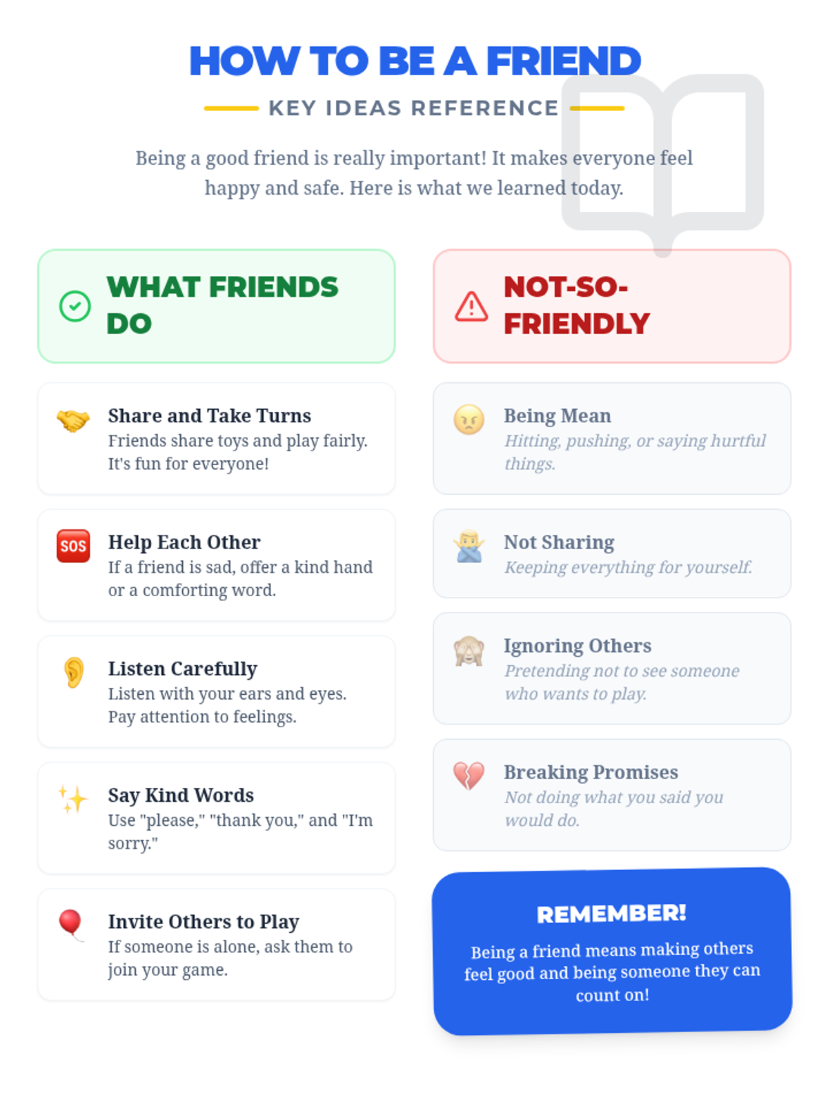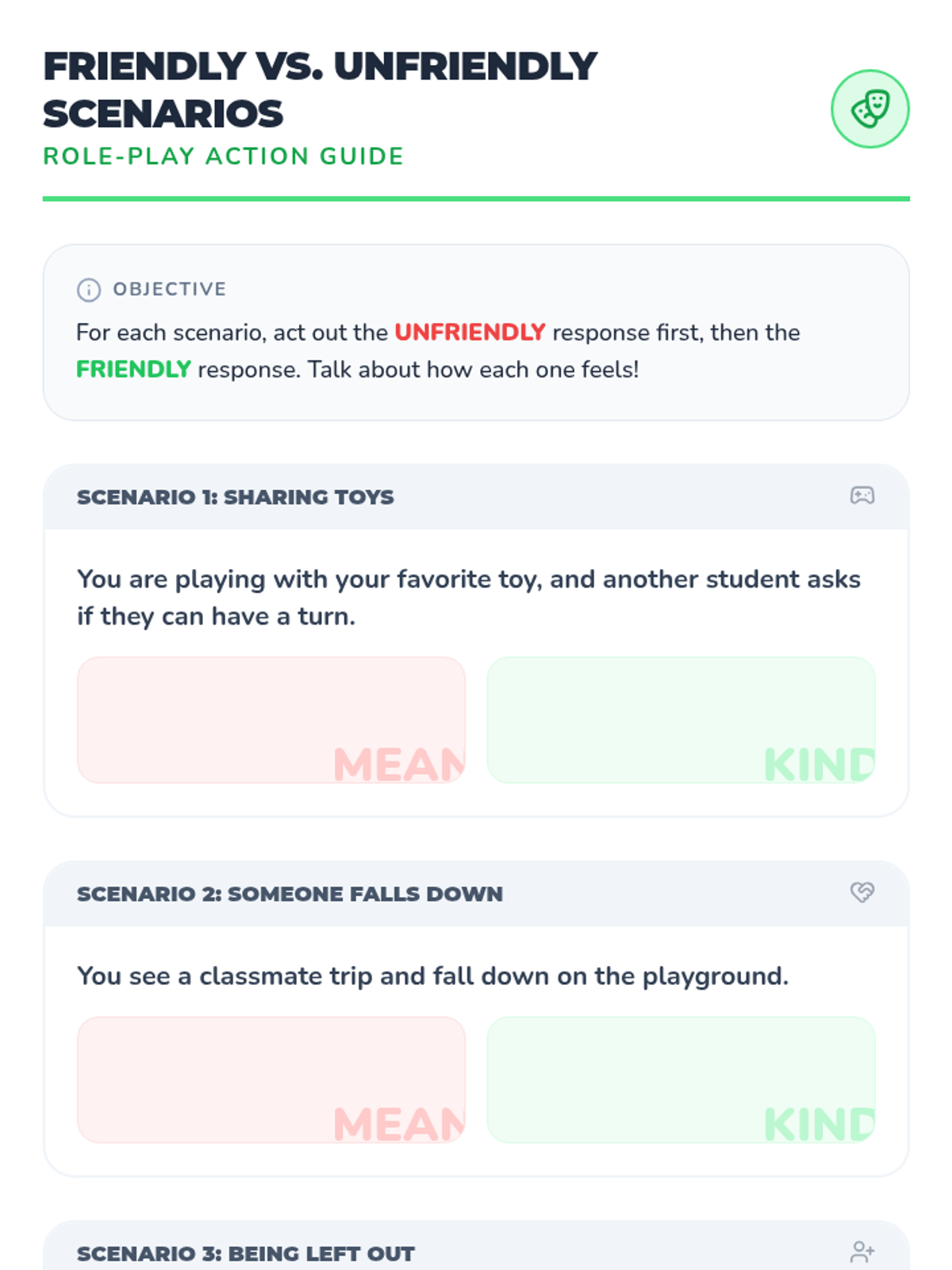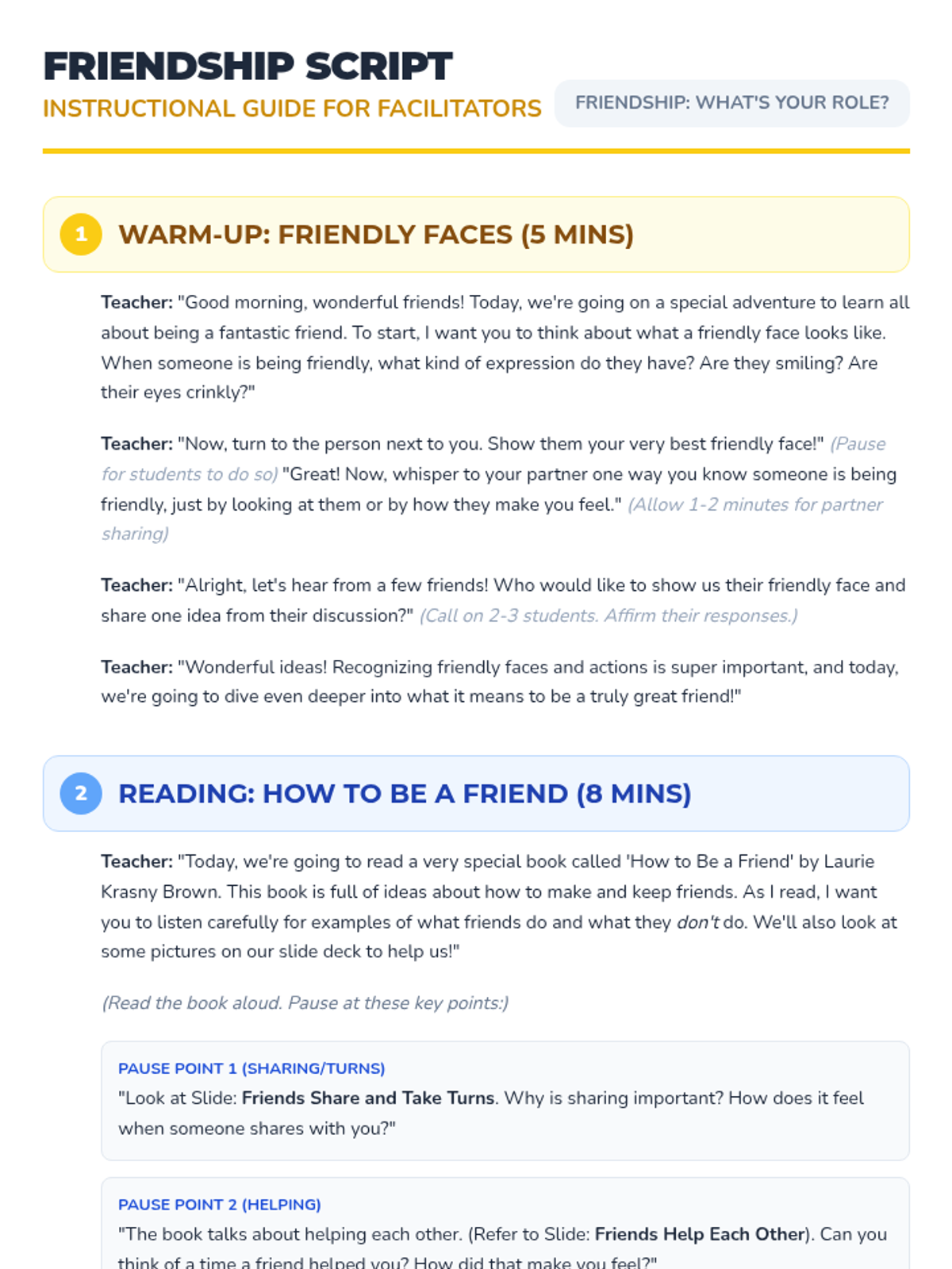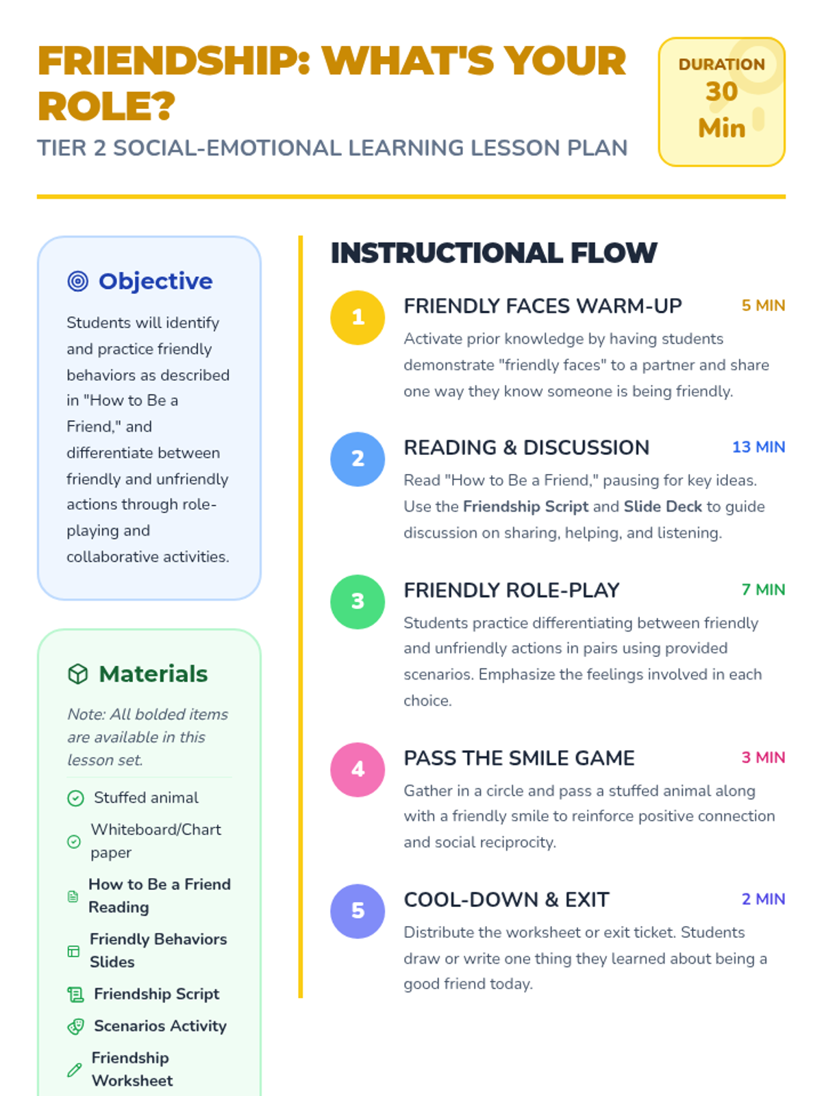 A 30-minute Tier 2 lesson for Kindergarten and 1st-grade students focused on identifying and practicing friendly behaviors through reading, role-play, and interactive games.
