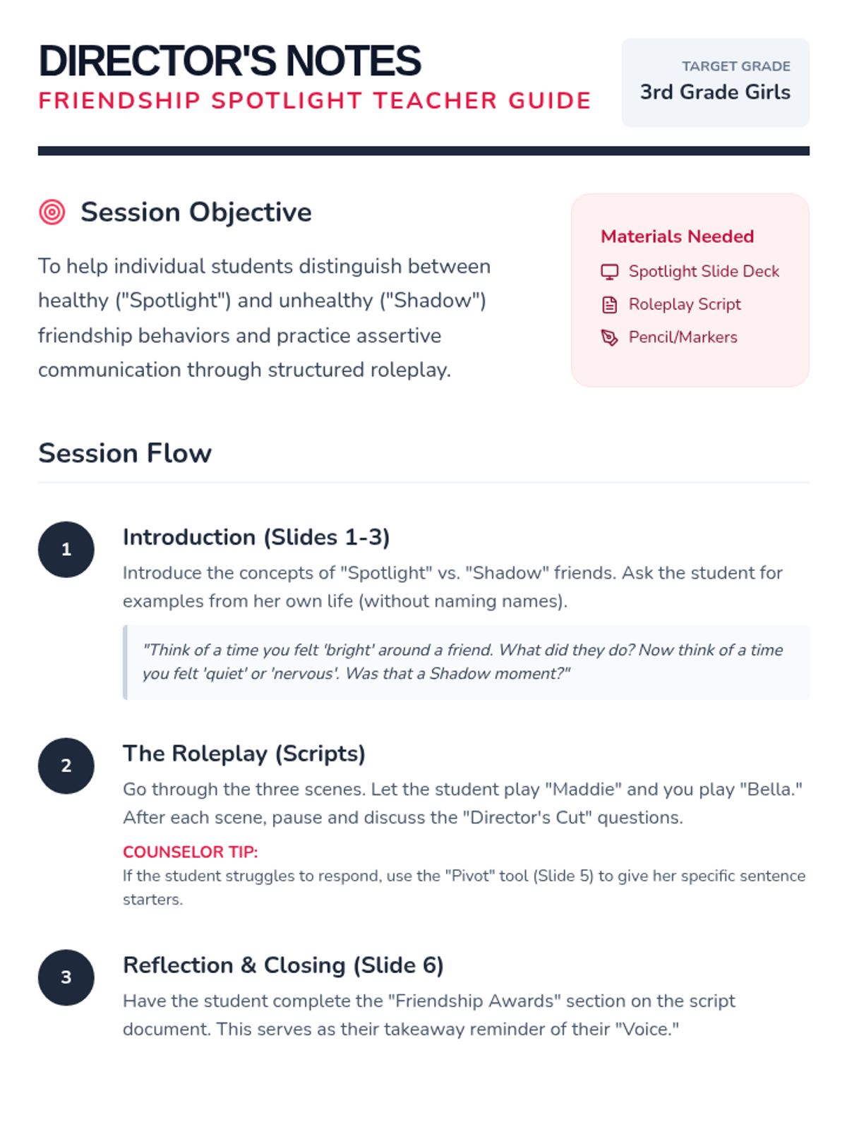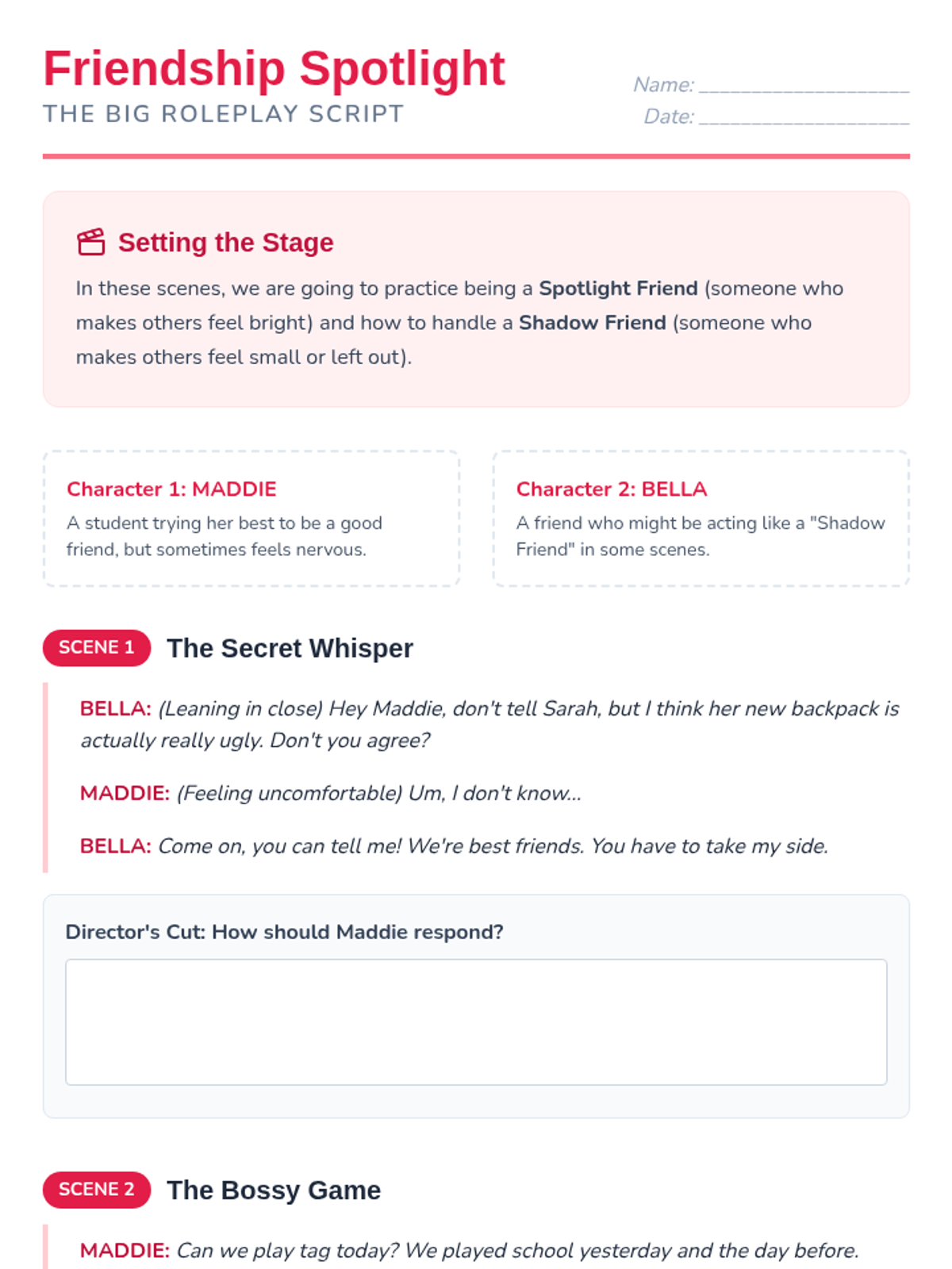 An individual social-emotional learning session for 3rd-grade girls focused on identifying and practicing healthy friendship behaviors through roleplay and script-based scenarios.