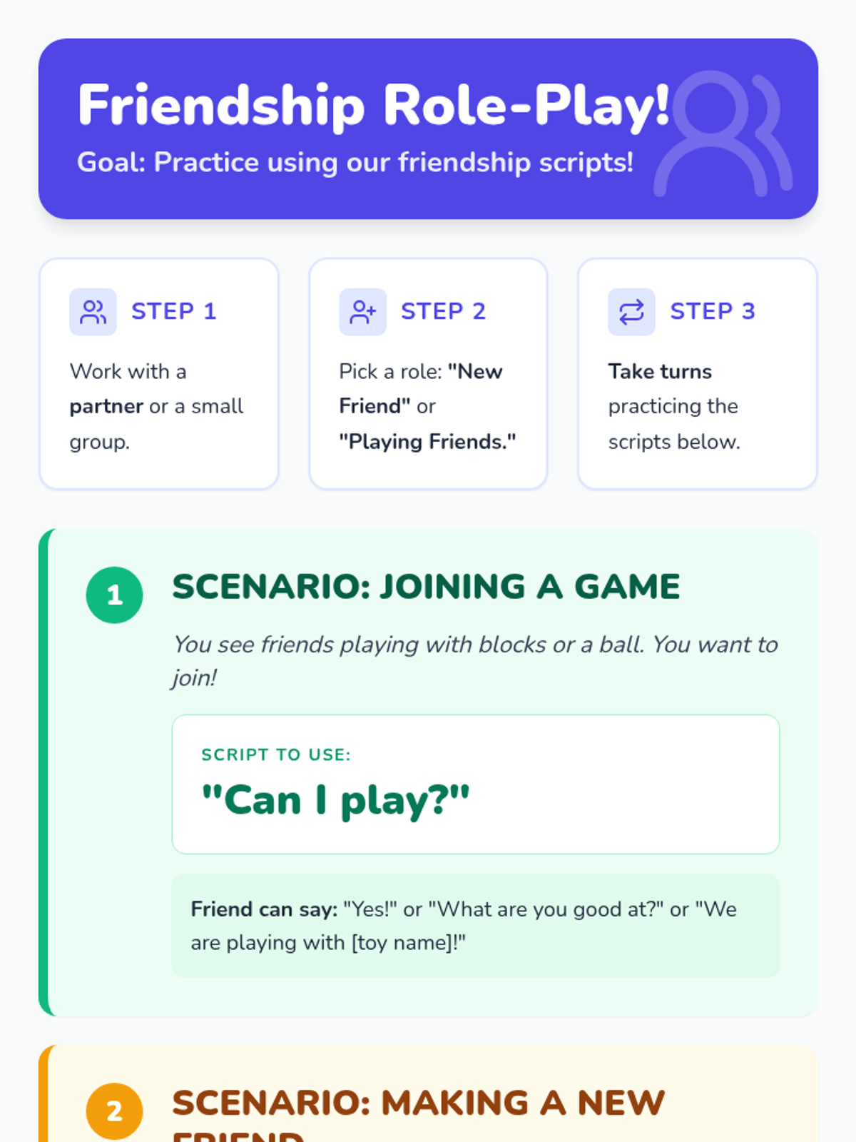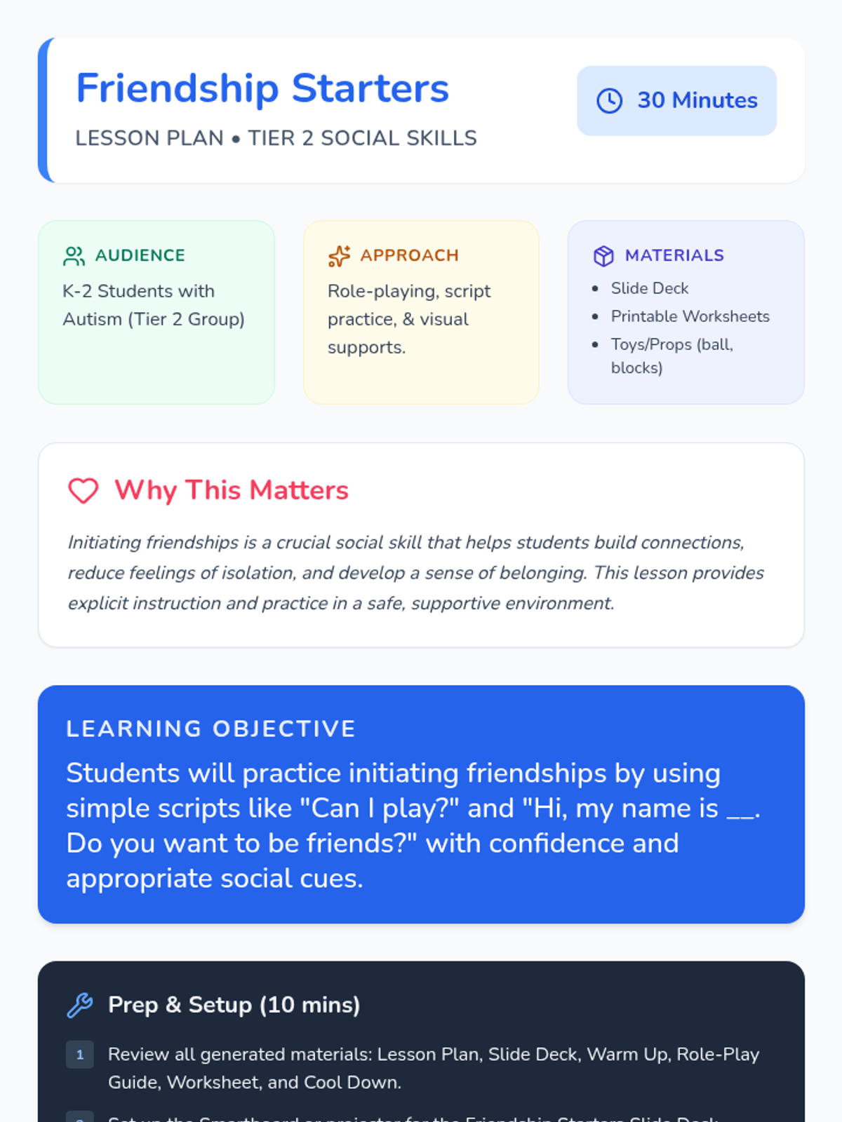 A Tier 2 social skills lesson for K-2 students with autism focusing on initiating play and introducing oneself using simple social scripts.