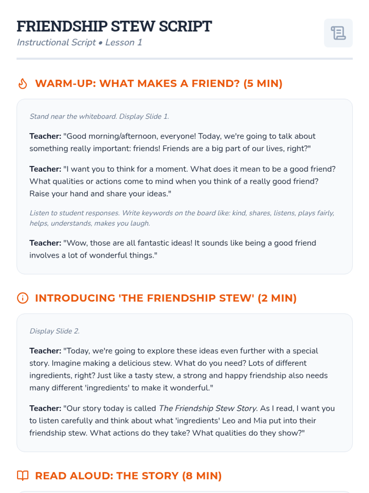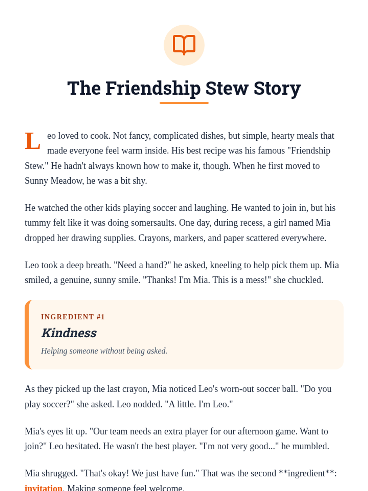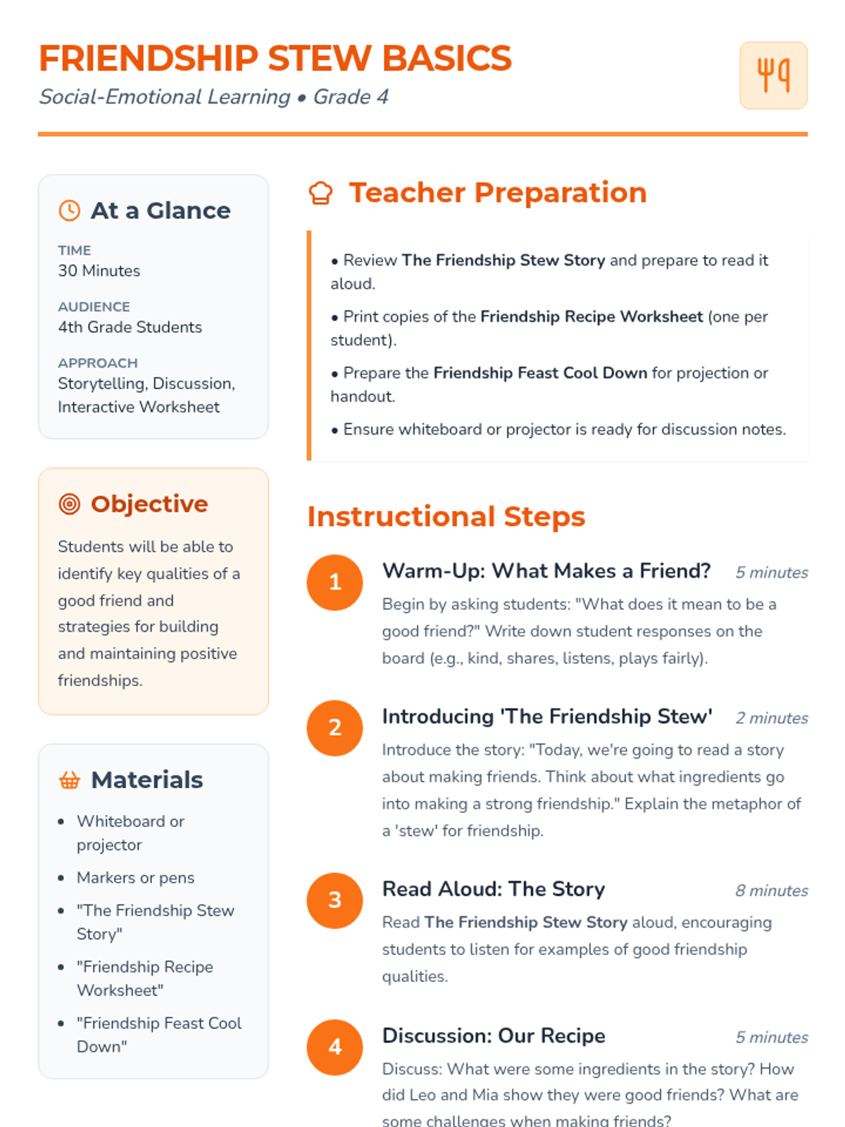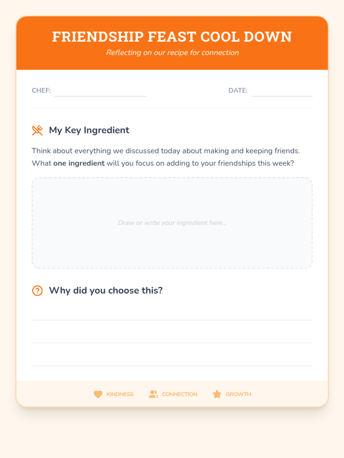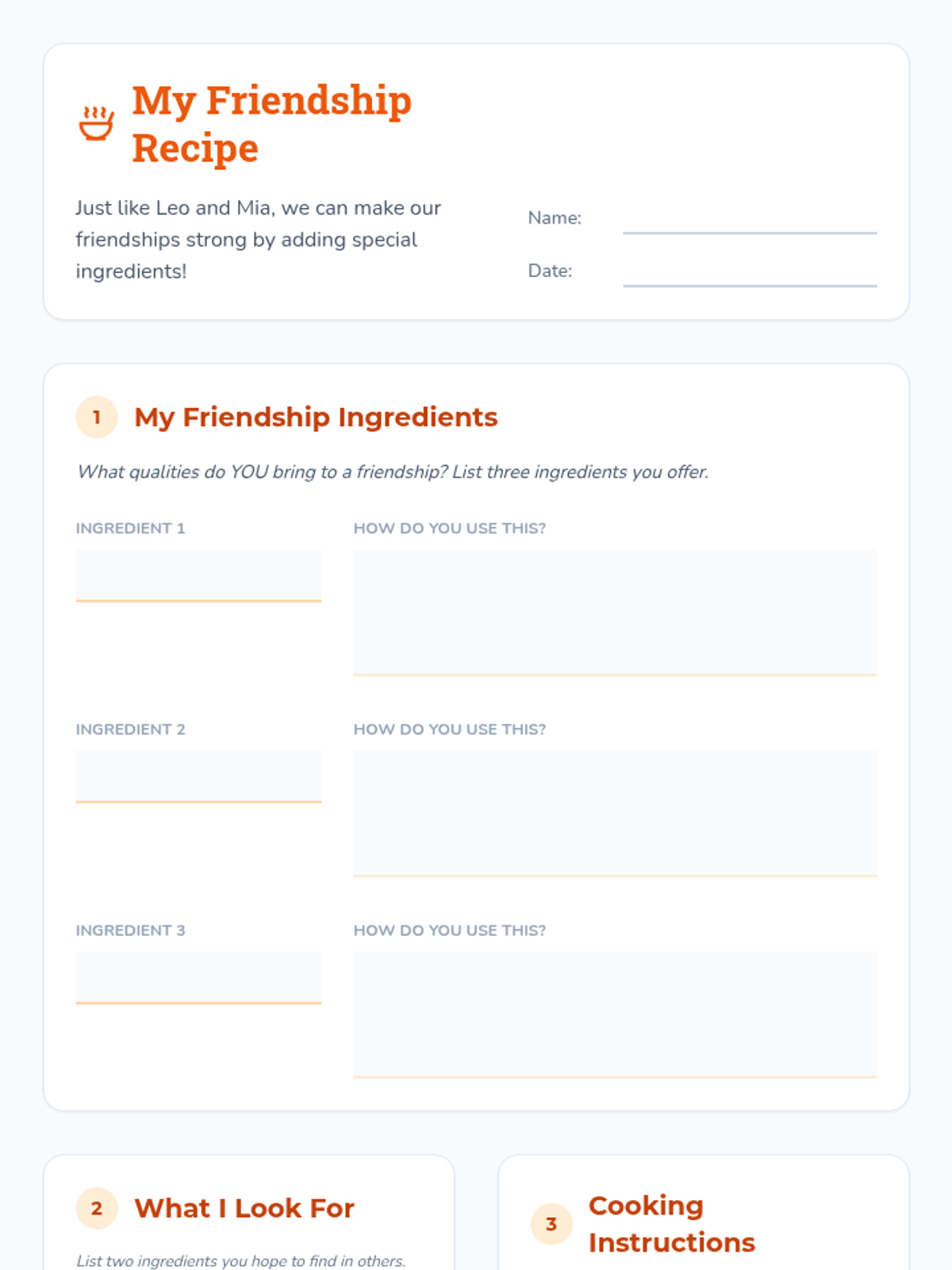 Students explore the qualities of a good friend through a story and create their own 'Friendship Recipe' identifying what they offer and look for in connections.