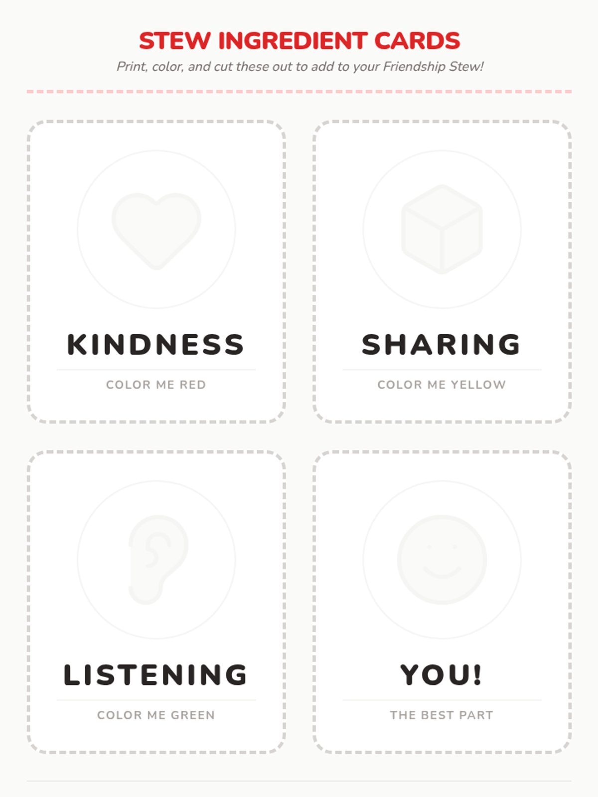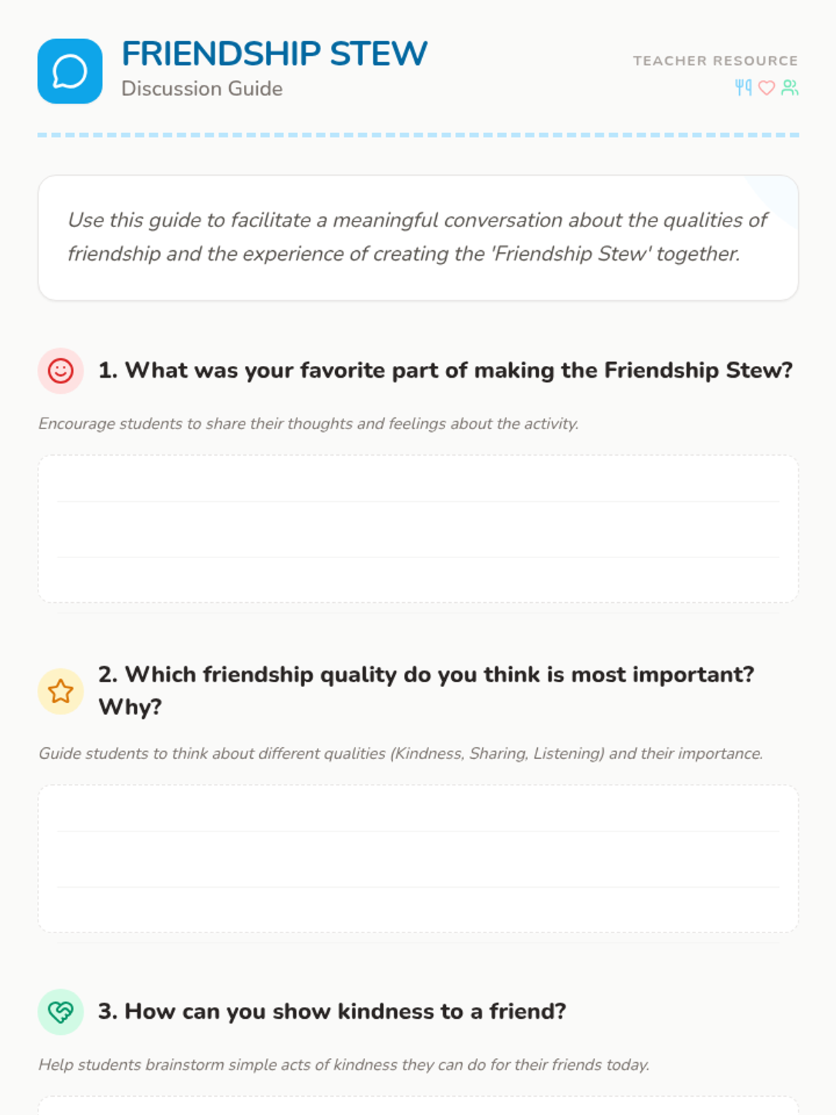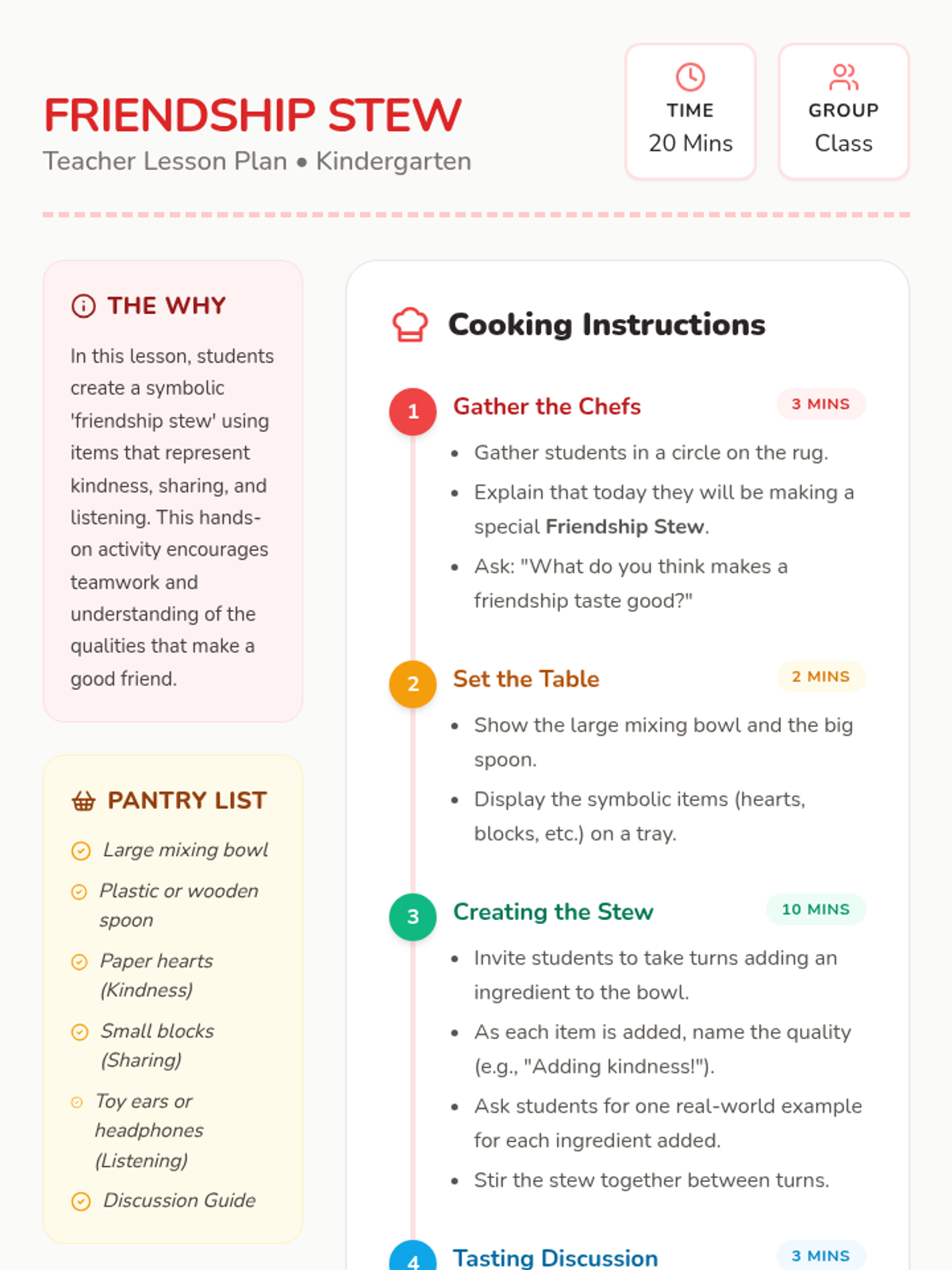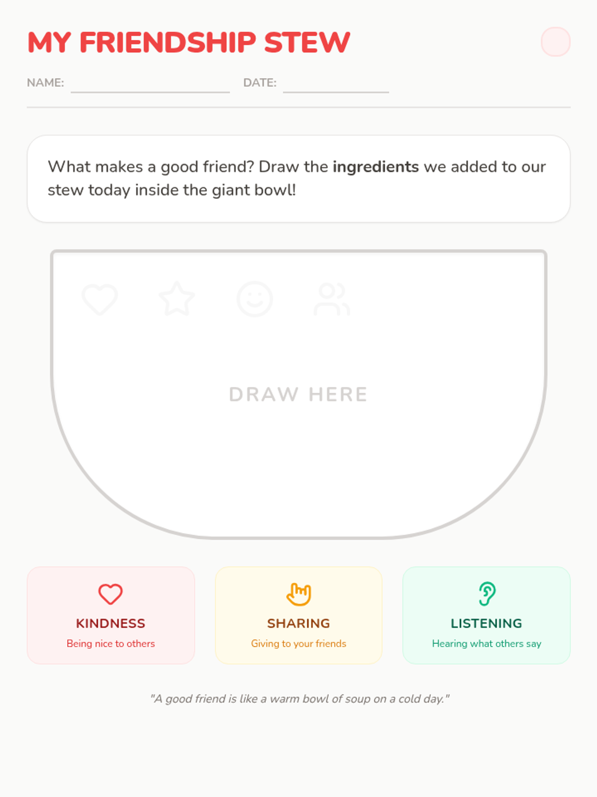 Students create a symbolic 'friendship stew' to explore qualities like kindness, sharing, and listening. Through this hands-on activity, they develop social-emotional skills and understand the importance of empathy in building strong friendships.