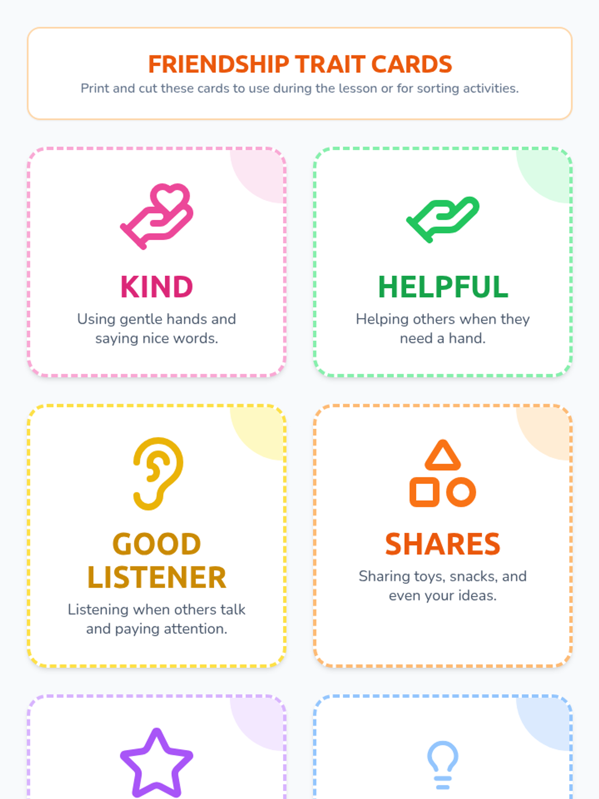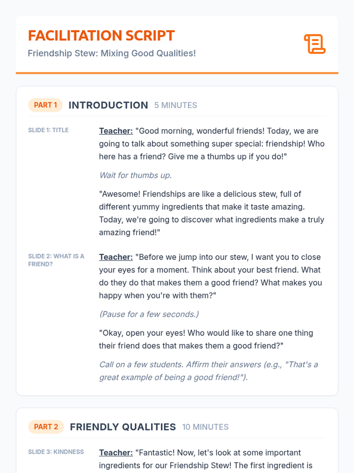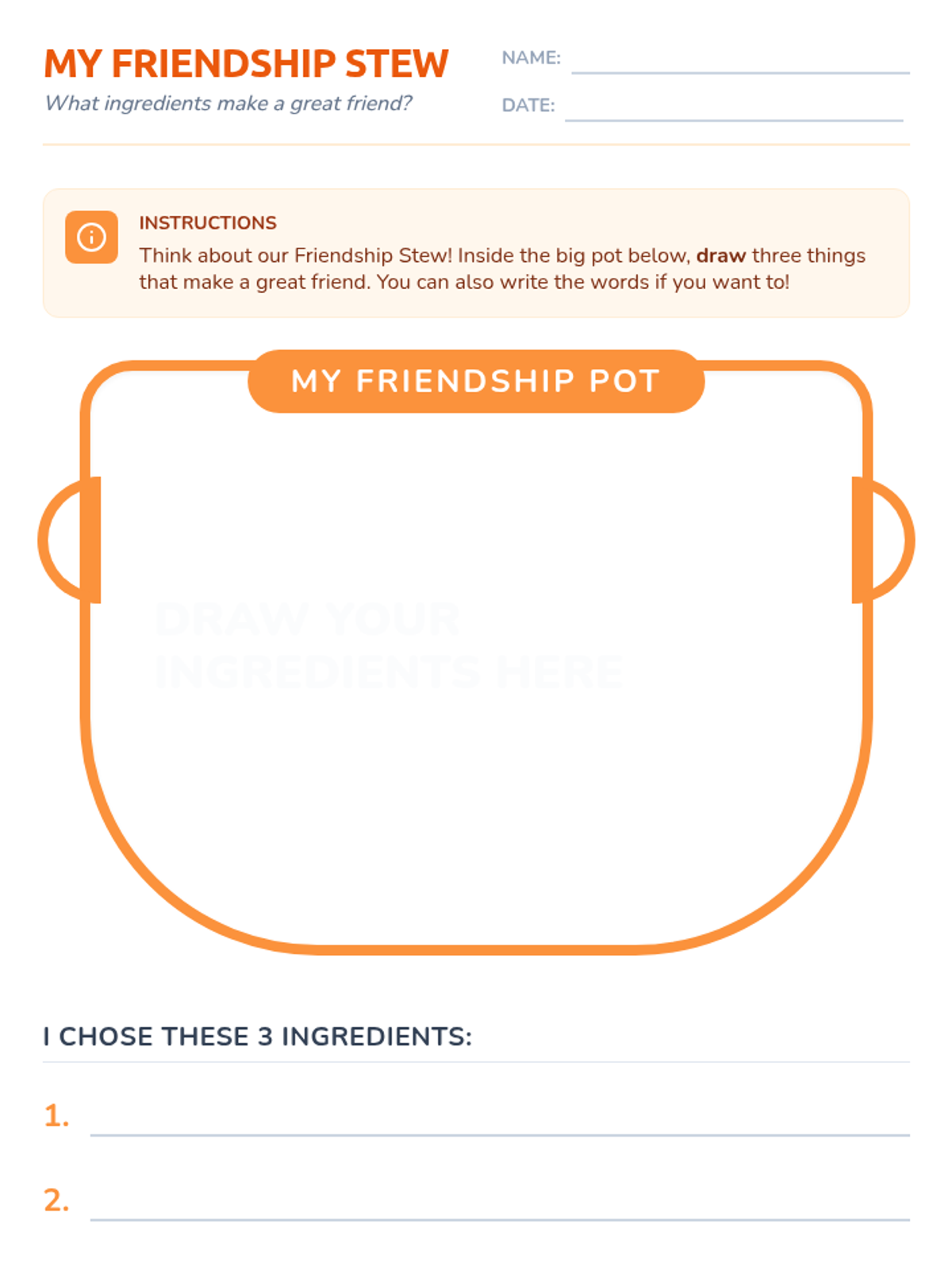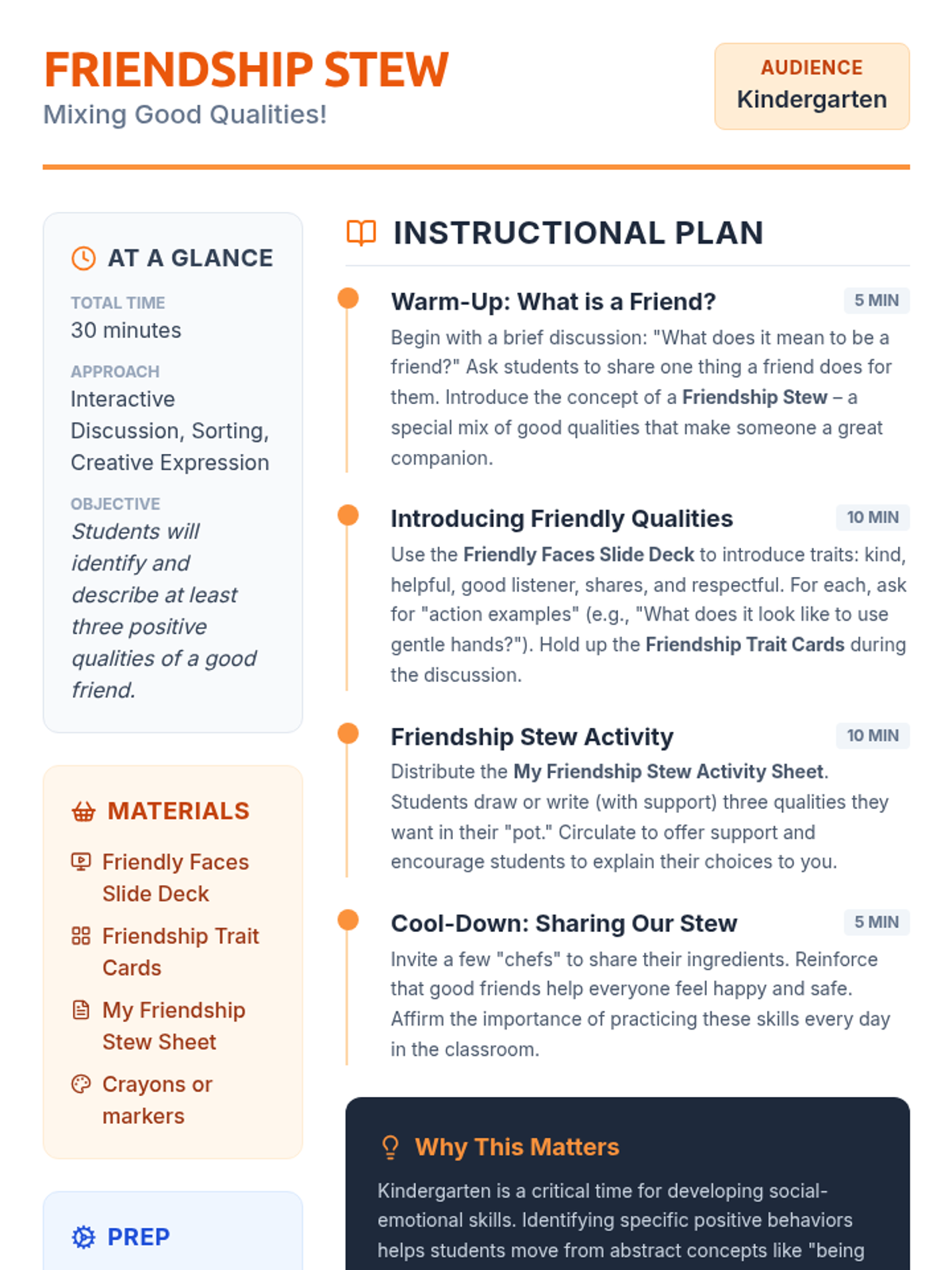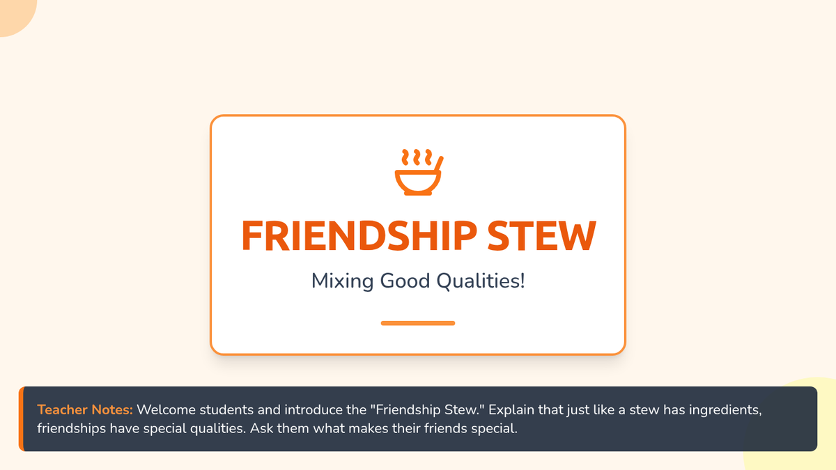 A 30-minute Kindergarten lesson where students identify and understand the positive qualities that make a good friend through the metaphor of a 'Friendship Stew.' Students explore traits like kindness, sharing, and listening.