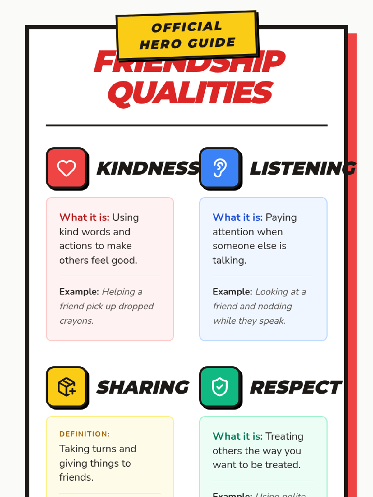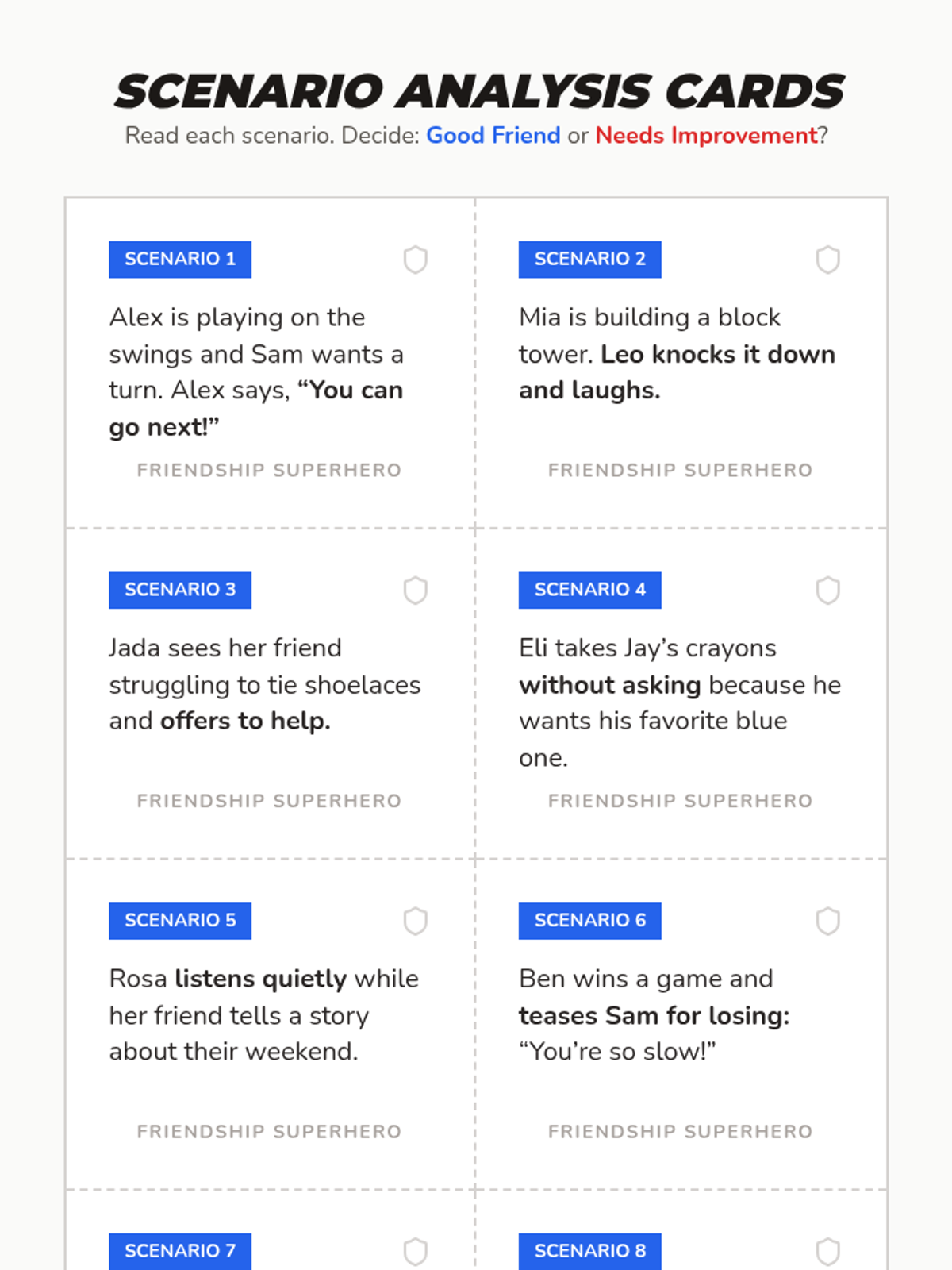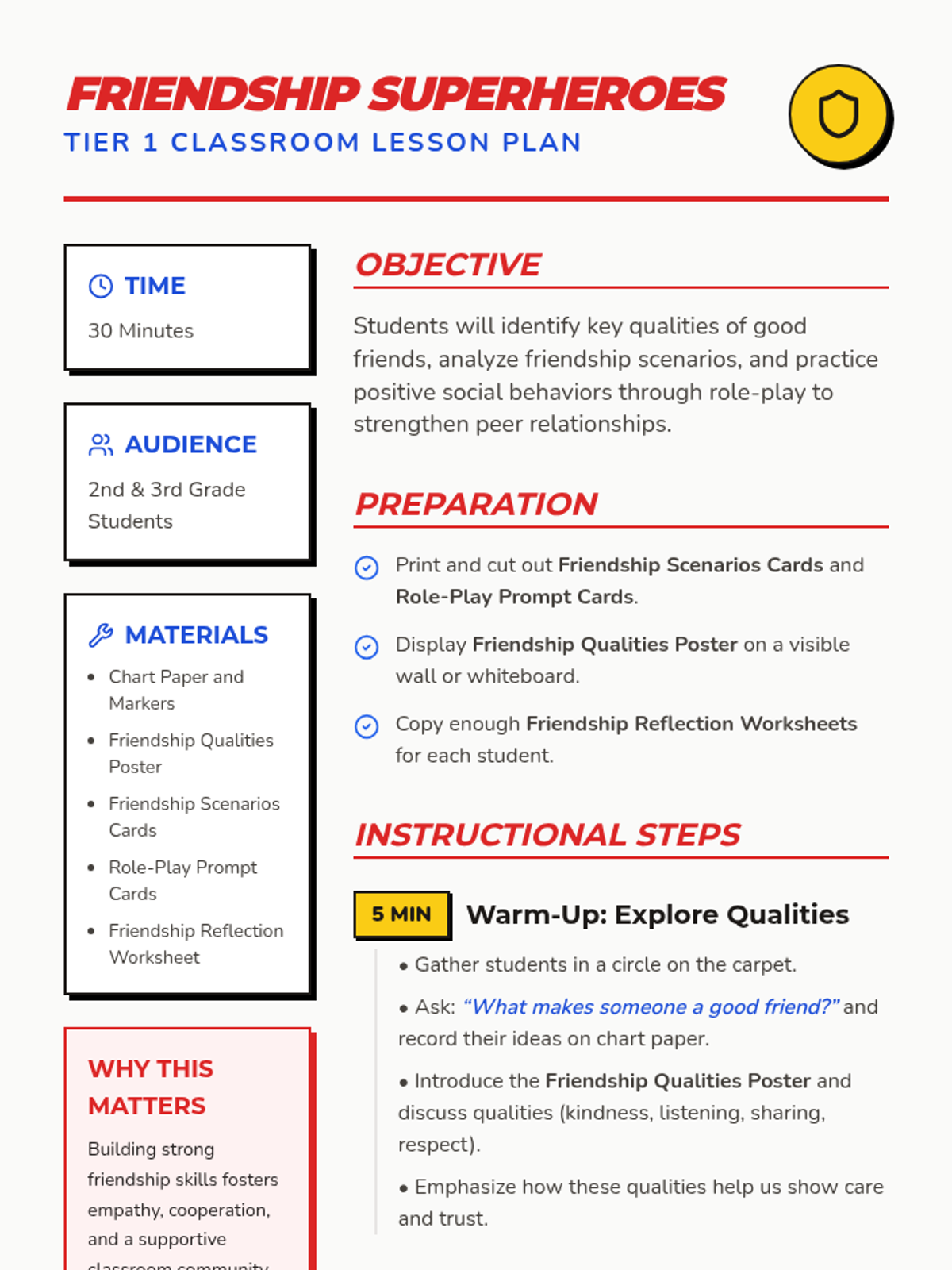 In this 30-minute, one-session lesson, 2nd and 3rd graders will explore what it means to be a good friend by identifying key friendship qualities, analyzing scenarios, and practicing positive social behaviors through role-play. This Tier 1 classroom lesson builds essential social-emotional skills, fosters empathy, and helps students create a supportive classroom community.