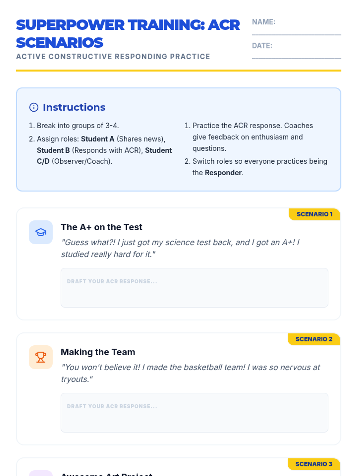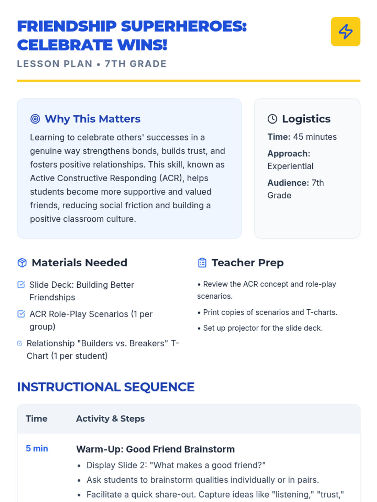 This 45-minute lesson for 7th graders teaches students how to use 'Active Constructive Responding' (ACR) to celebrate their friends' good news. Students will engage in role-play and reflective activities to build supportive relationship skills.
