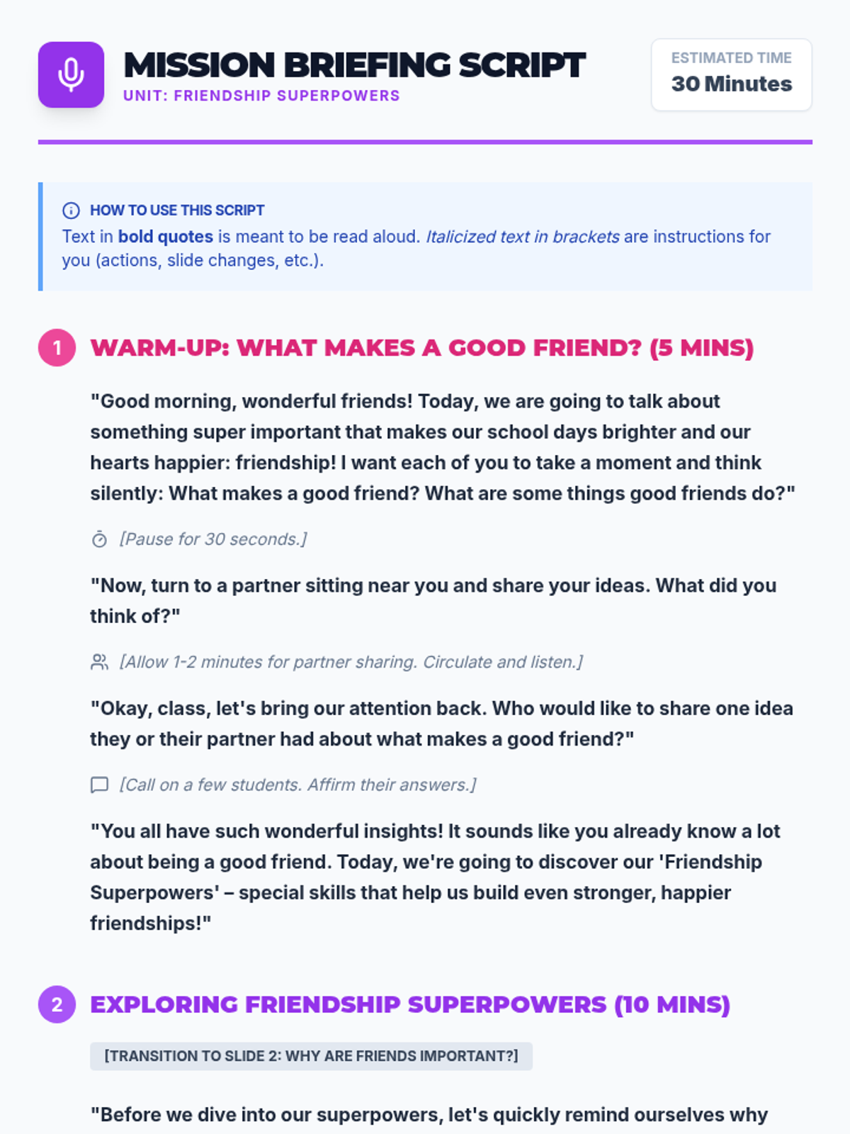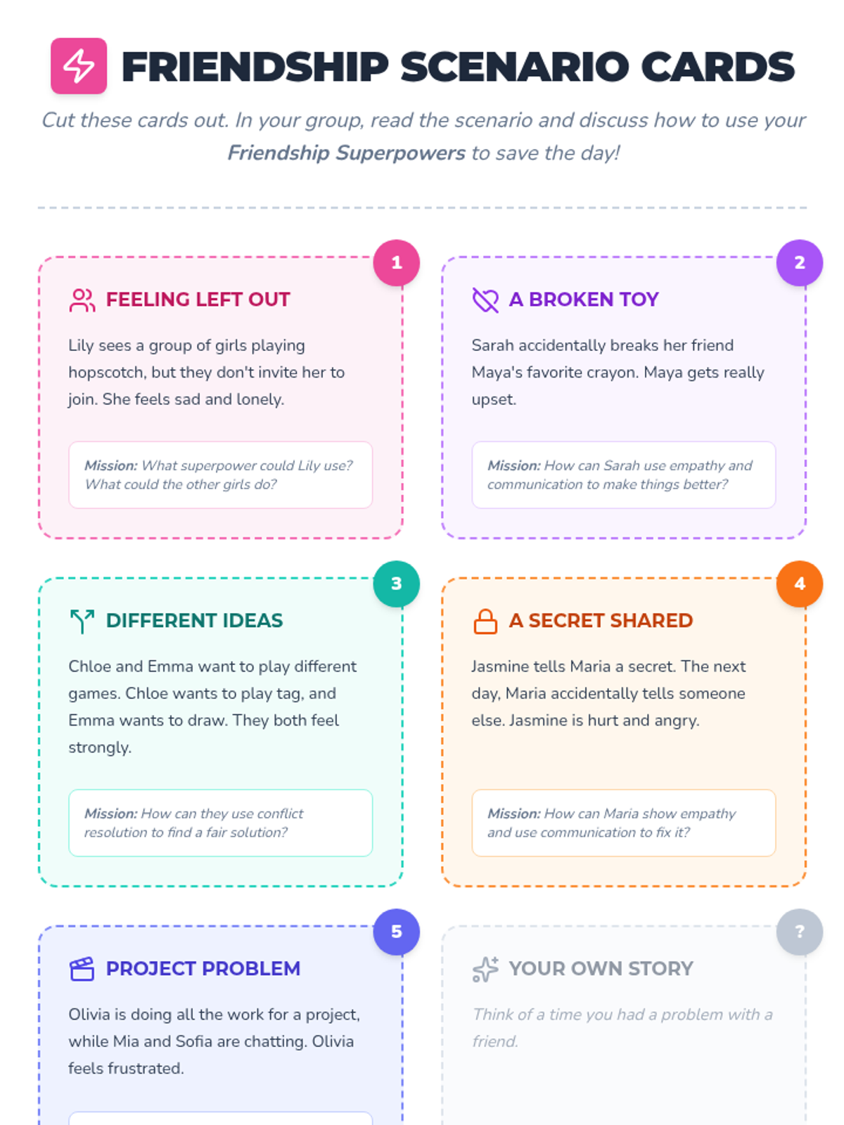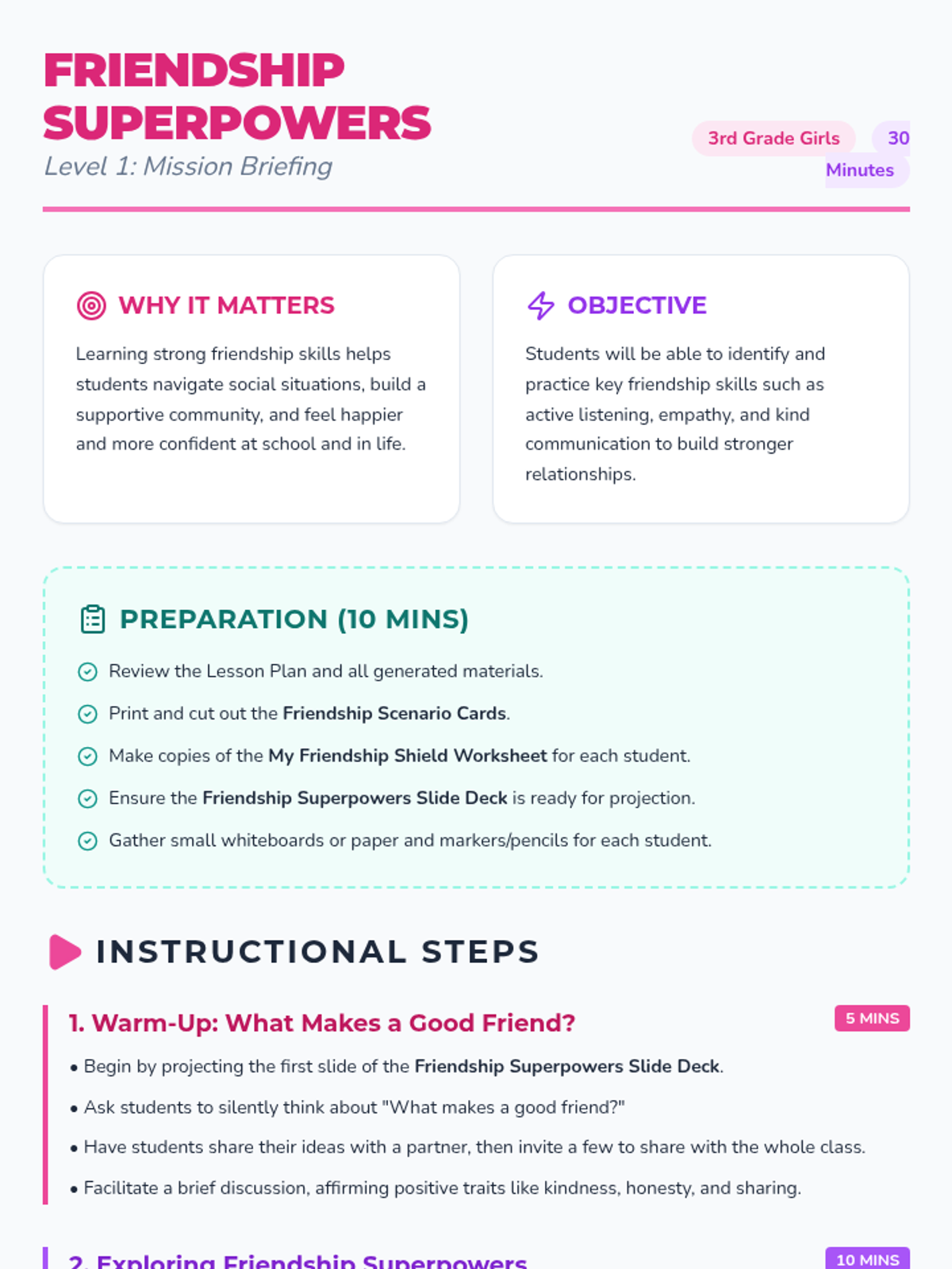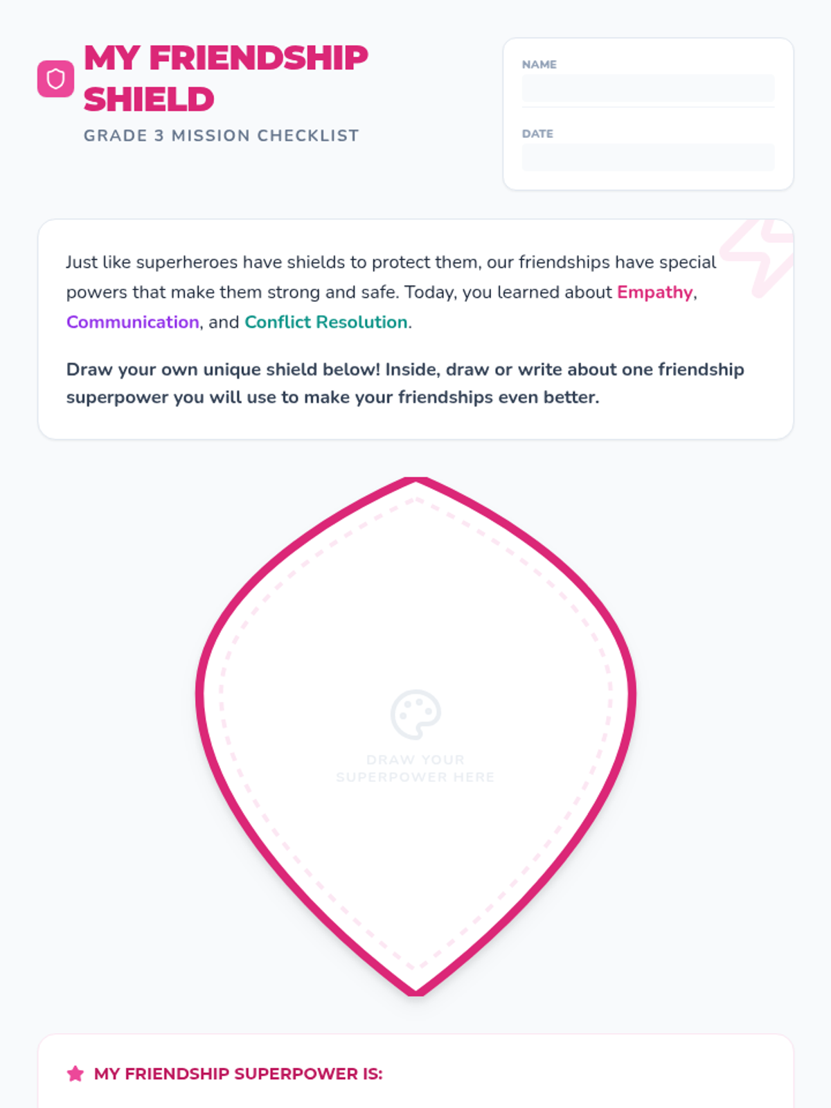 This lesson teaches 3rd-grade girls essential friendship skills, focusing on empathy, communication, and conflict resolution through a 'superpower' theme. Students engage in interactive discussions, scenario practice, and a reflective shield-building activity.