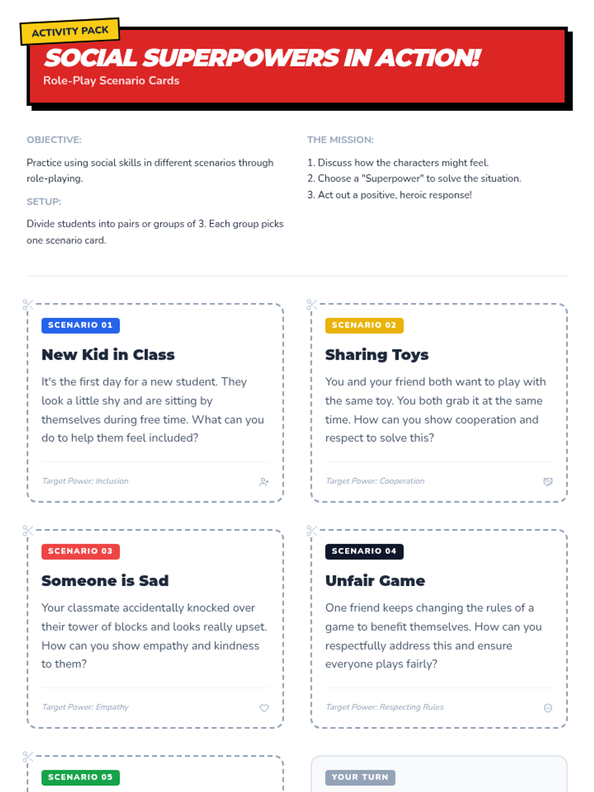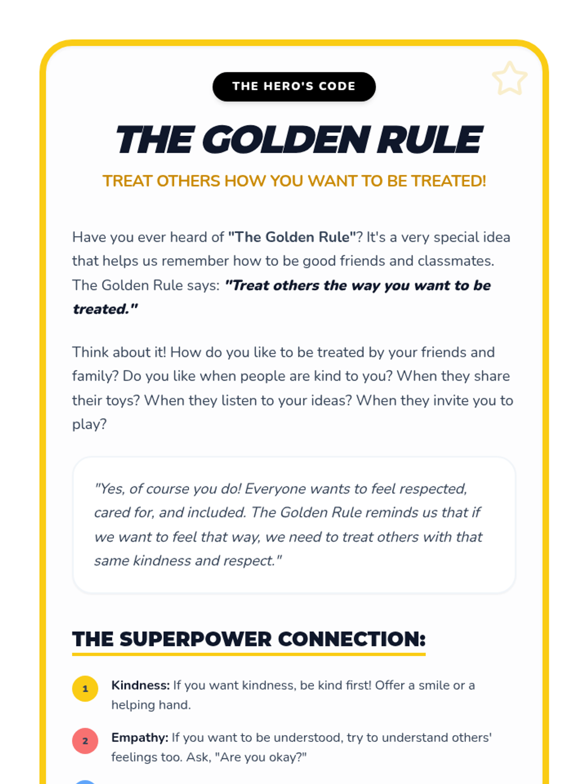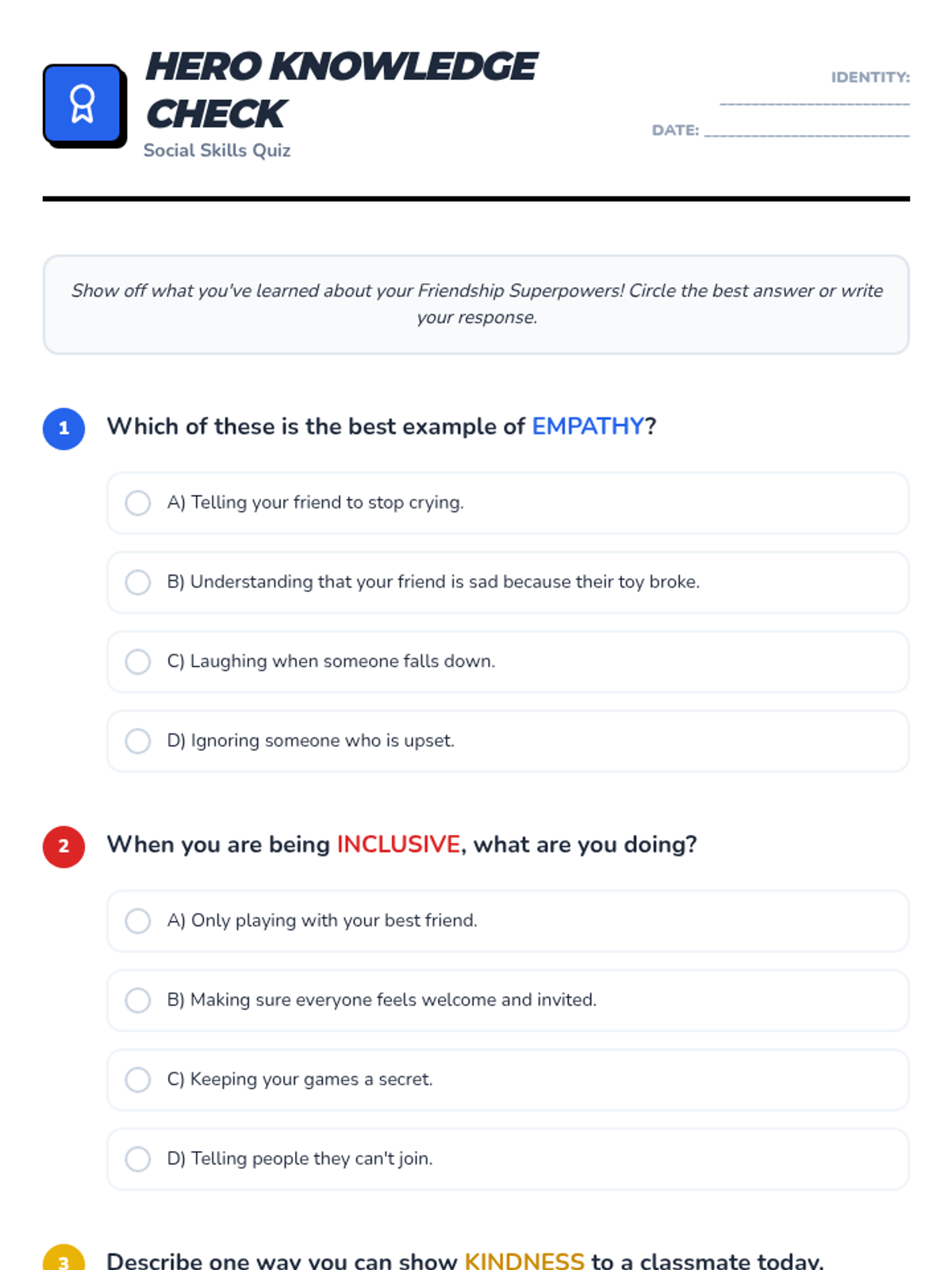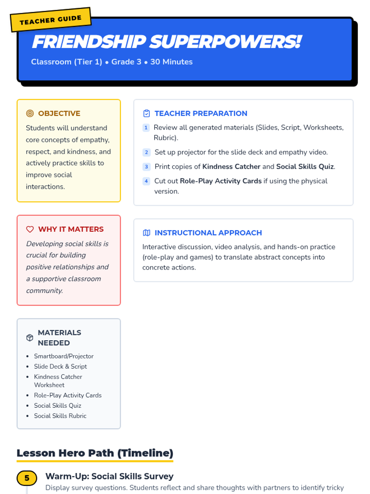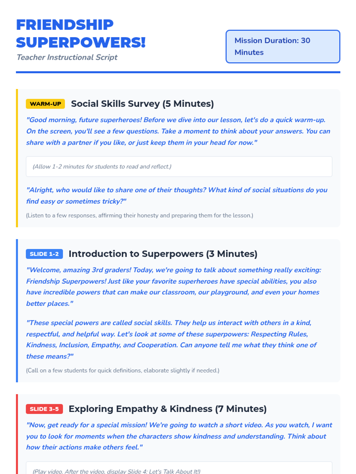 This 30-minute lesson for 3rd graders helps students understand and practice essential social skills like empathy, respect, and kindness through a fun 'superhero' theme. Students explore social superpowers to improve peer interactions and build a supportive classroom community.