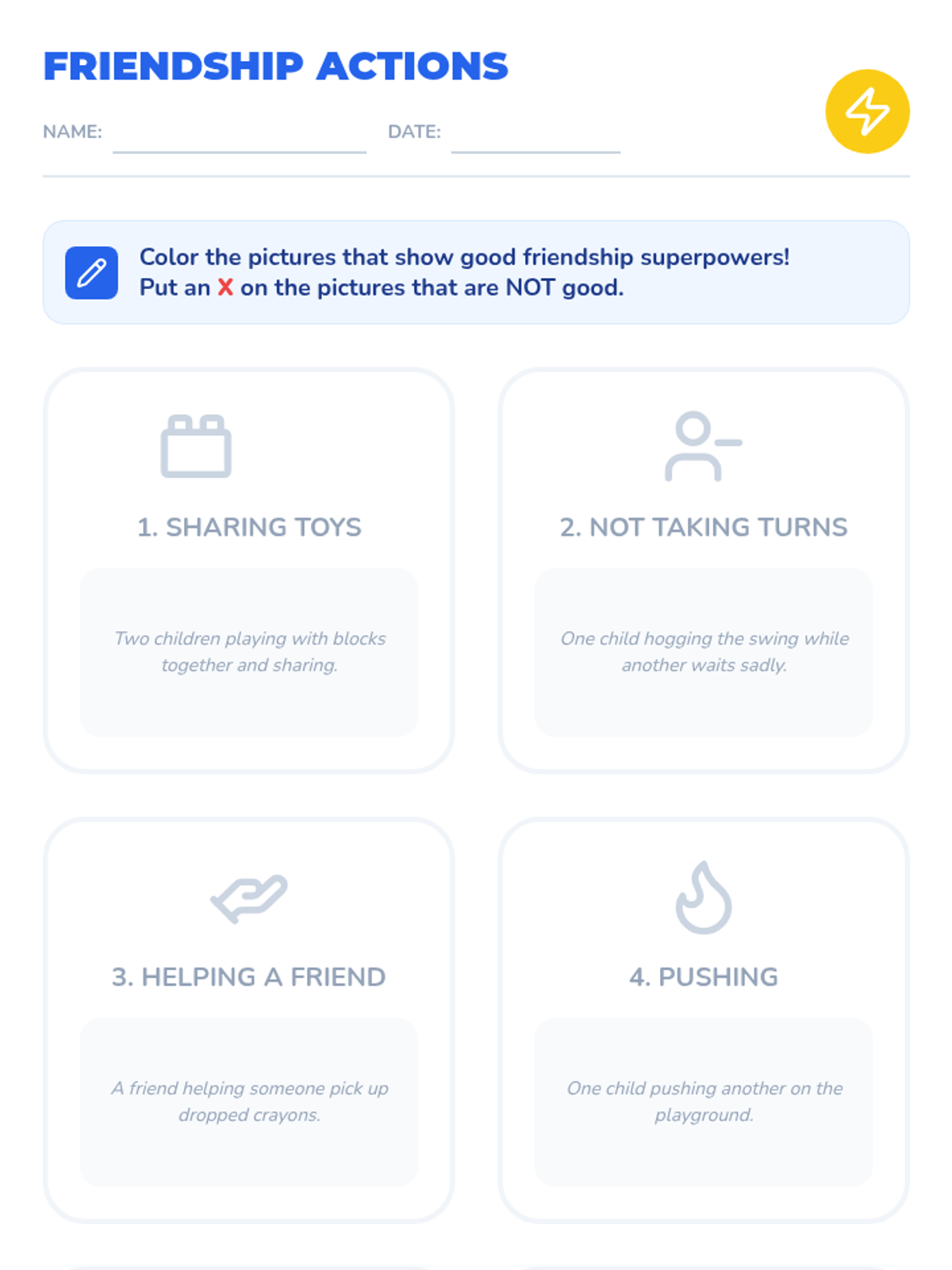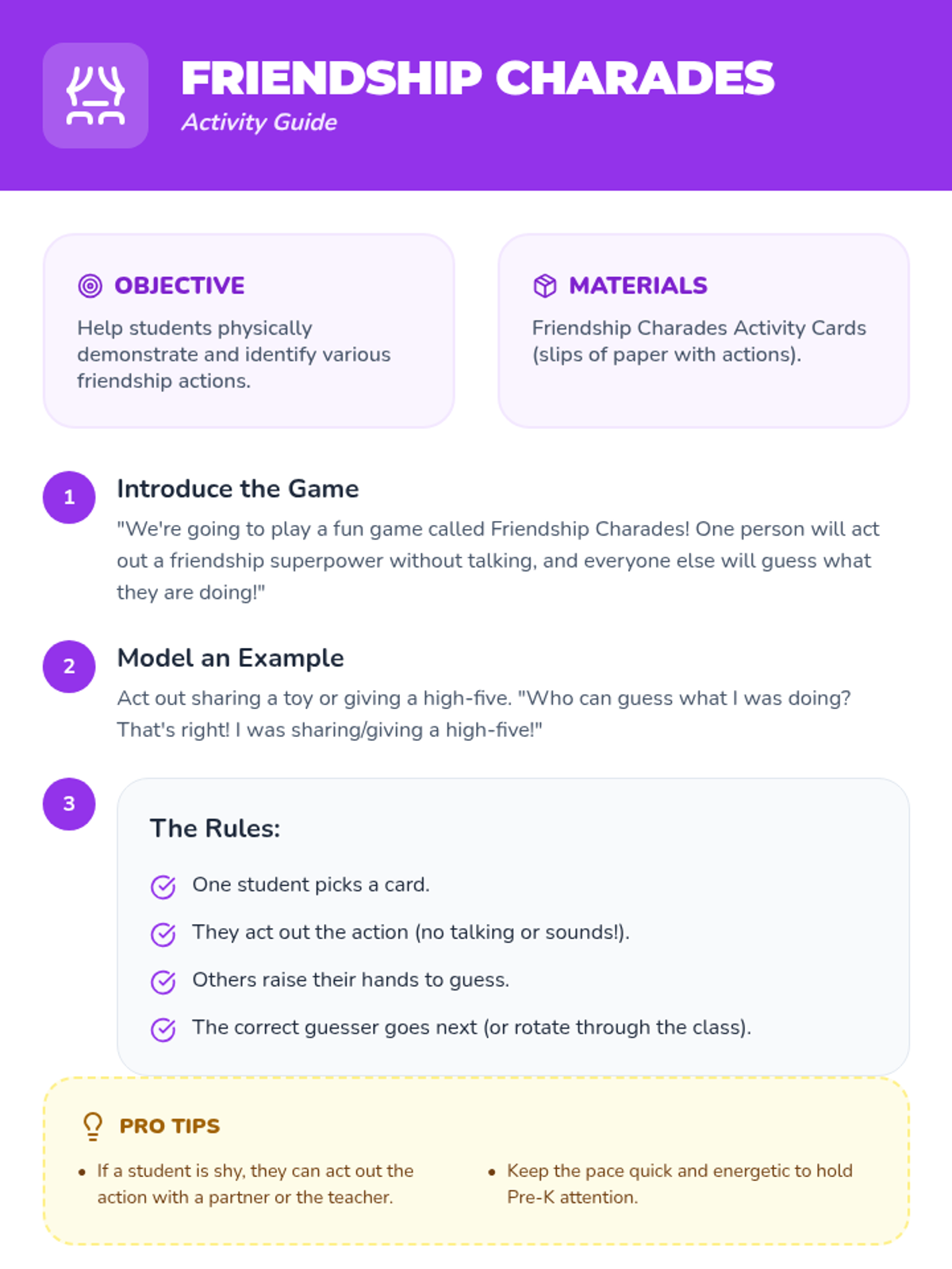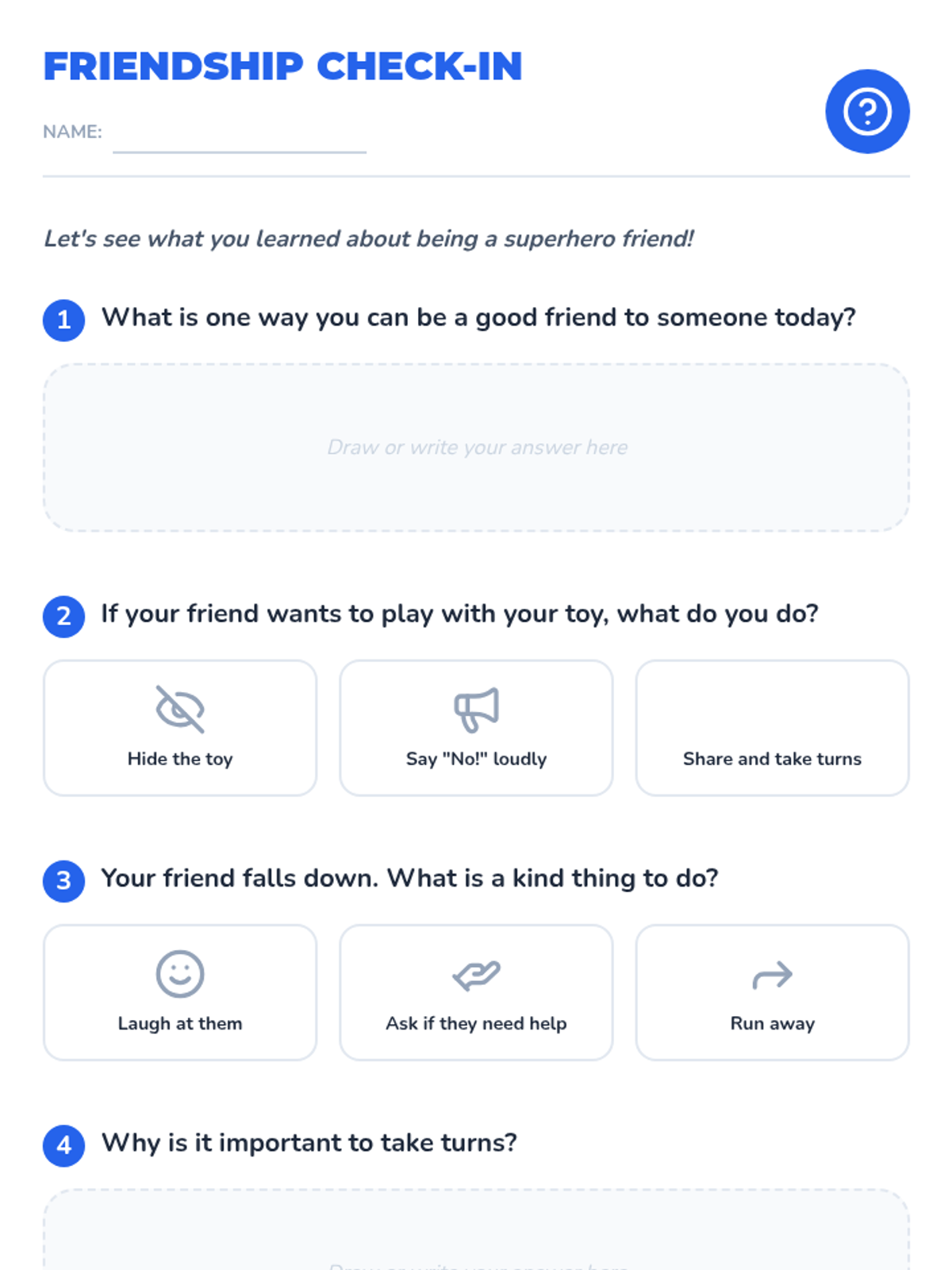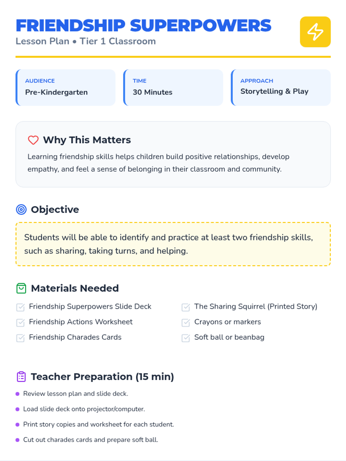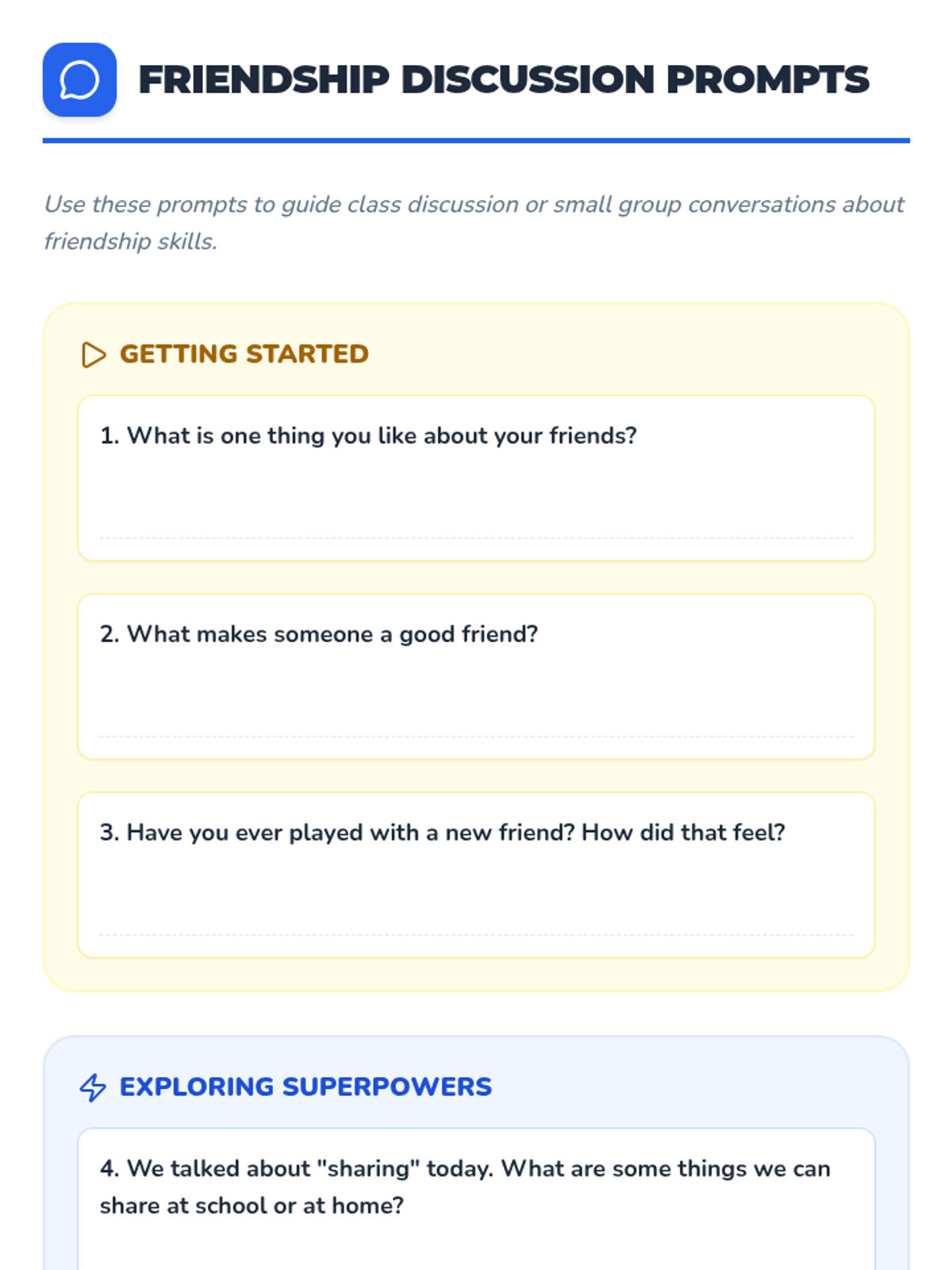 An interactive Pre-Kindergarten lesson introducing foundational friendship skills through the concept of 'Friendship Superpowers' like sharing, taking turns, and helping.