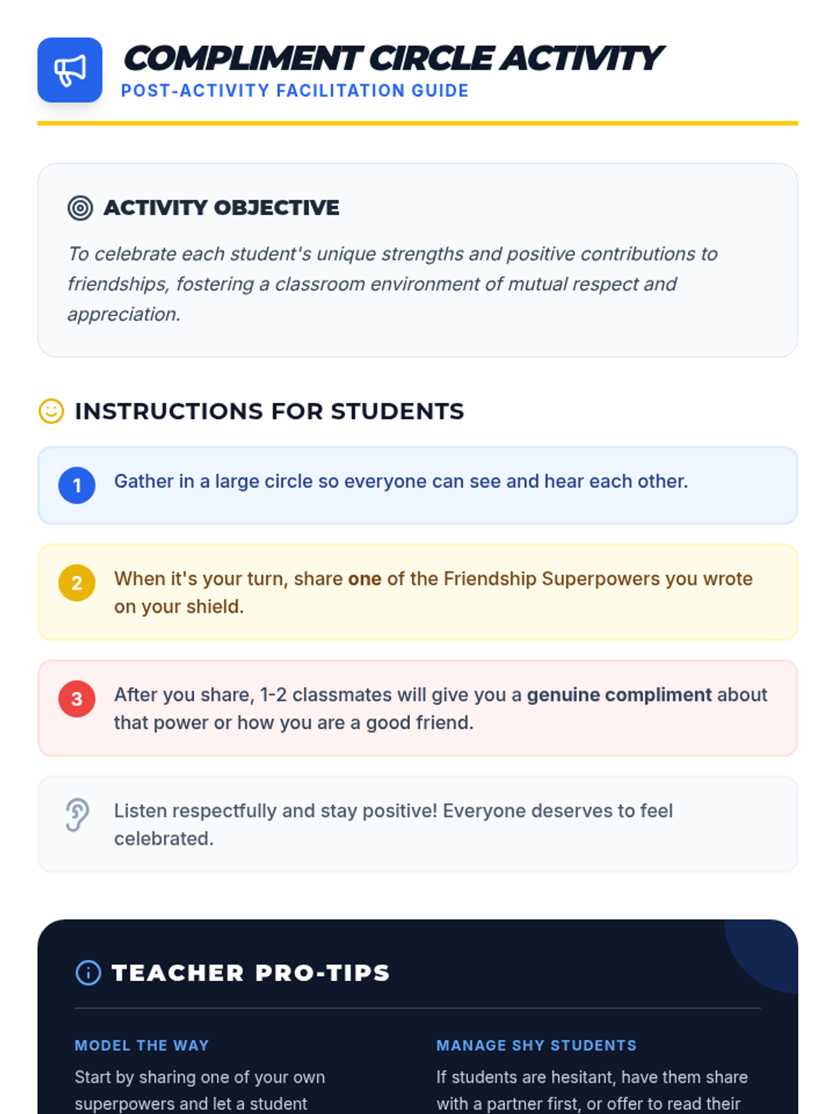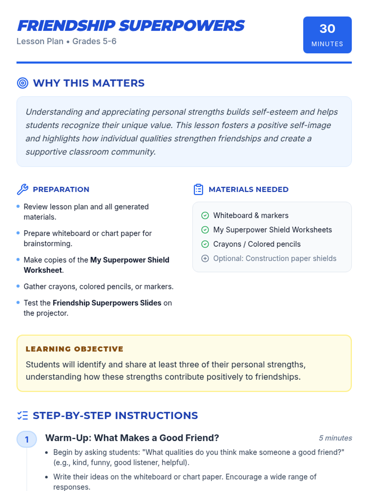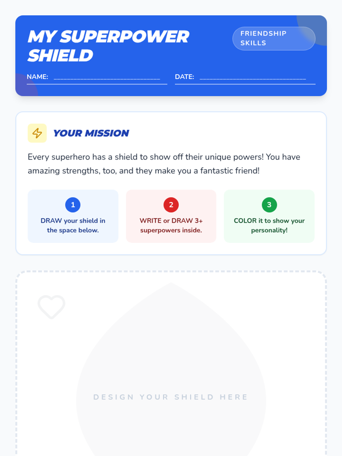 This lesson empowers 5th and 6th-grade students to identify and celebrate their unique personal strengths, or 'superpowers.' Students will create a symbolic shield and participate in a compliment circle to build self-esteem and recognize how their qualities strengthen friendships.