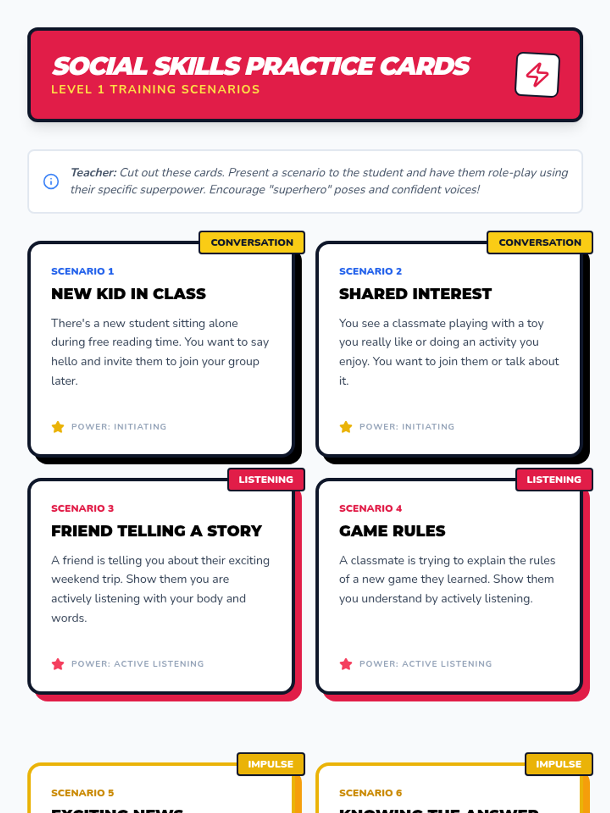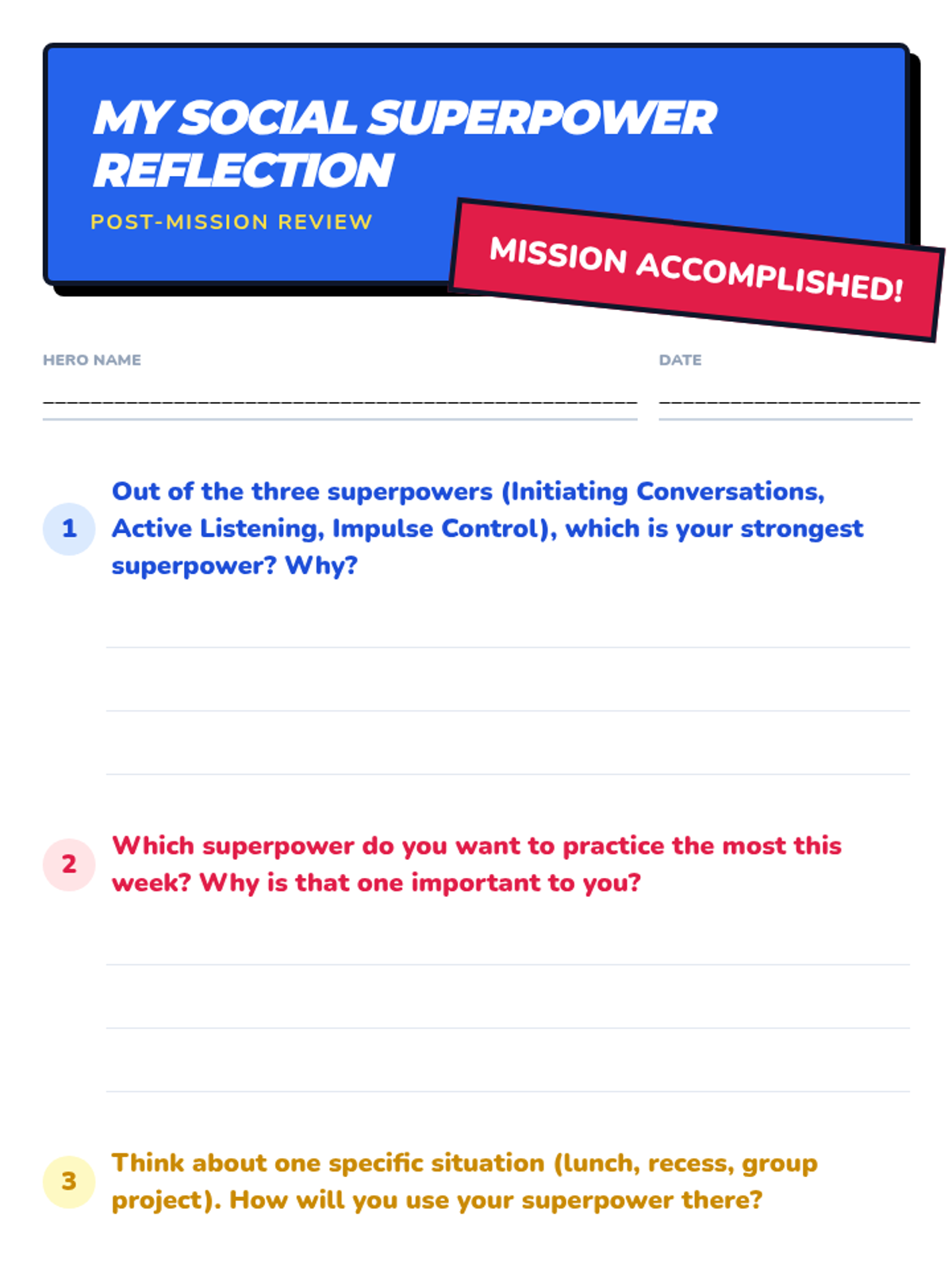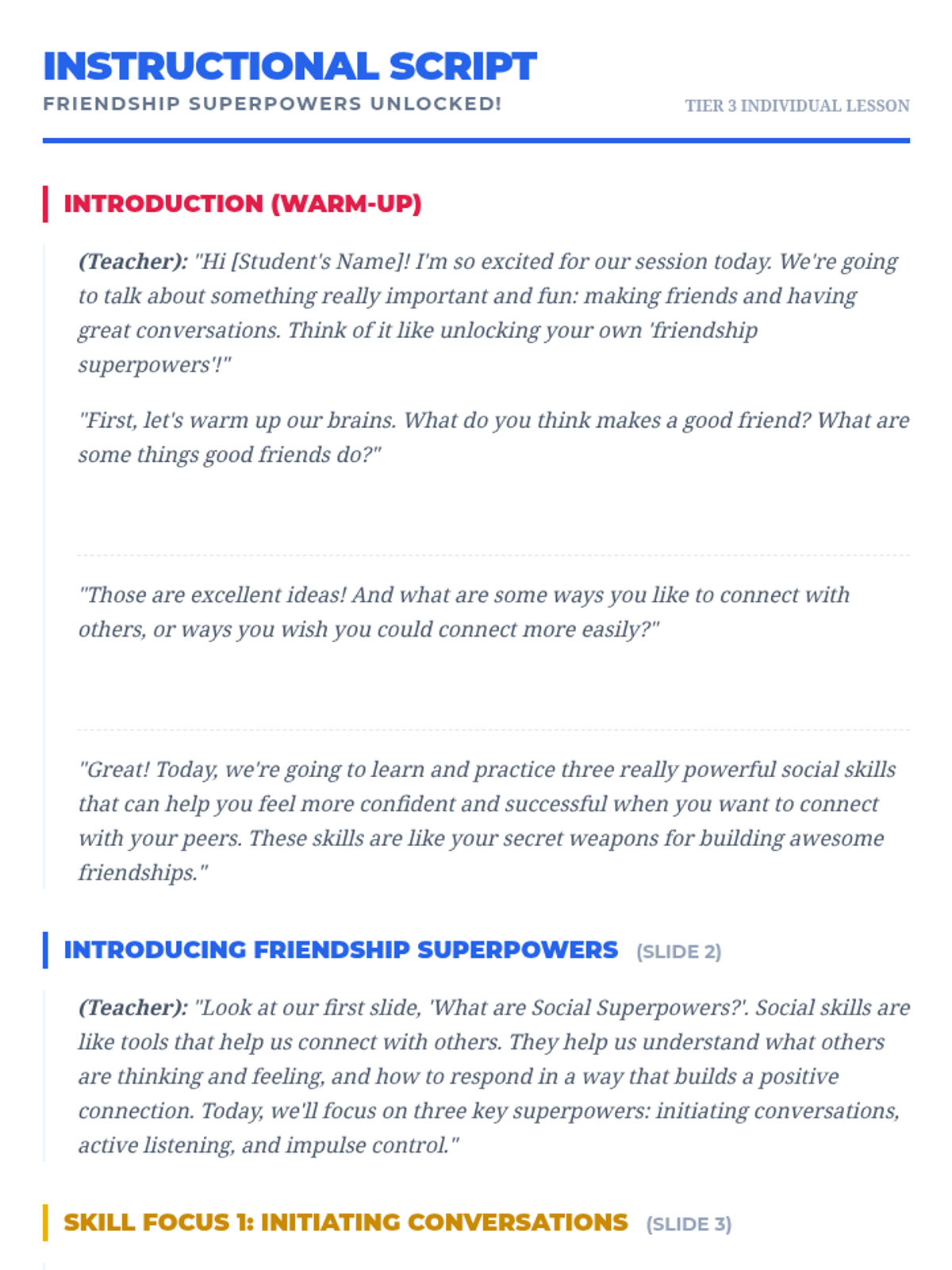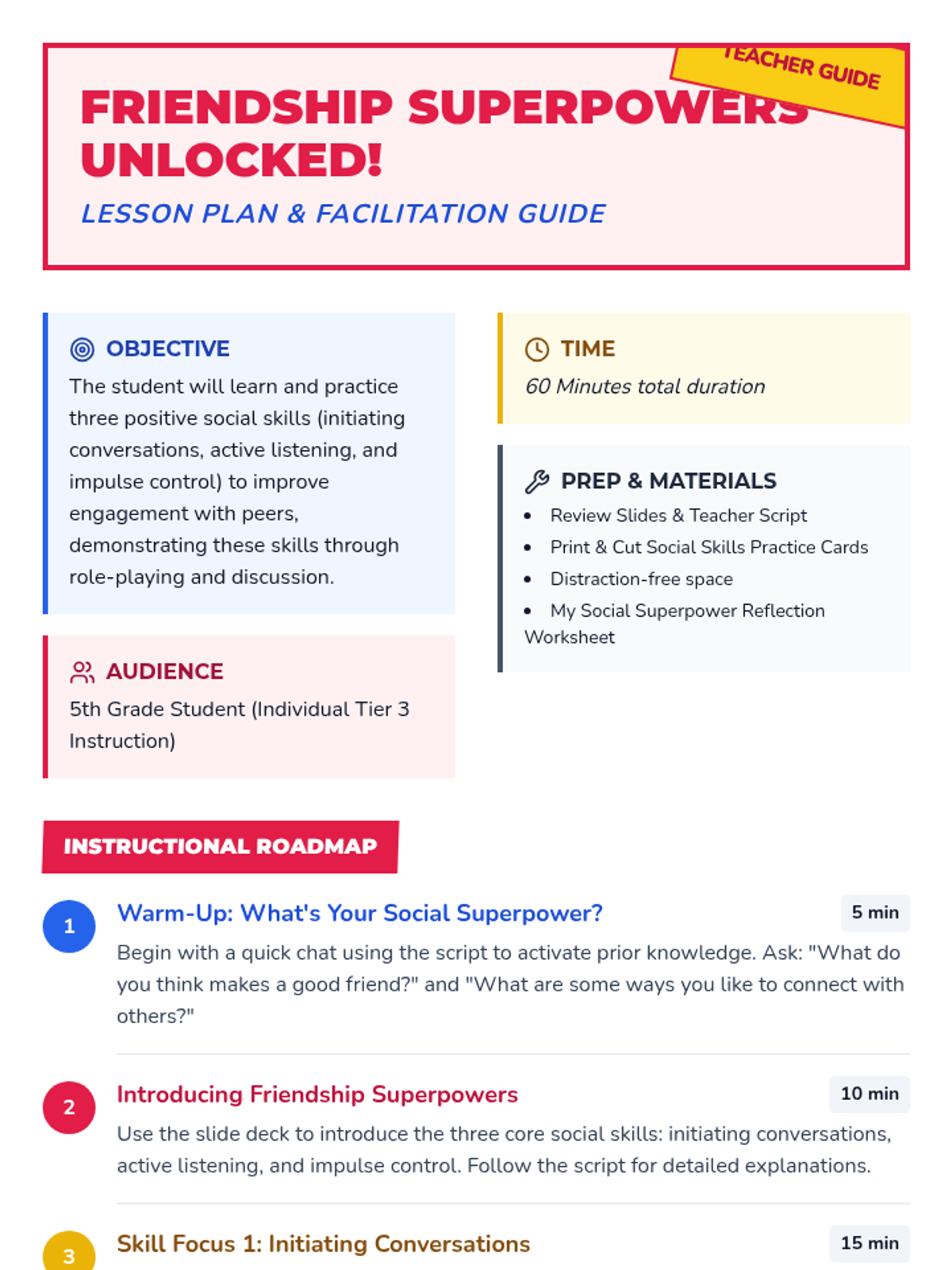 A 60-minute individualized Tier 3 lesson for a 5th-grade student focusing on initiating conversations, active listening, and impulse control through a comic-book superpower theme.