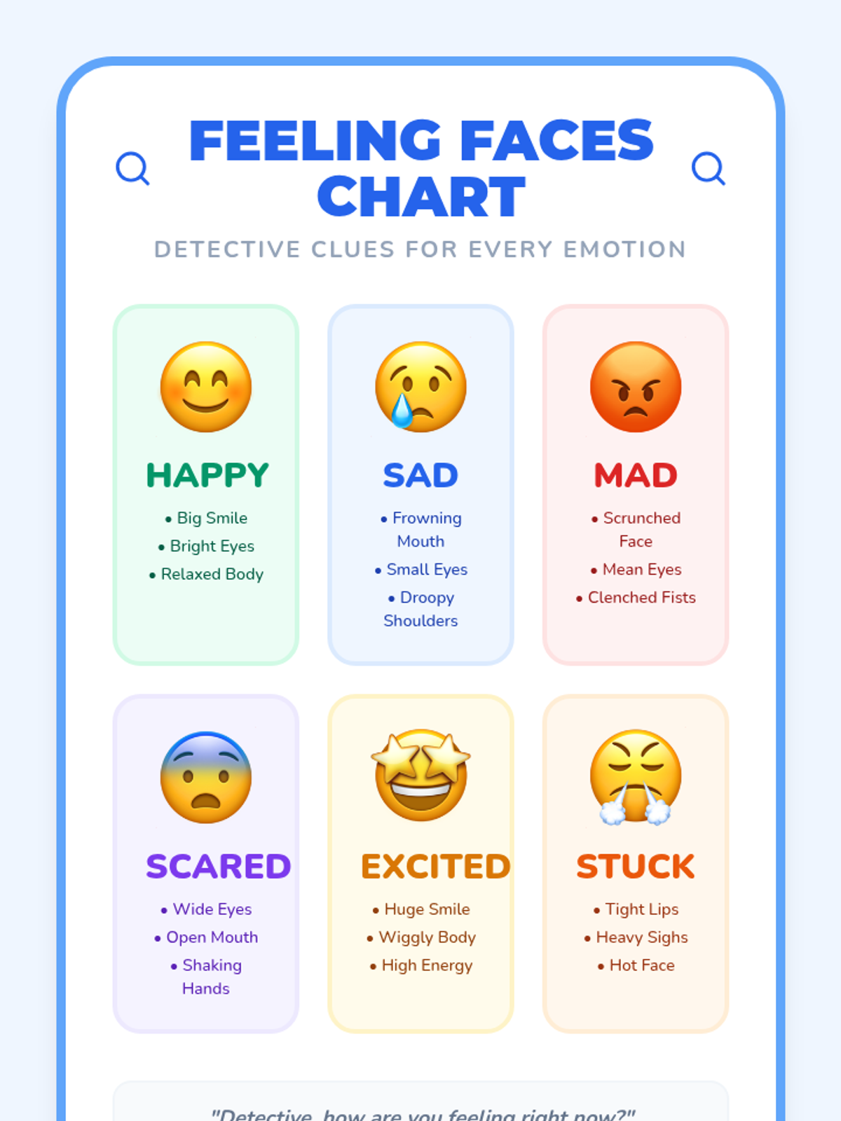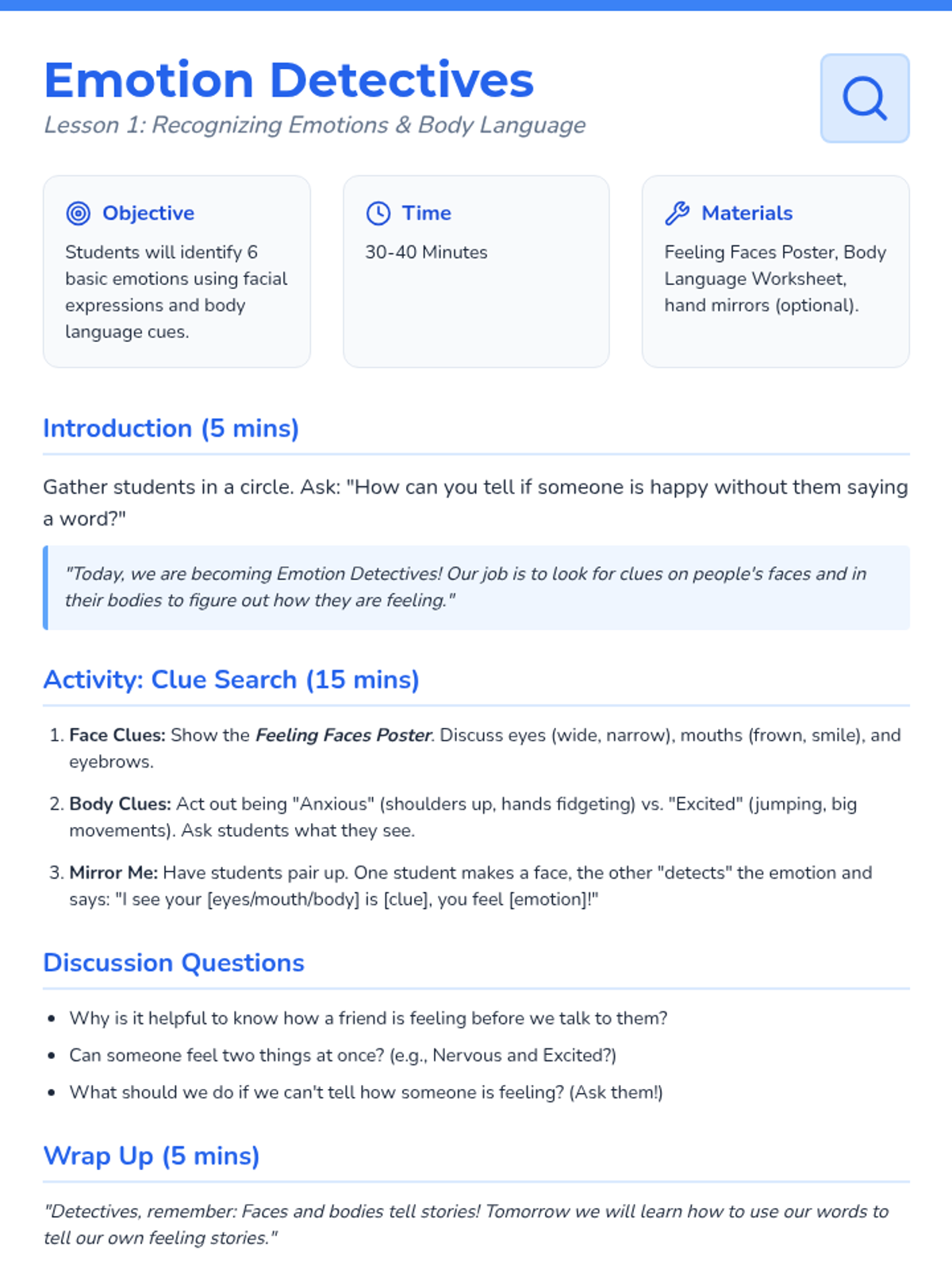 Students learn to identify basic emotions in themselves and others by observing facial expressions and body language.