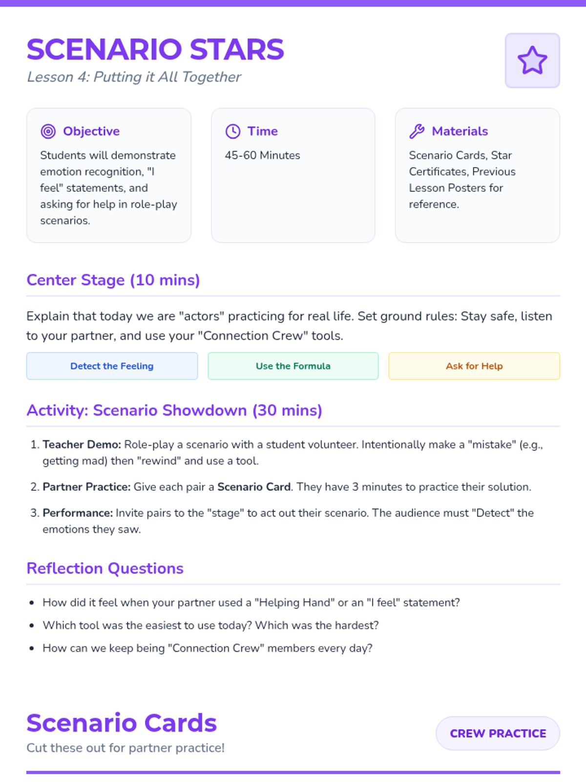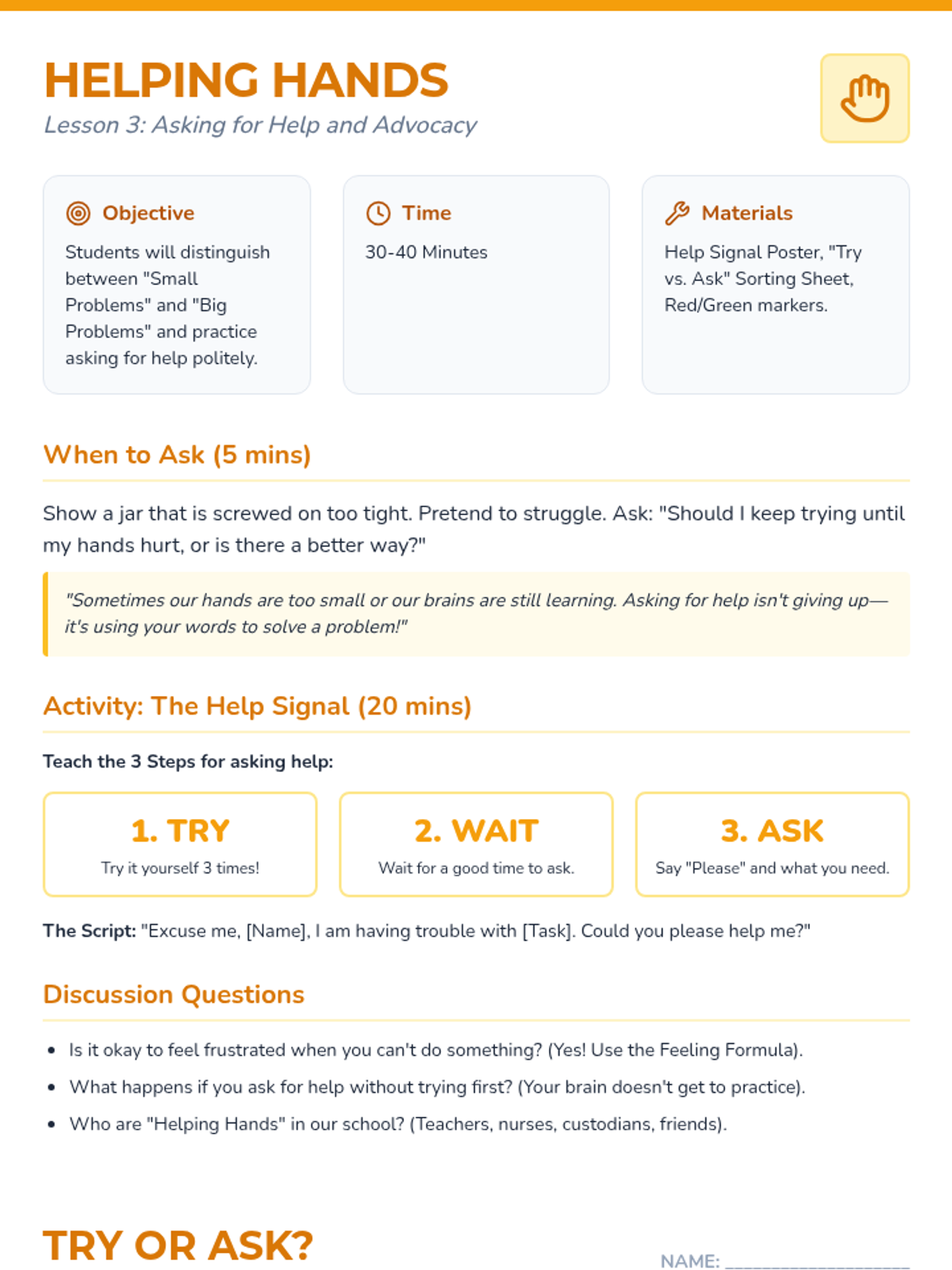 Students practice identifying when they need help and learning polite, clear ways to ask for assistance or advocate for their needs.