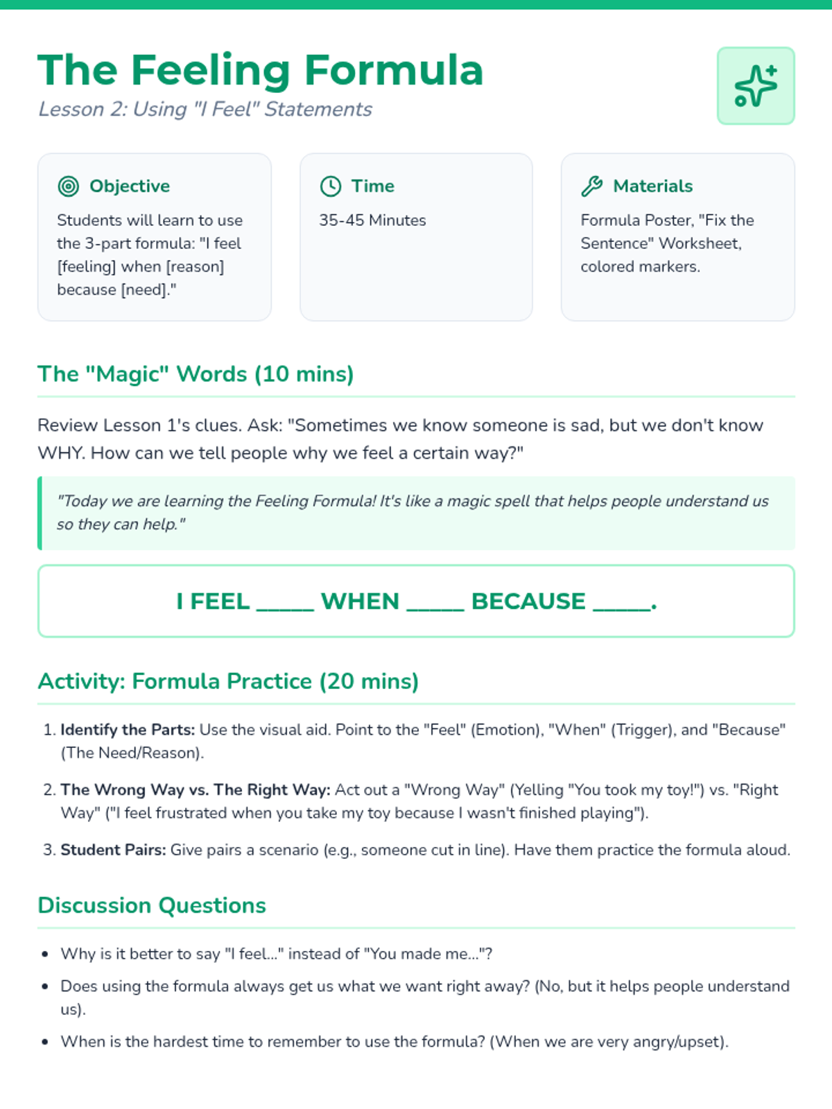 Students learn the structure of an 'I feel' statement to express their emotions clearly and constructively.
