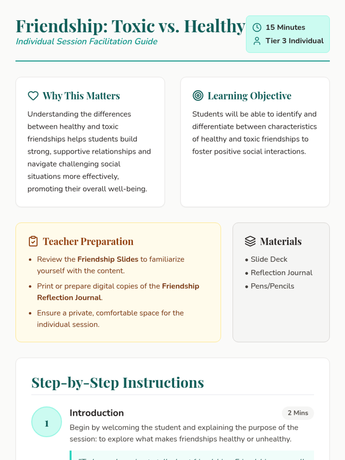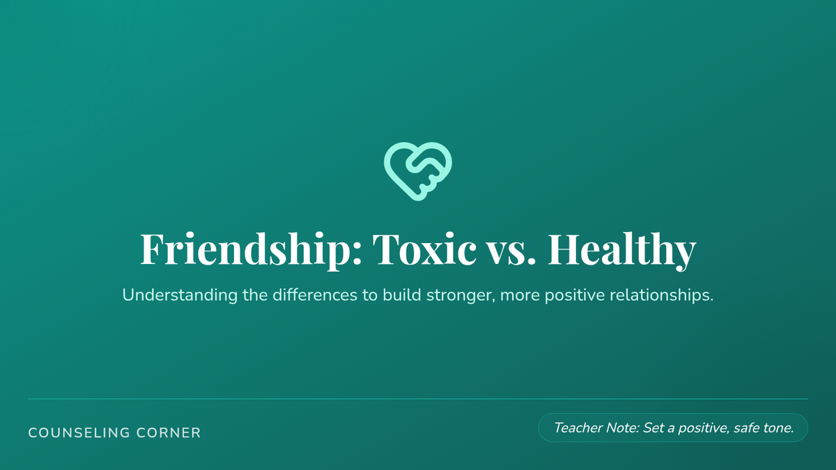 A 15-minute Tier 3 individual lesson for 8th graders focused on identifying and differentiating between healthy and toxic friendship characteristics.