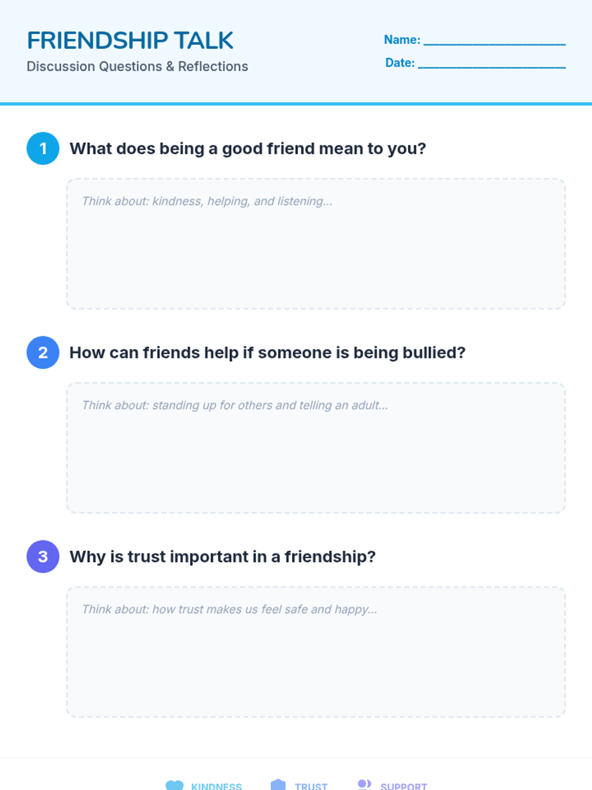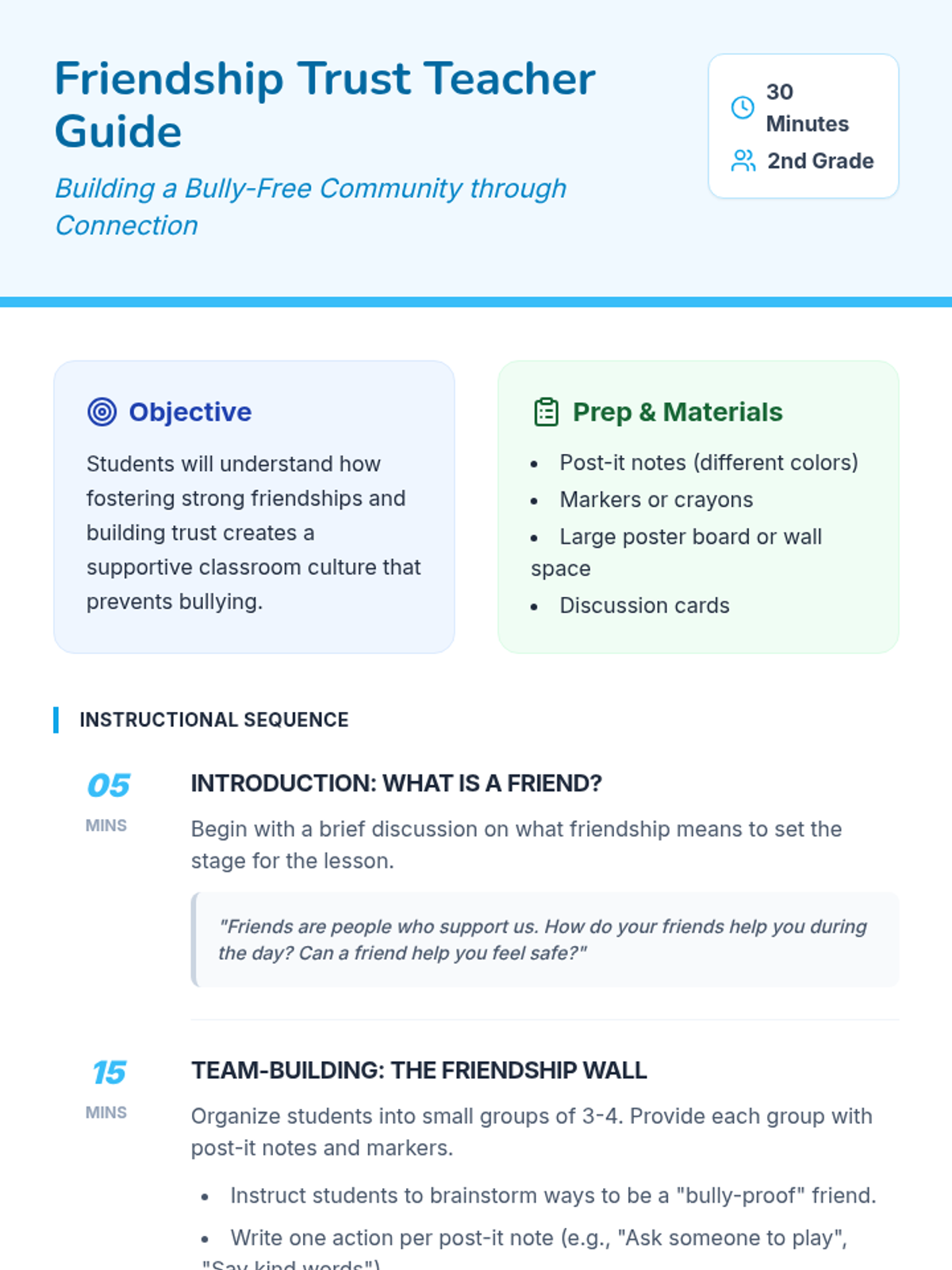 A 30-minute lesson for 2nd graders focusing on the power of friendship and trust as tools to prevent bullying through team-building and discussion.