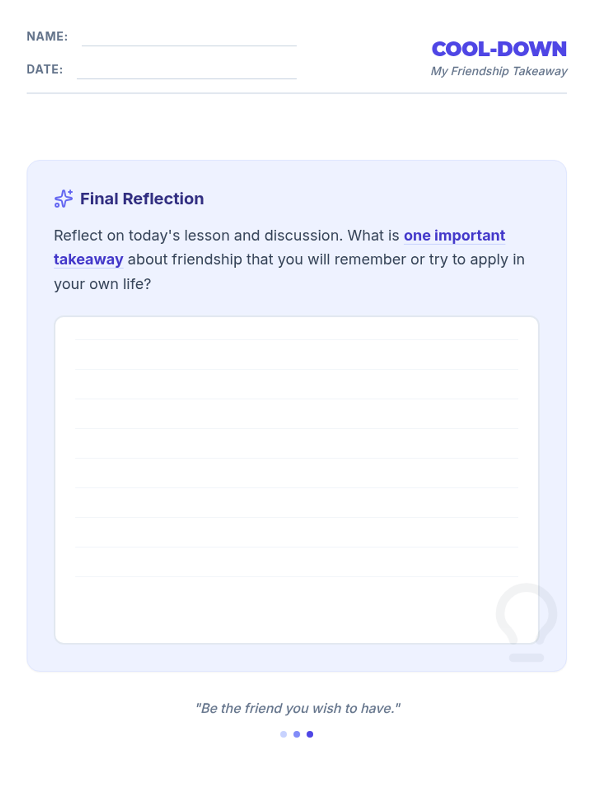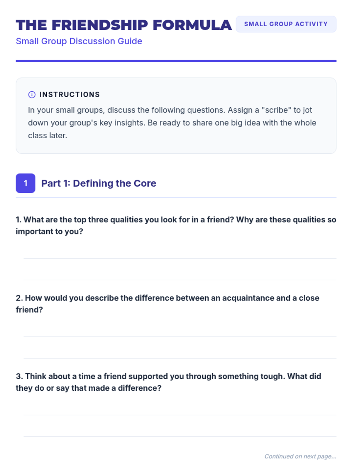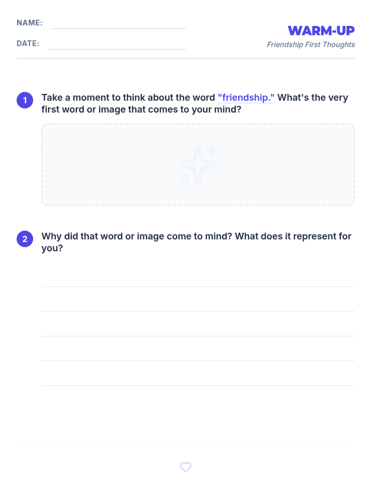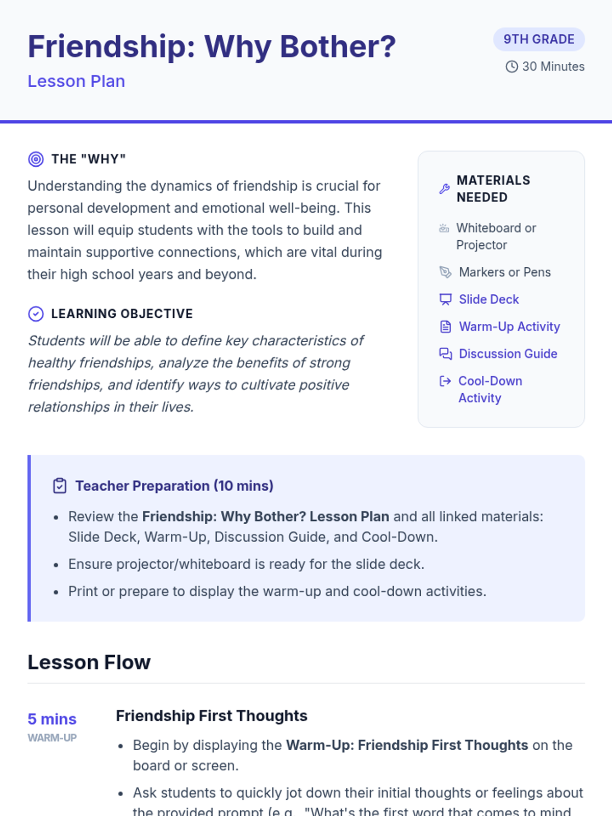 A 30-minute interactive lesson for 9th graders exploring the characteristics, benefits, and cultivation of healthy friendships. Students will define what makes a good friend and analyze the impact of social connections on their well-being.