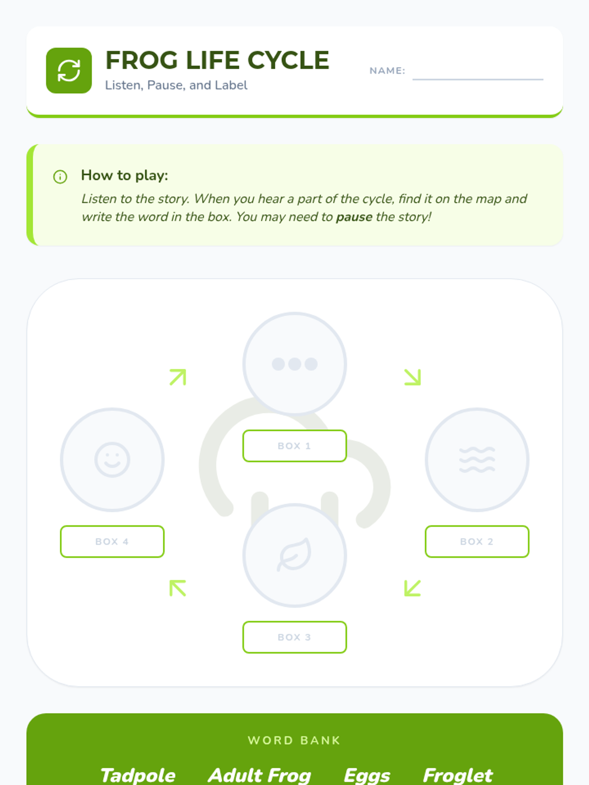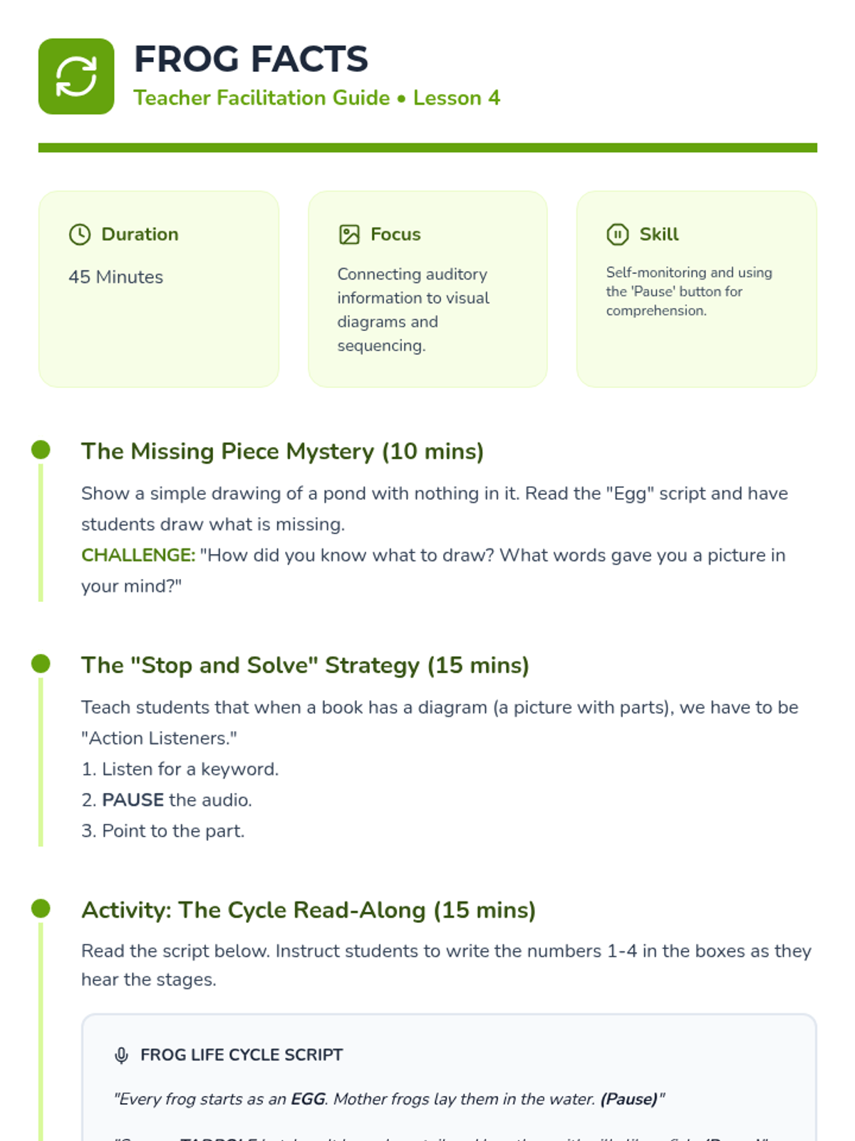 Students practice connecting auditory information to visual data by matching spoken text to specific parts of life cycle diagrams.