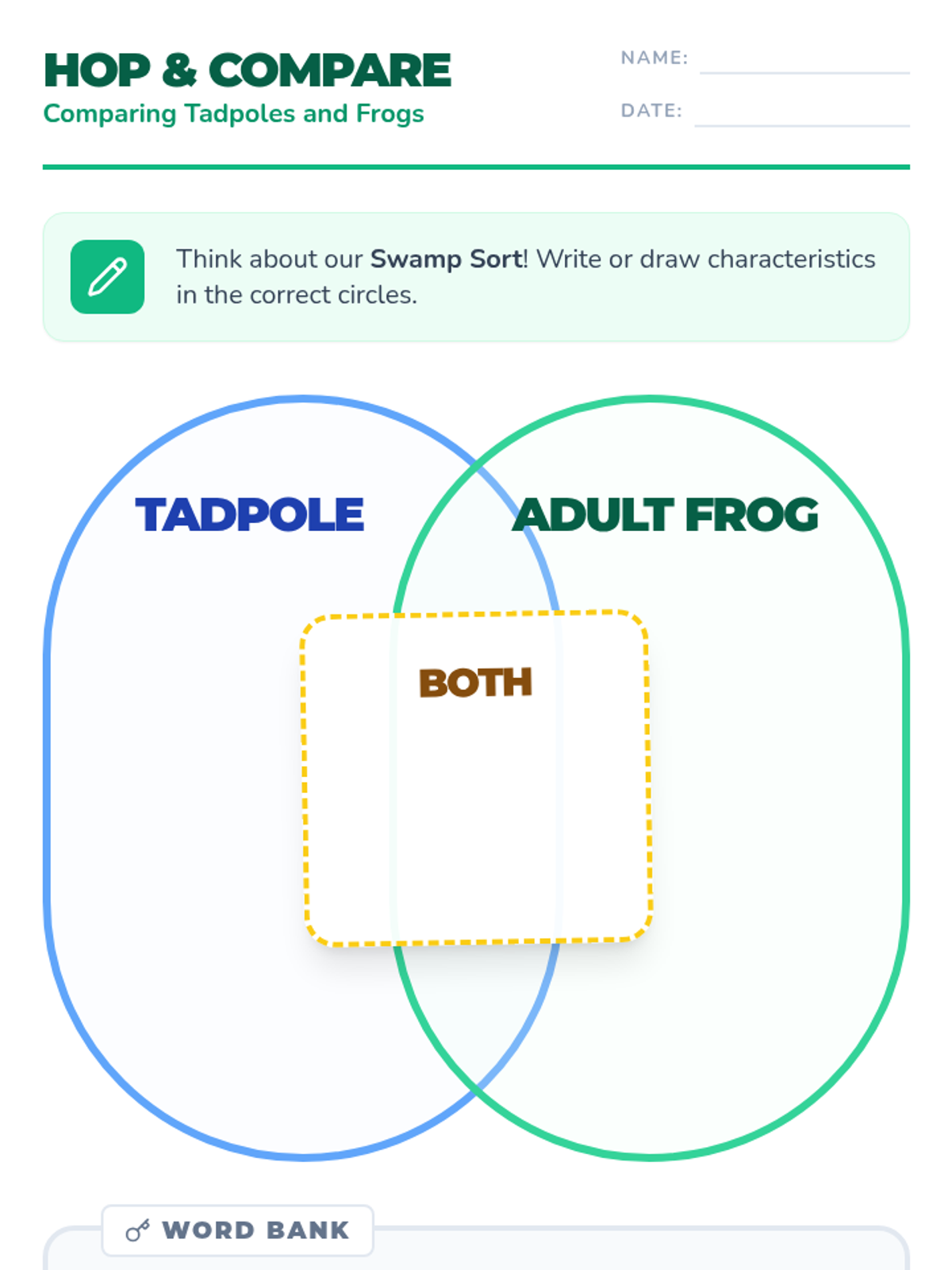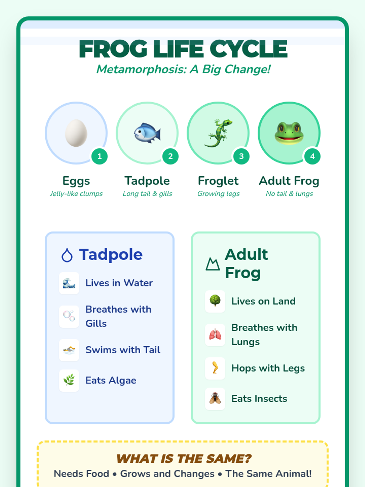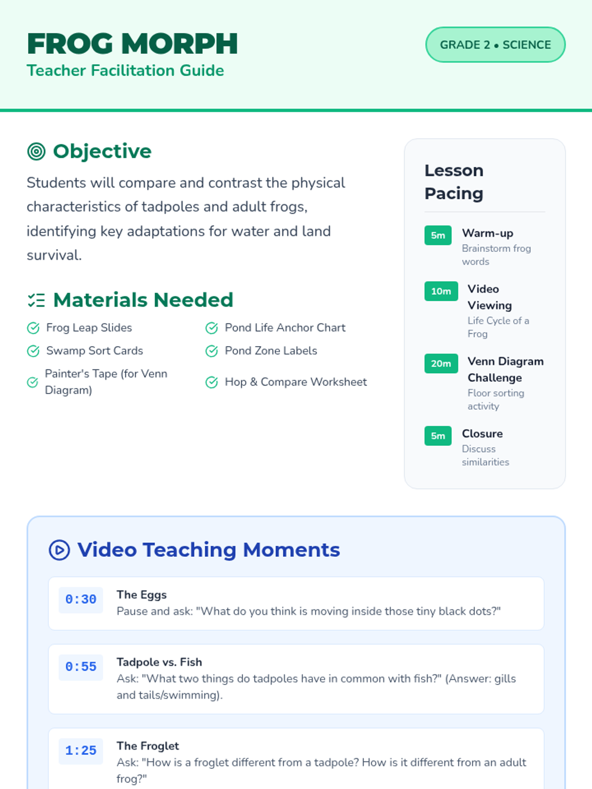 A 2nd-grade science lesson exploring the transformation of frogs through a video-based study and a physical Venn diagram sorting activity. Students compare the anatomical and behavioral differences between aquatic tadpoles and terrestrial adult frogs.