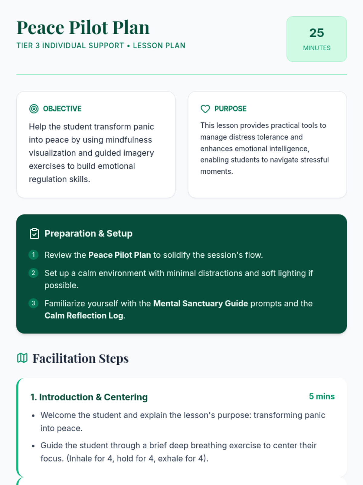 A Tier 3 individual lesson focused on transforming panic into peace using mindfulness visualization and guided imagery techniques.