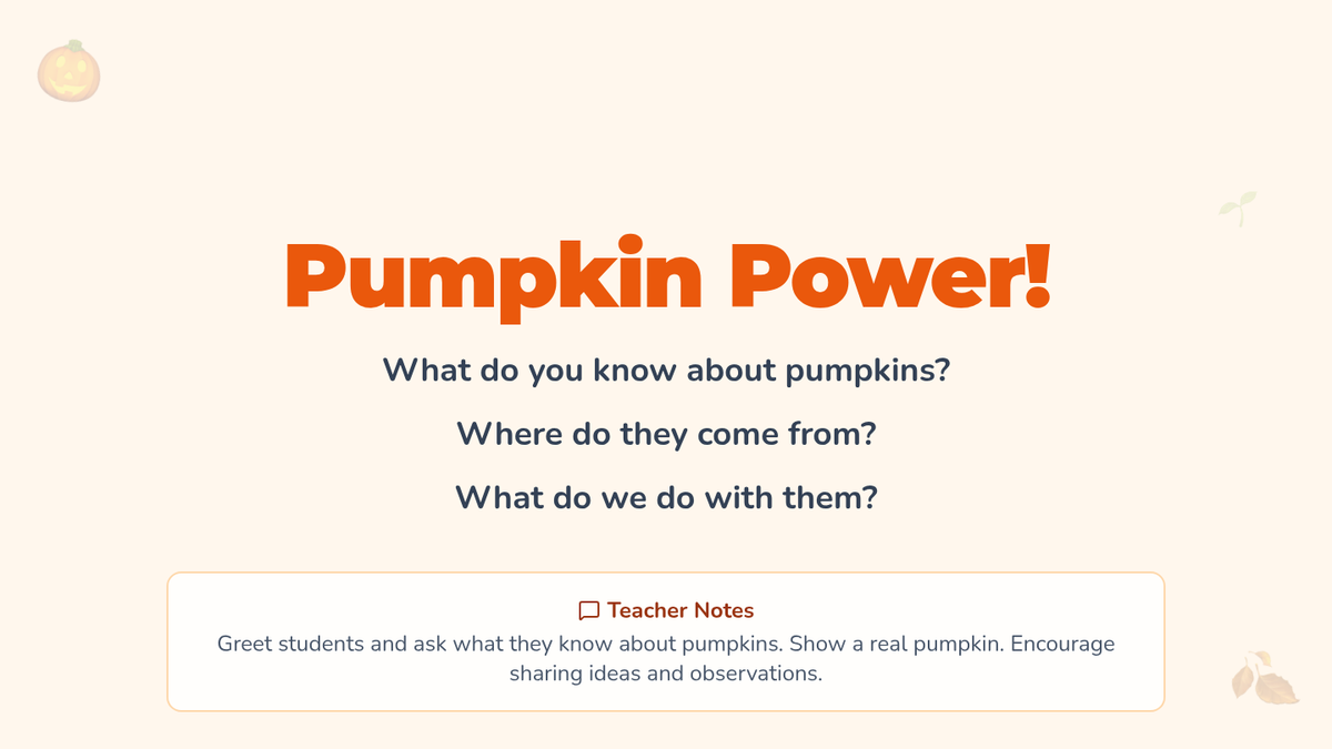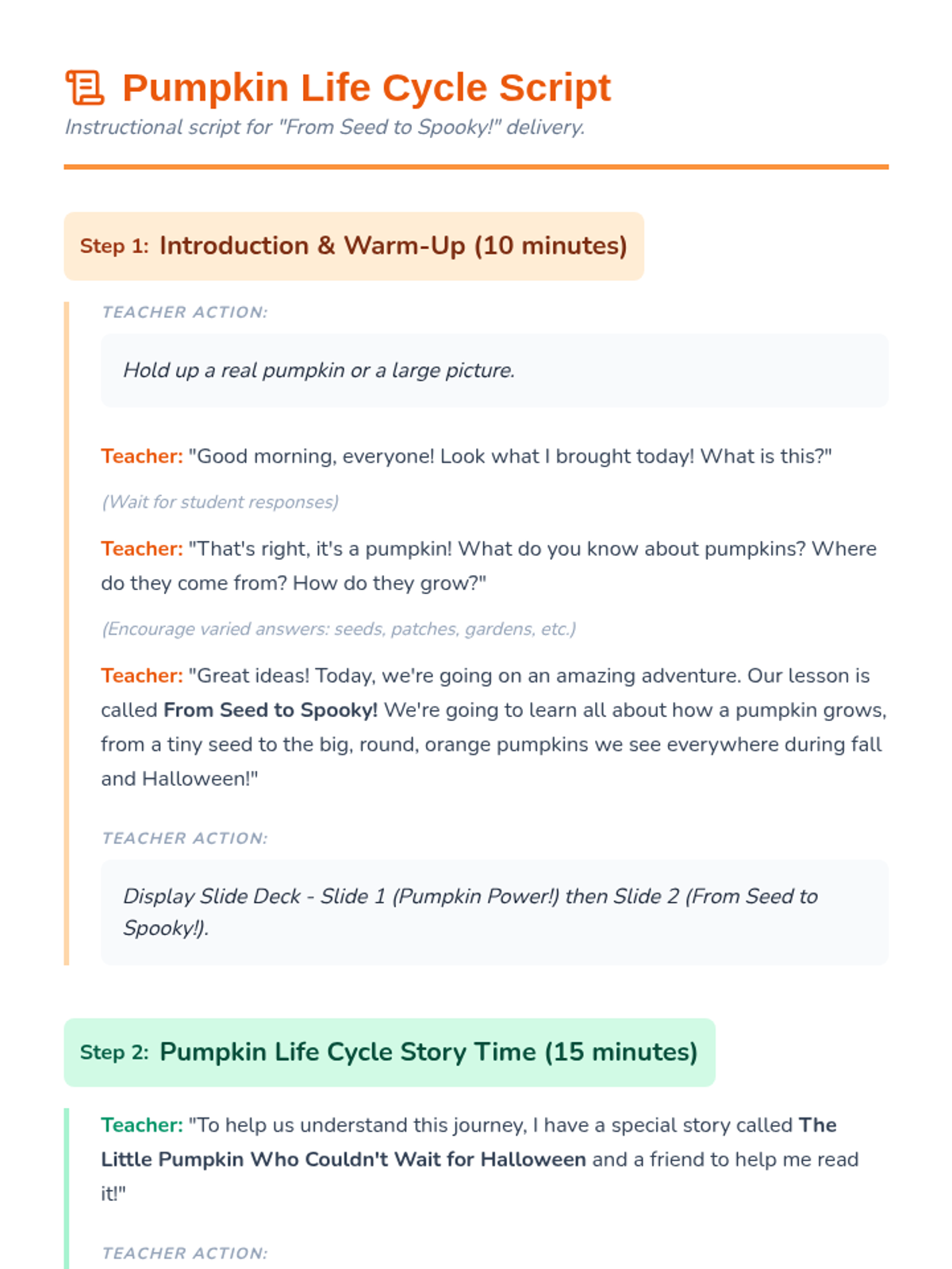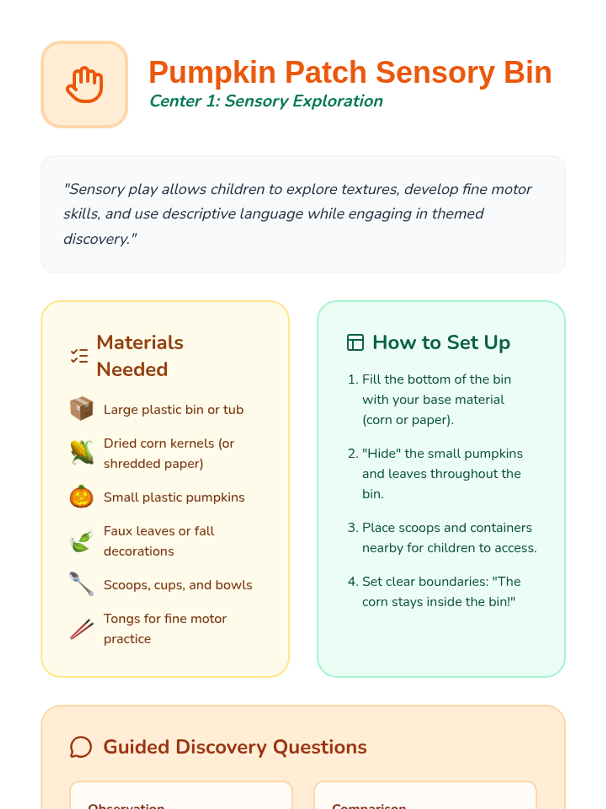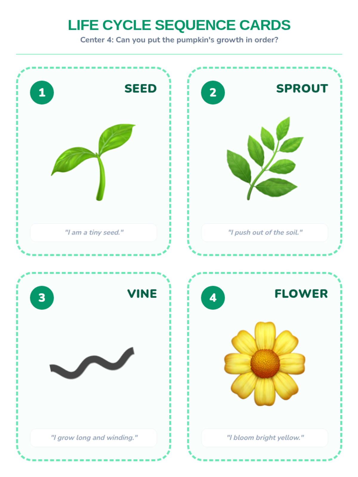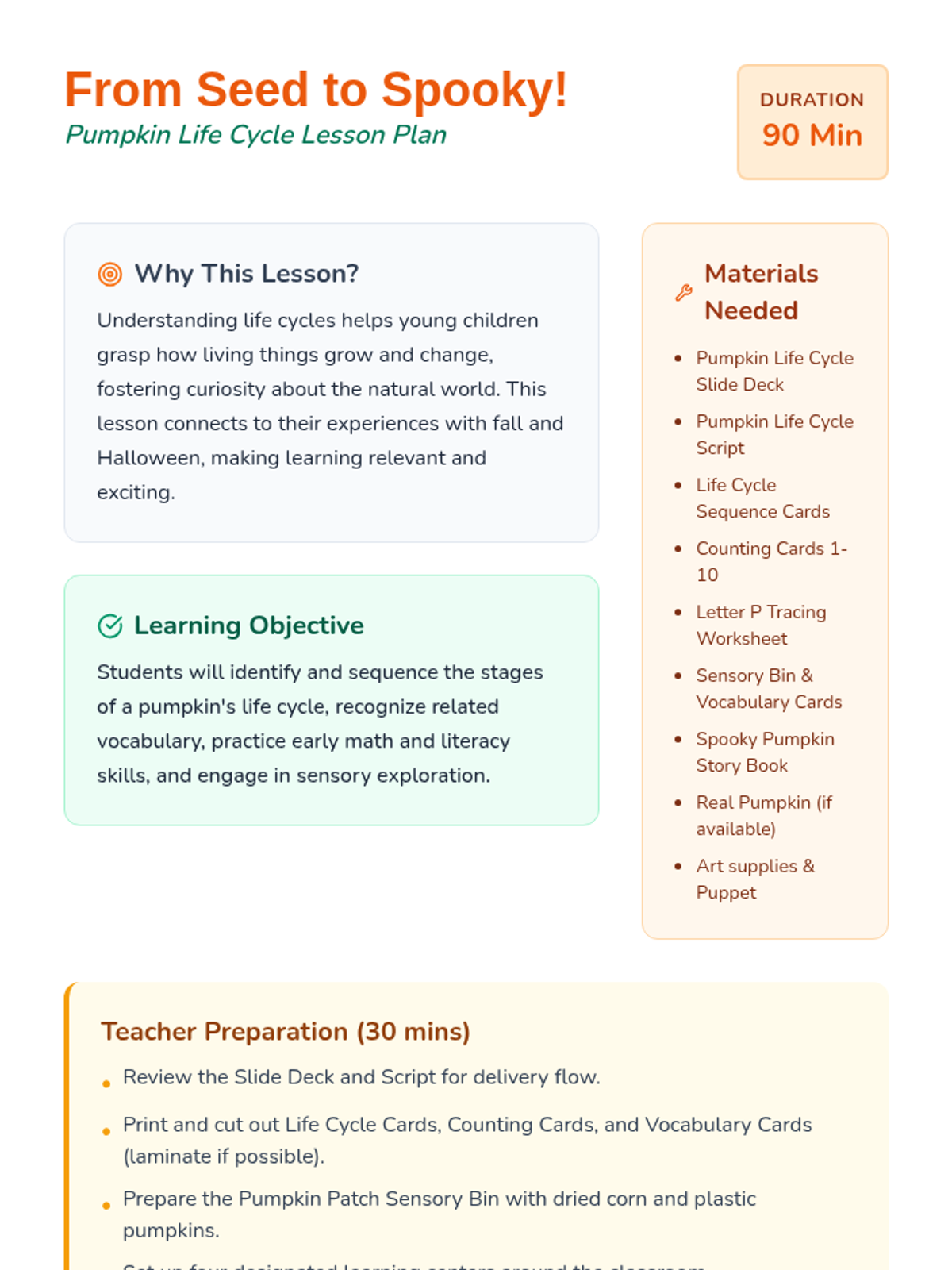 A 90-minute Halloween-themed science and sensory lesson for Pre-K students exploring the pumpkin life cycle through story, math, and literacy centers.