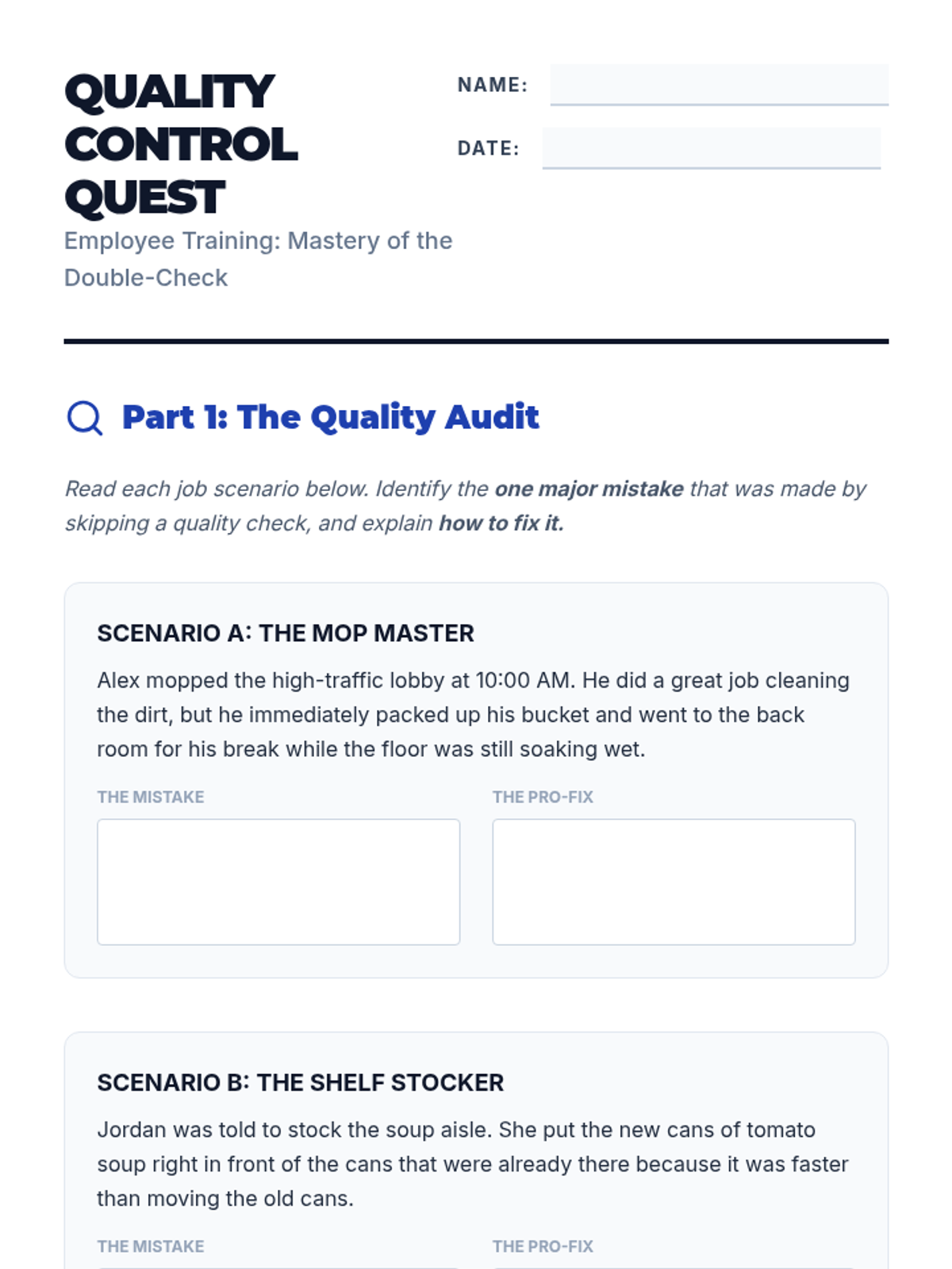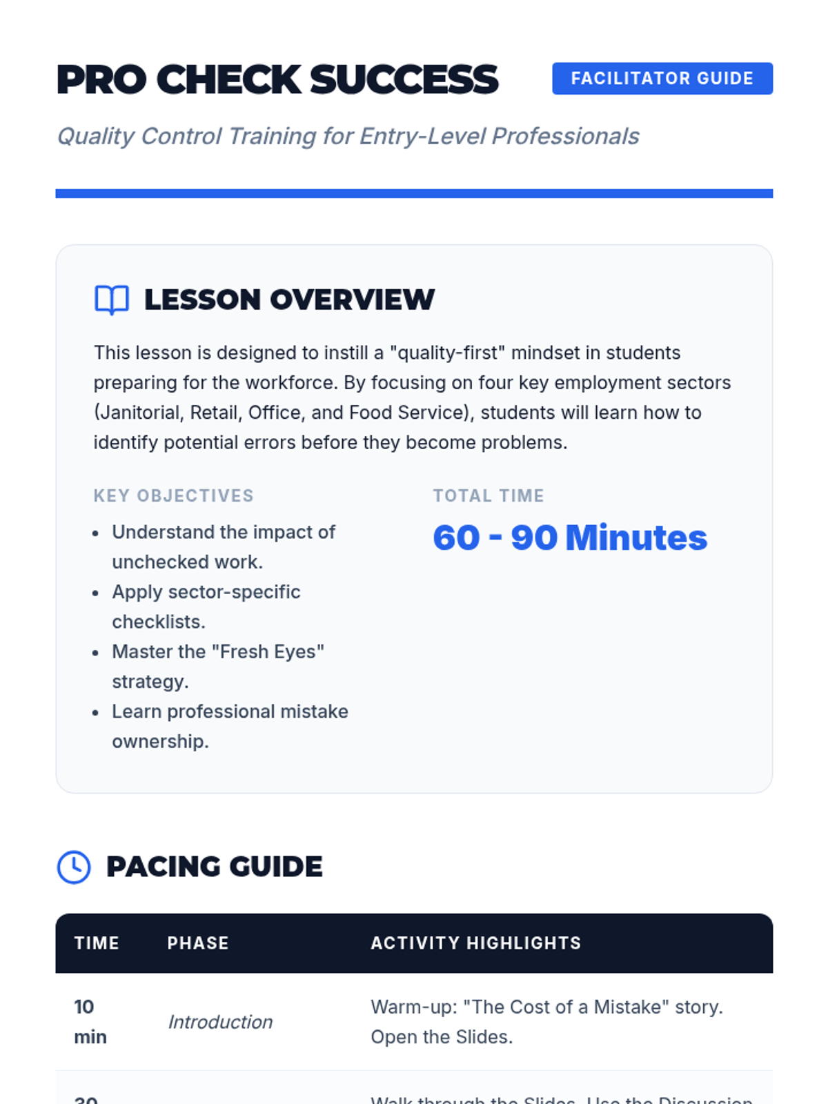 The core 90-minute training session covering four industry-specific challenges. Students rotate through scenarios to master the 4-step professional process for following instructions.