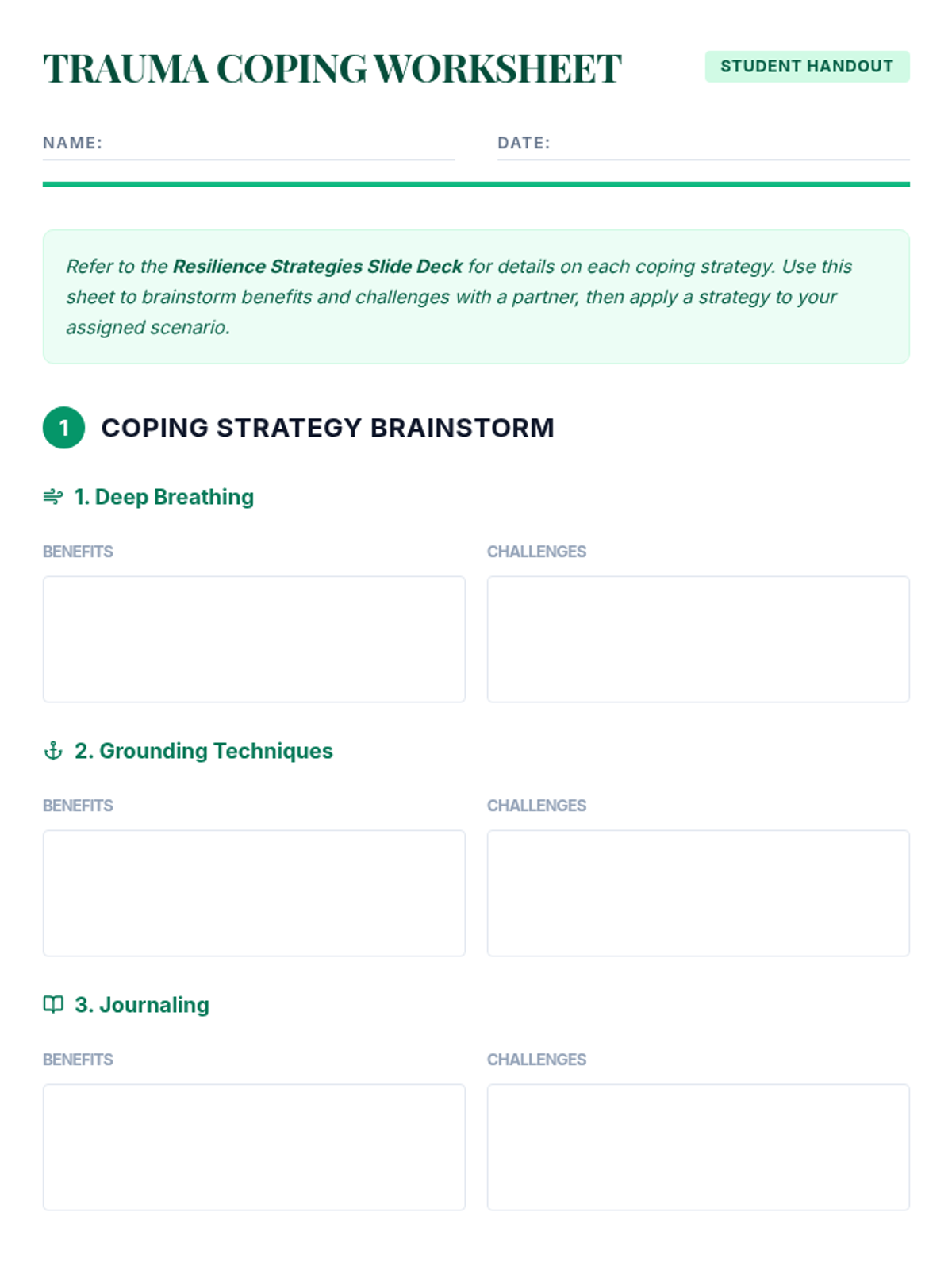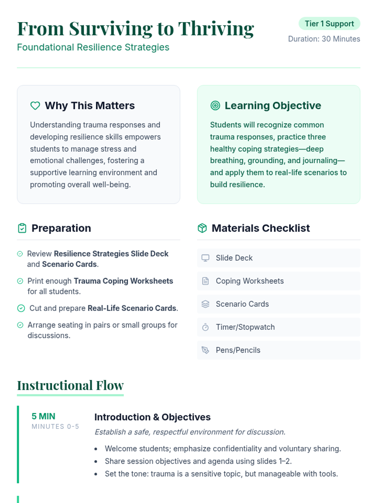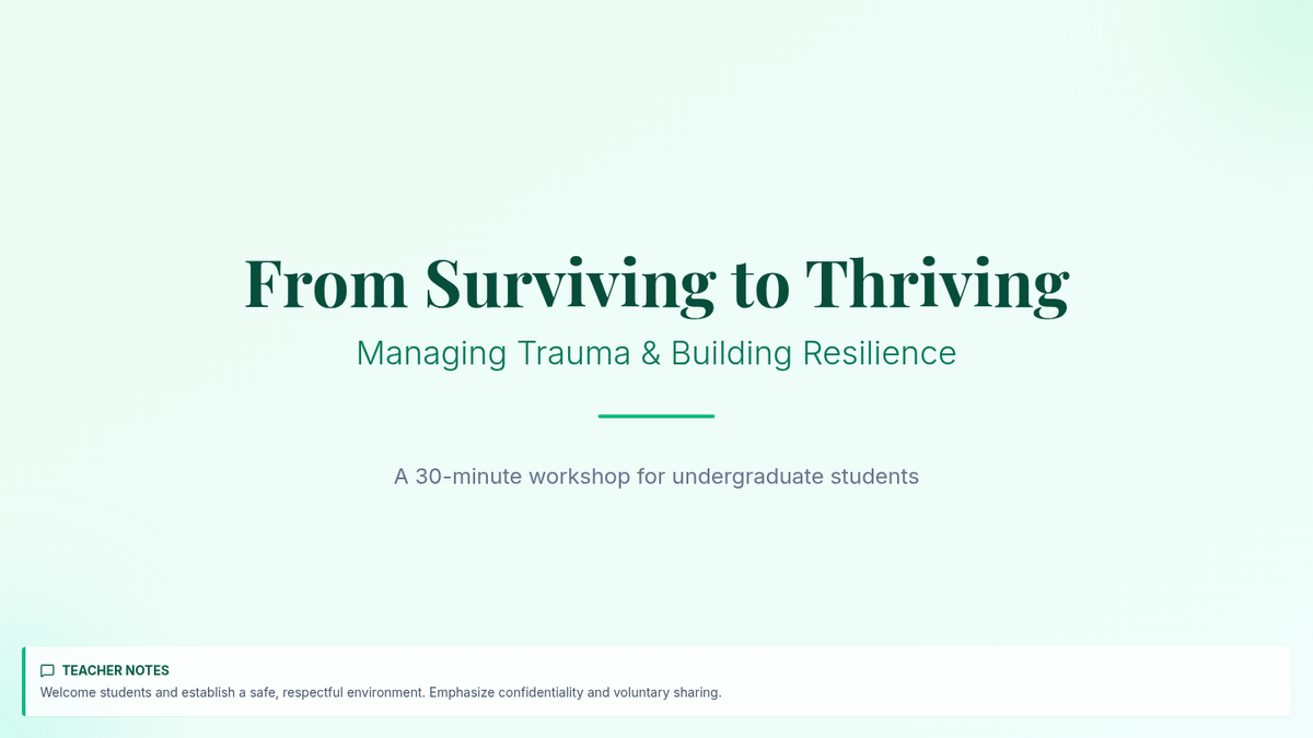 A 30-minute Tier 1 lesson for undergraduate students to learn foundational strategies for managing trauma, building resilience, and fostering emotional well-being through practical tools and real-life scenarios.