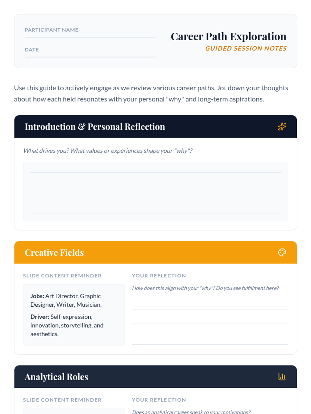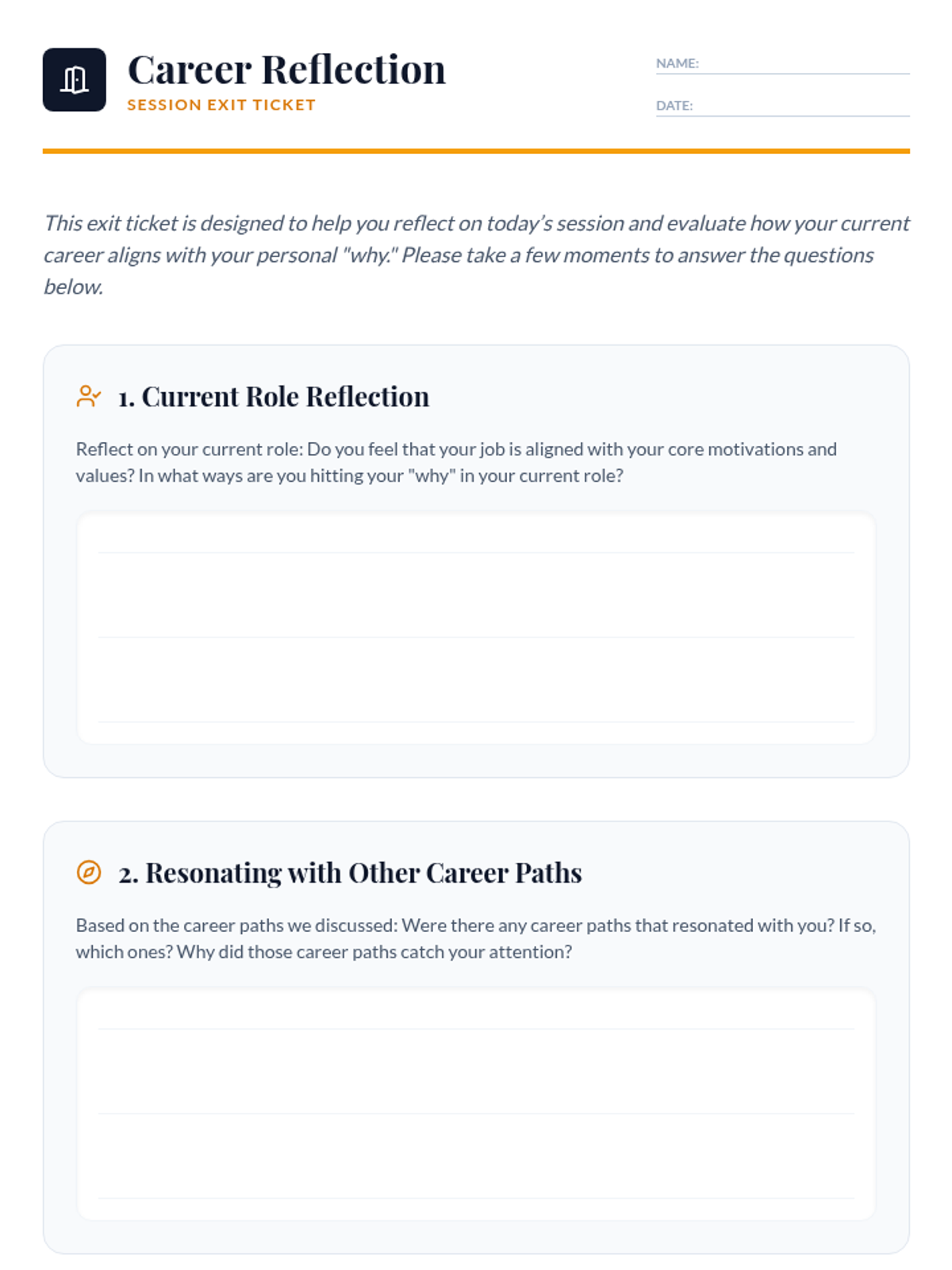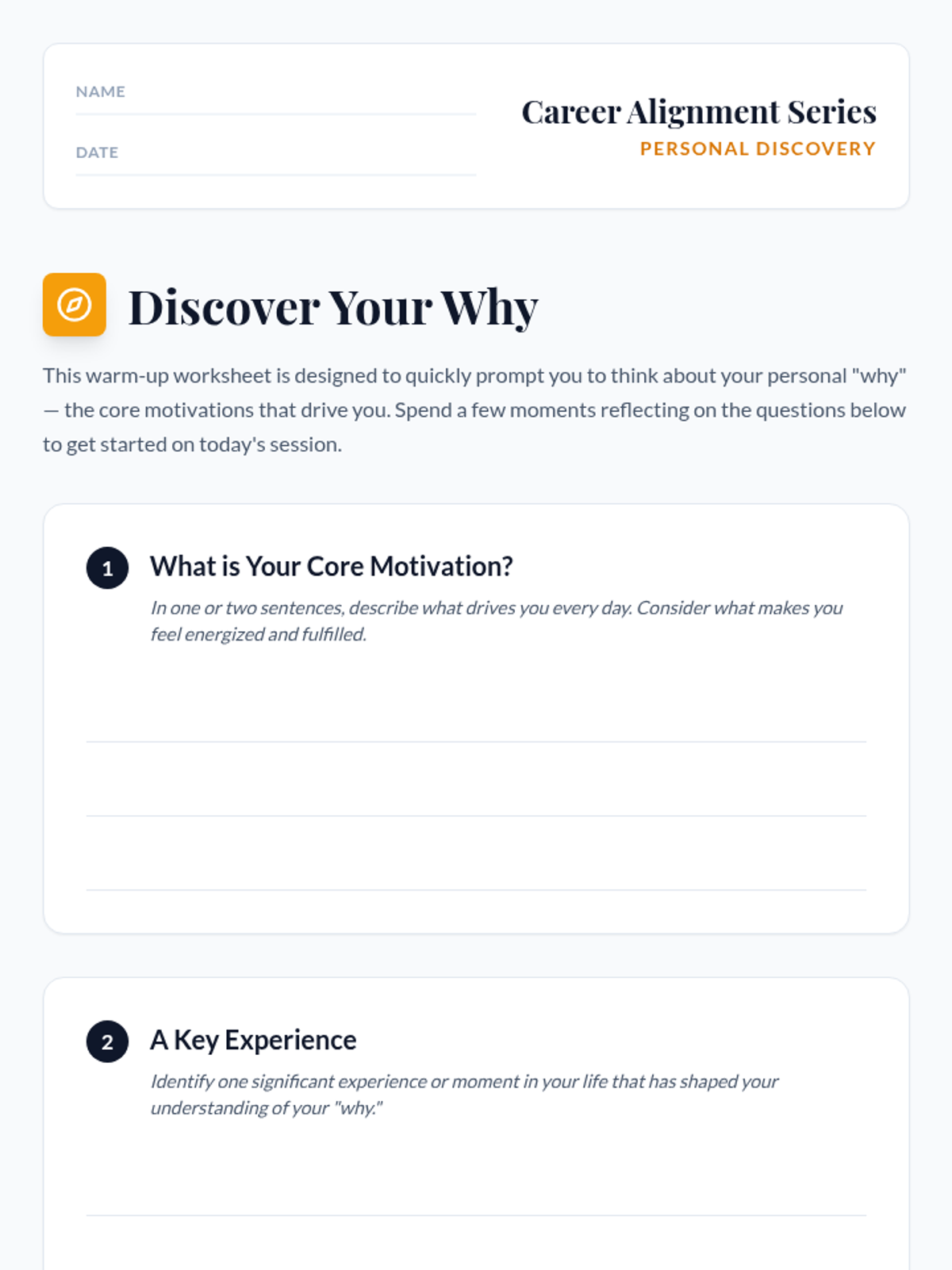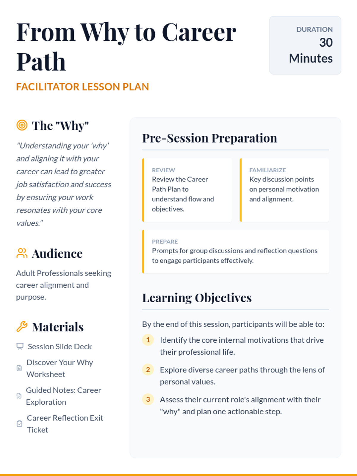 A 30-minute session for professionals to align their personal motivations with fulfilling career paths through reflection and exploration.