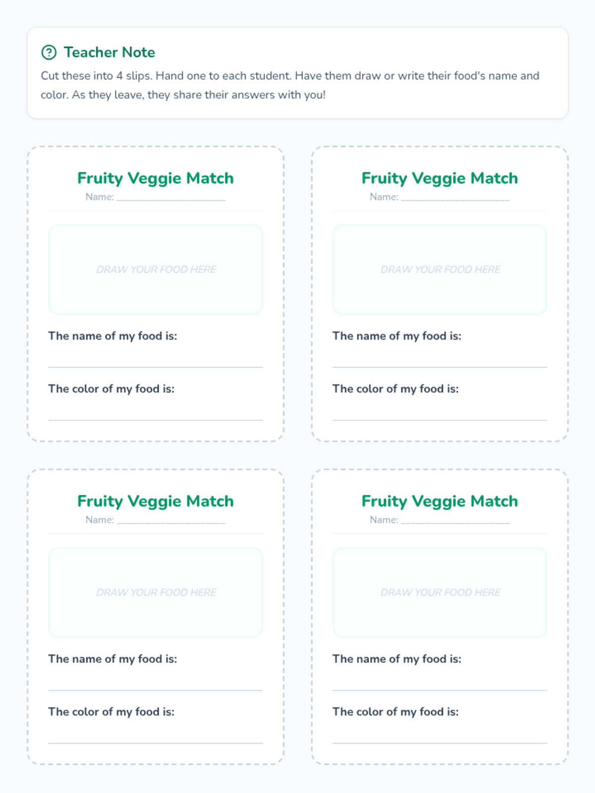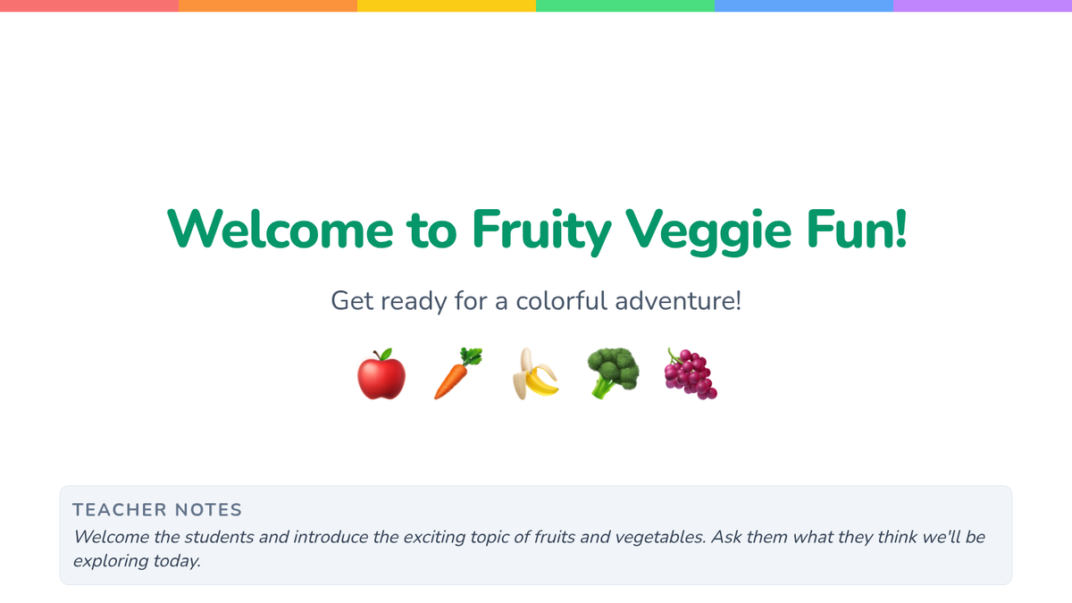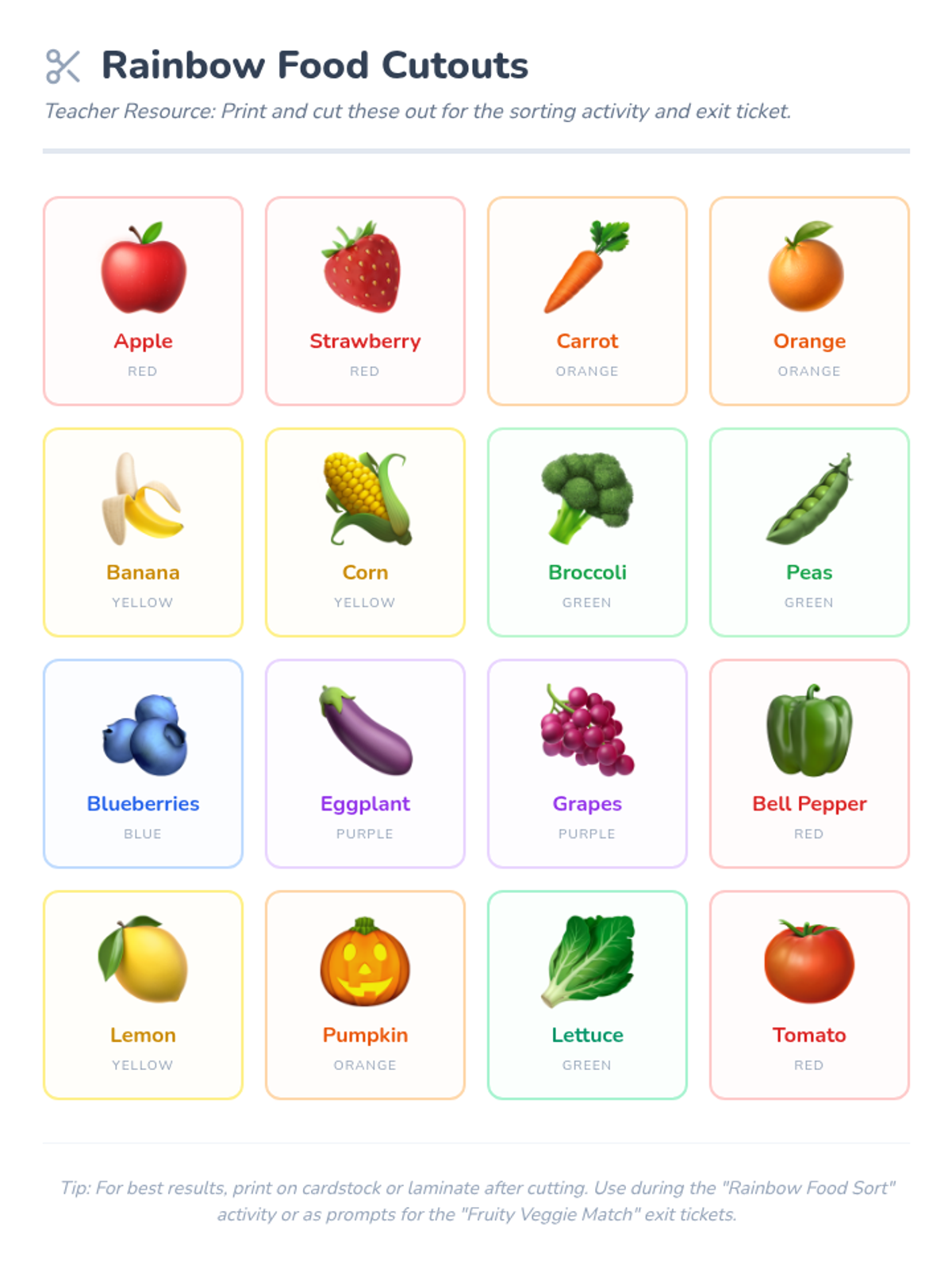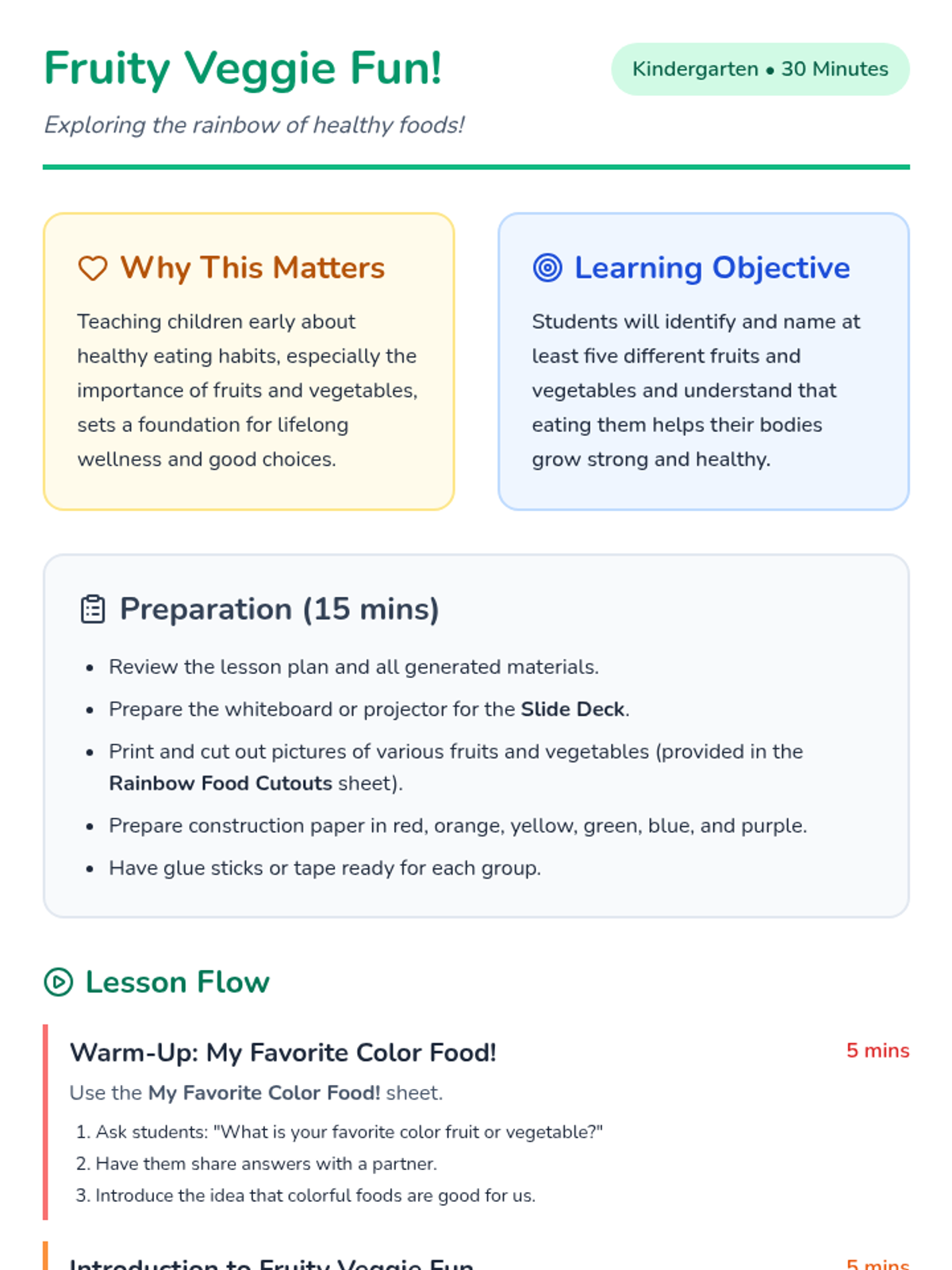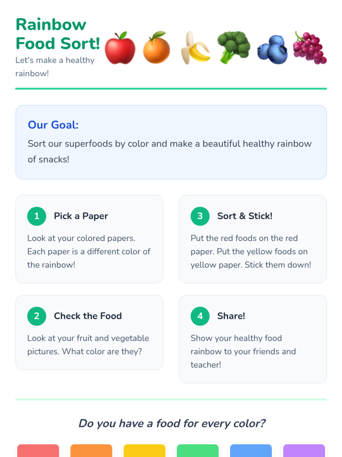 A delightful 30-minute lesson for Kindergarteners to explore and appreciate a rainbow of fruits and vegetables, understanding their importance for a healthy body. Students engage through interactive activities, colorful visuals, and a hands-on sorting game.