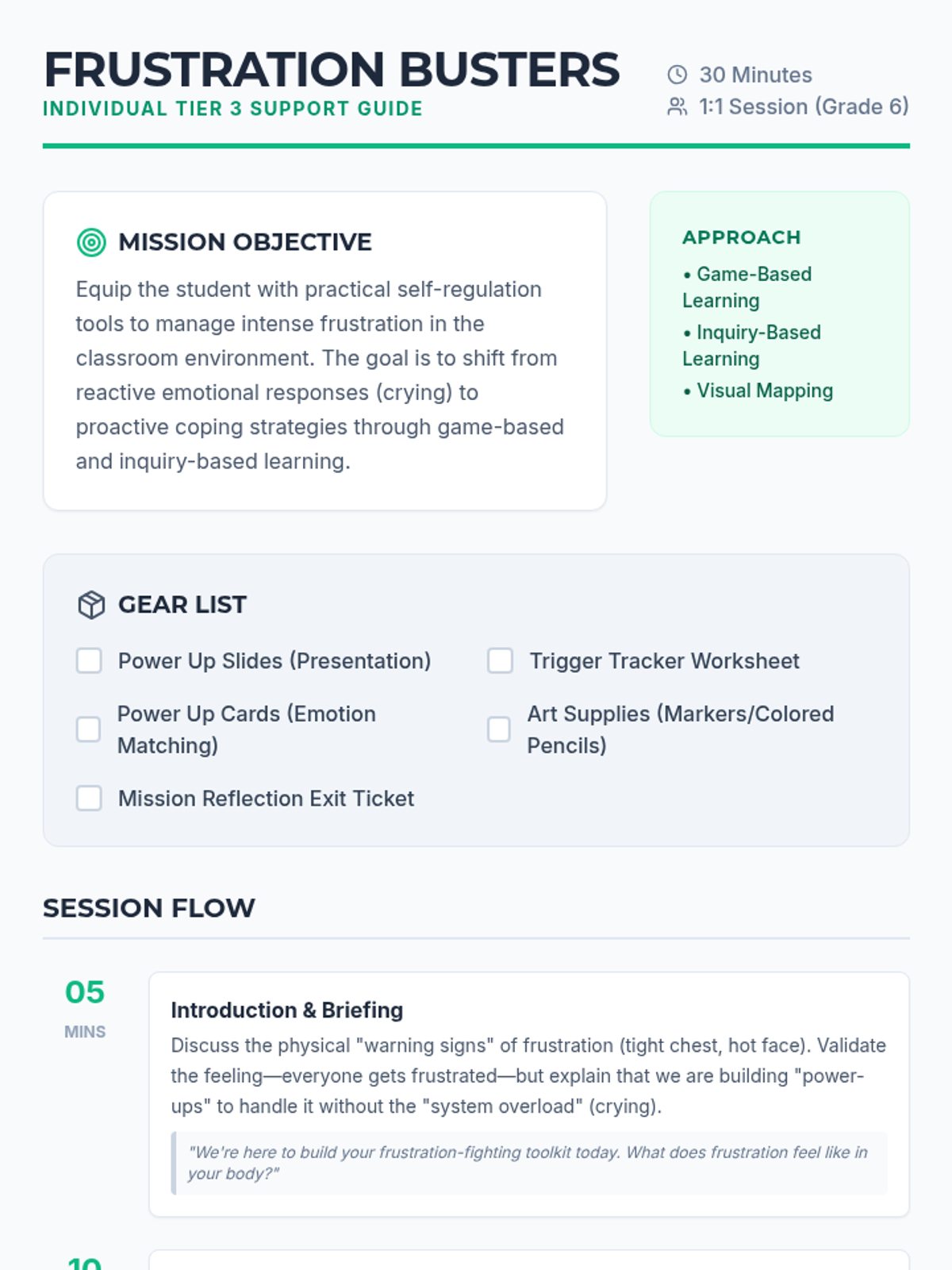 A Tier 3 individual lesson for 6th-grade students to build emotional resilience, identify frustration triggers, and develop self-regulation strategies through a game-based approach.