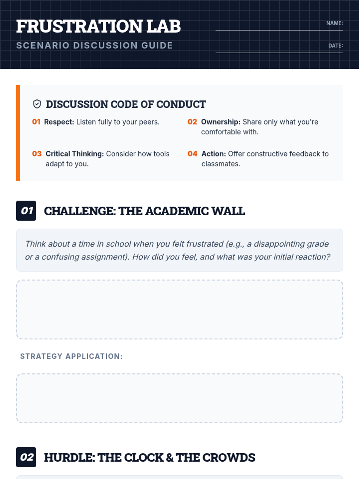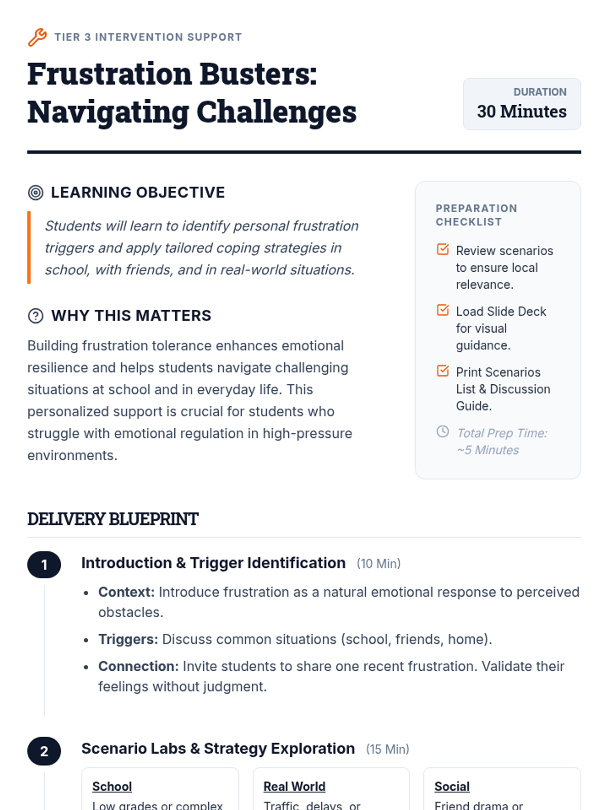 A Tier 3 social-emotional learning lesson for 8th graders focused on identifying frustration triggers and developing personalized coping strategies for school, social, and real-world challenges.