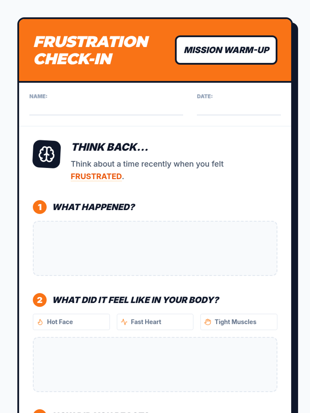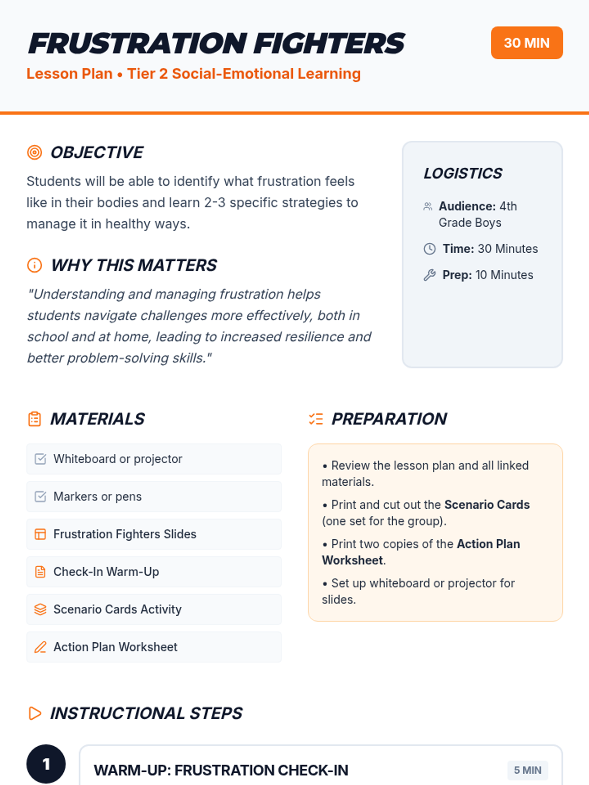 A Tier 2 social-emotional learning lesson designed for 4th-grade boys to identify physical signs of frustration and develop personalized coping strategies. Students engage with scenario cards and create an 'Action Plan' to build resilience and problem-solving skills.