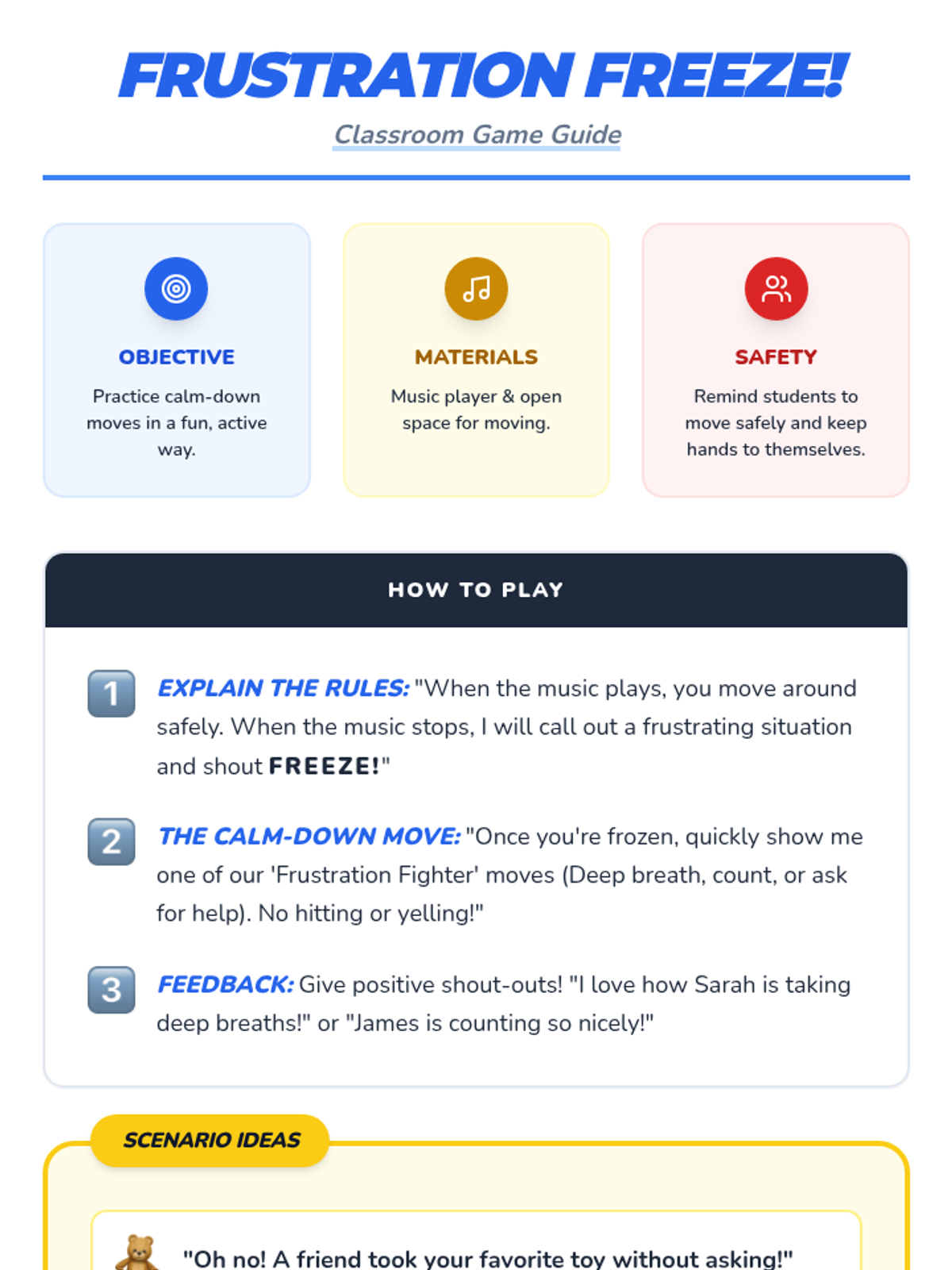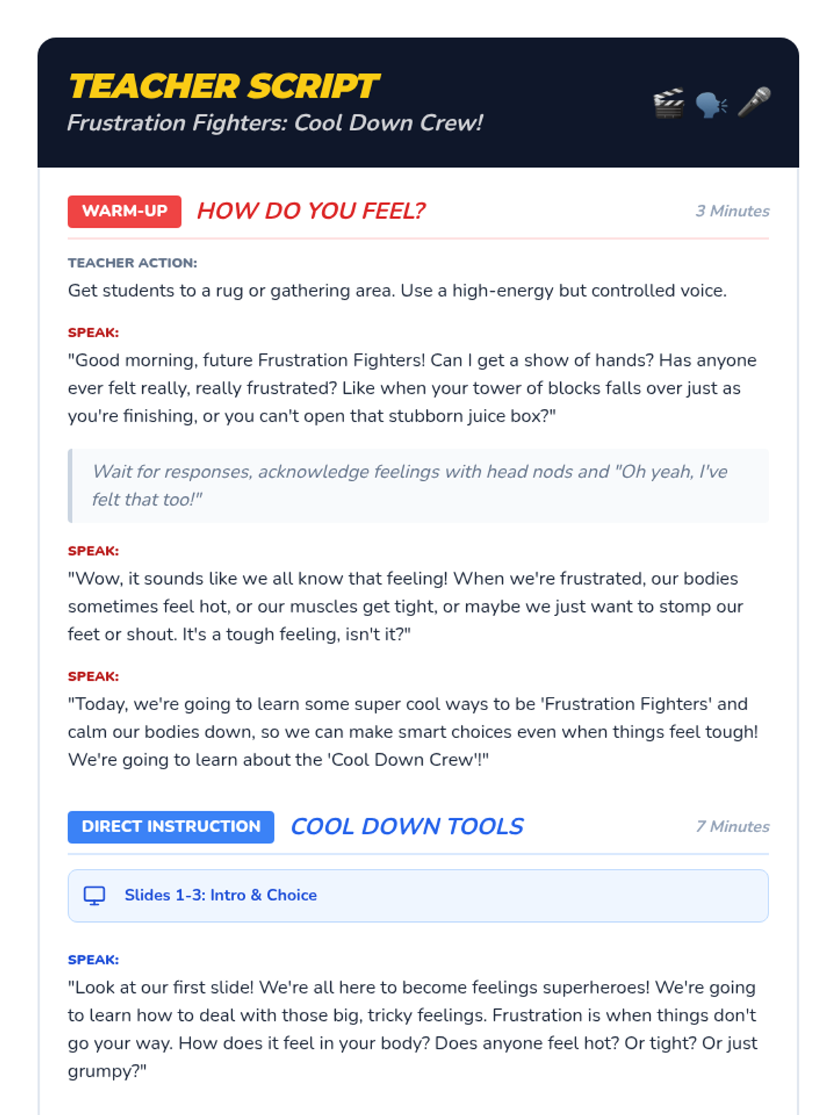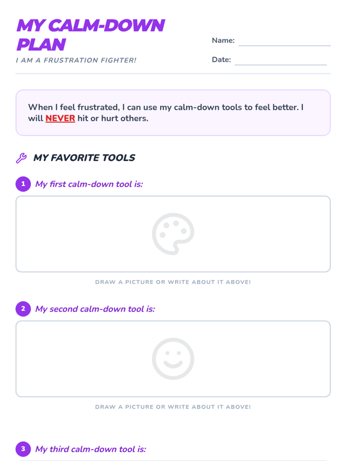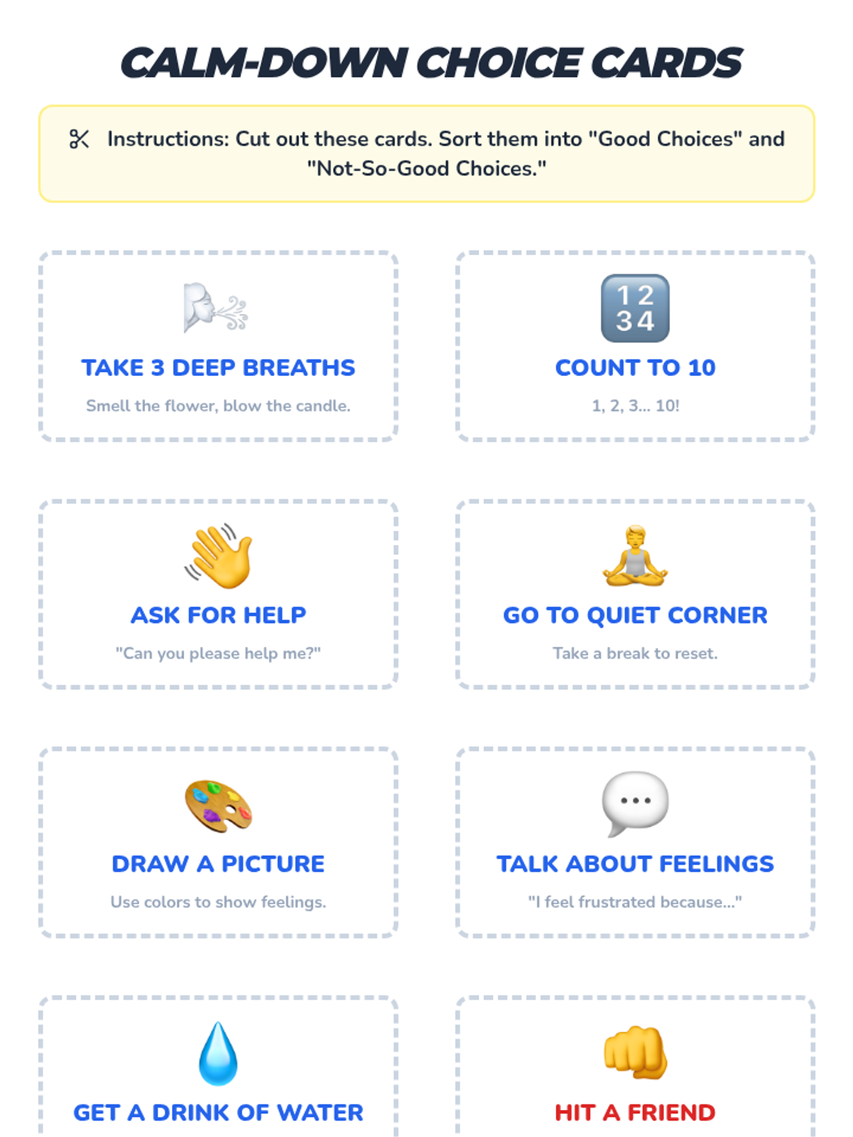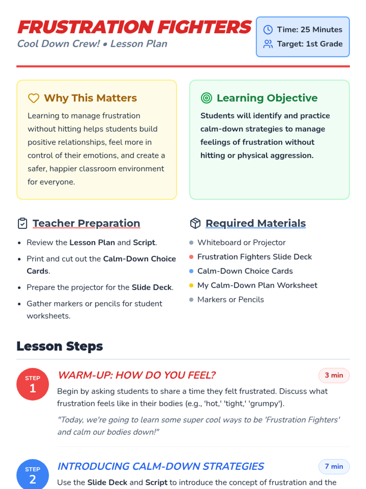 This lesson helps 1st-grade students learn and practice effective calm-down strategies to manage frustration without resorting to physical aggression, specifically hitting peers. Through discussion, a slide presentation, sorting activities, and a game, students develop self-regulation tools for a safer classroom.