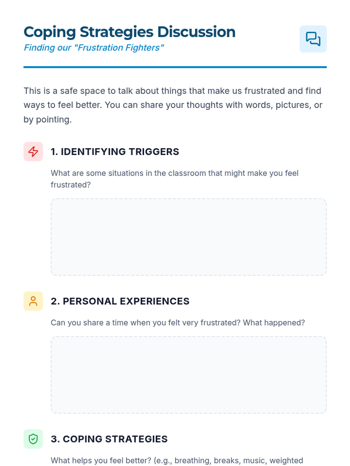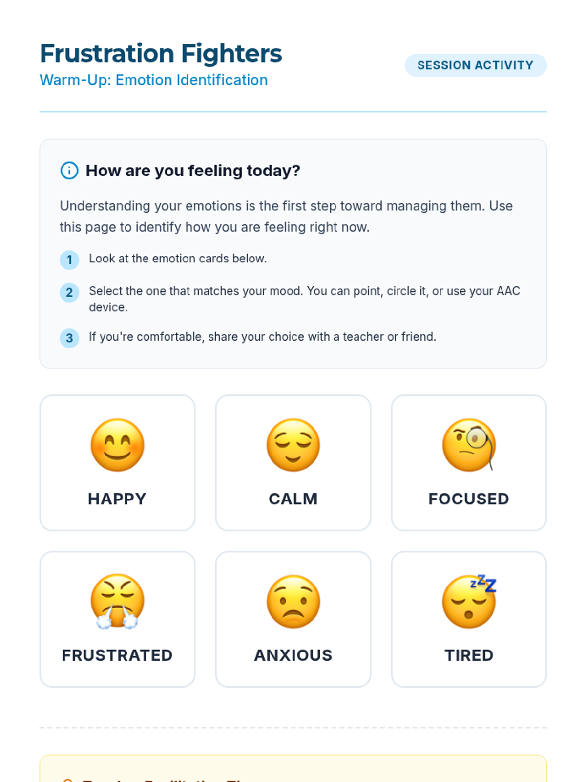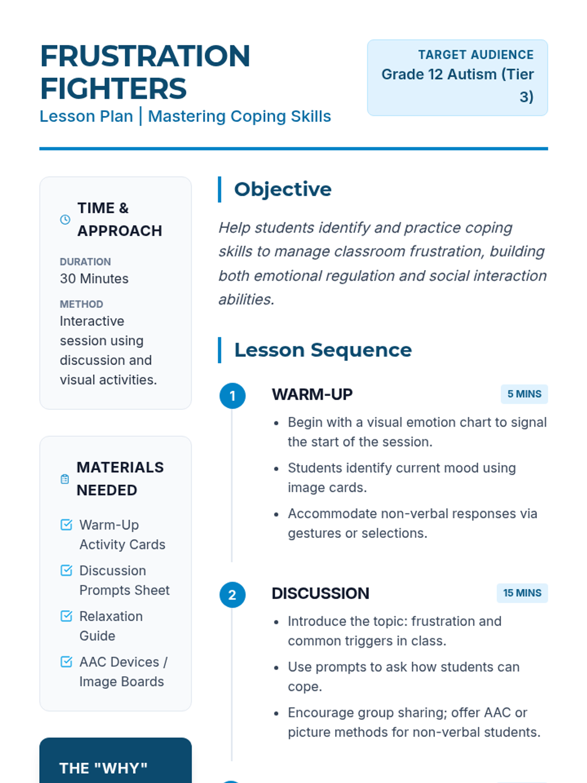 A 30-minute Tier 3 intervention for Grade 12 students with autism, focusing on identifying triggers and practicing coping strategies for classroom frustration.
