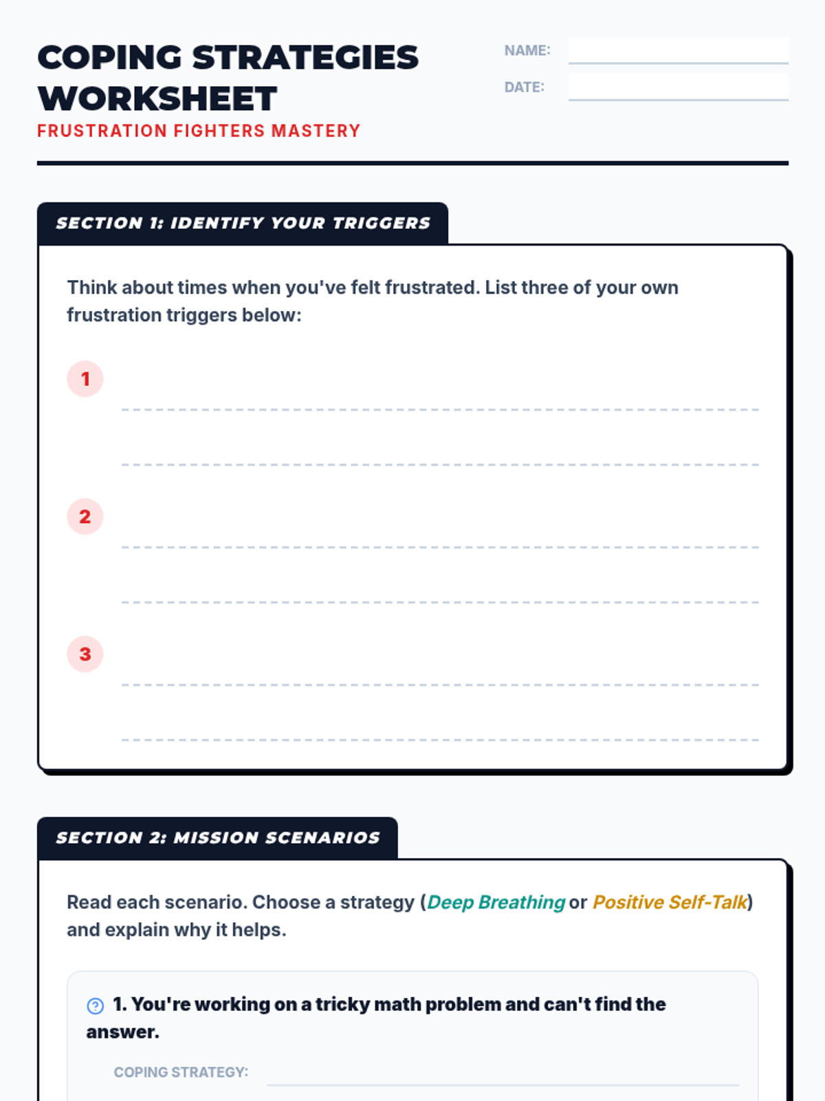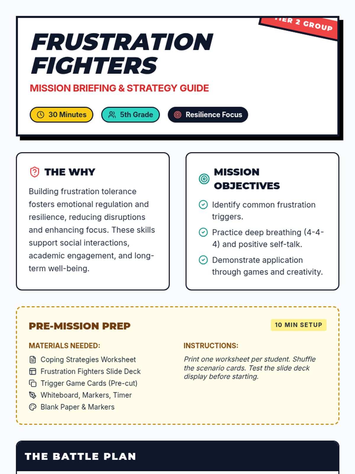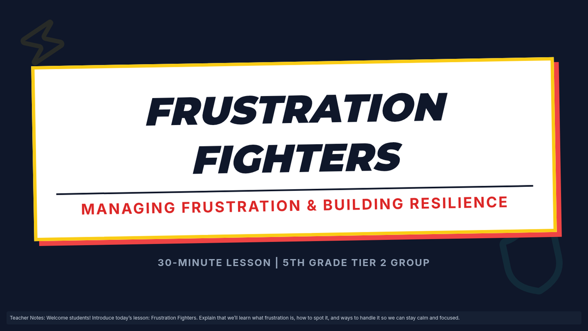 A Tier 2 social-emotional learning lesson for 5th graders designed to help them identify frustration triggers and apply coping strategies like deep breathing and positive self-talk.