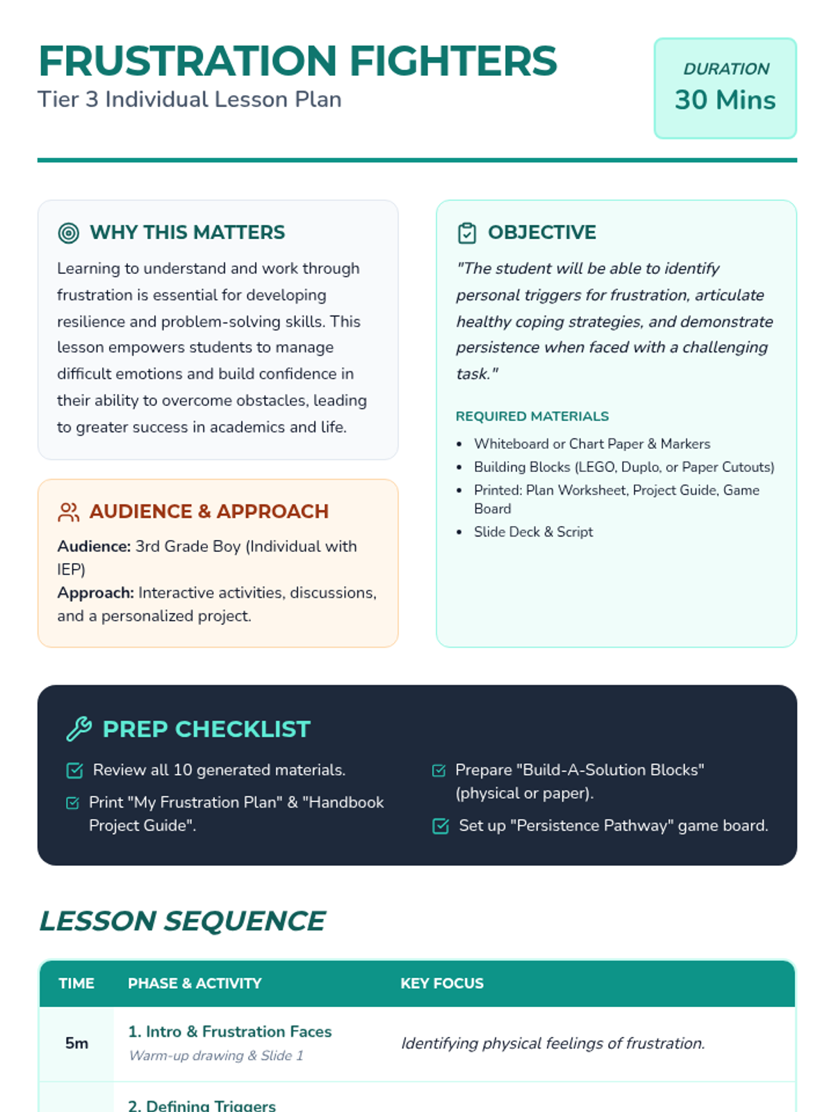 A 30-minute individual Tier 3 lesson for 3rd grade students to identify frustration triggers and develop personal coping strategies through interactive building activities and a superhero-themed approach.