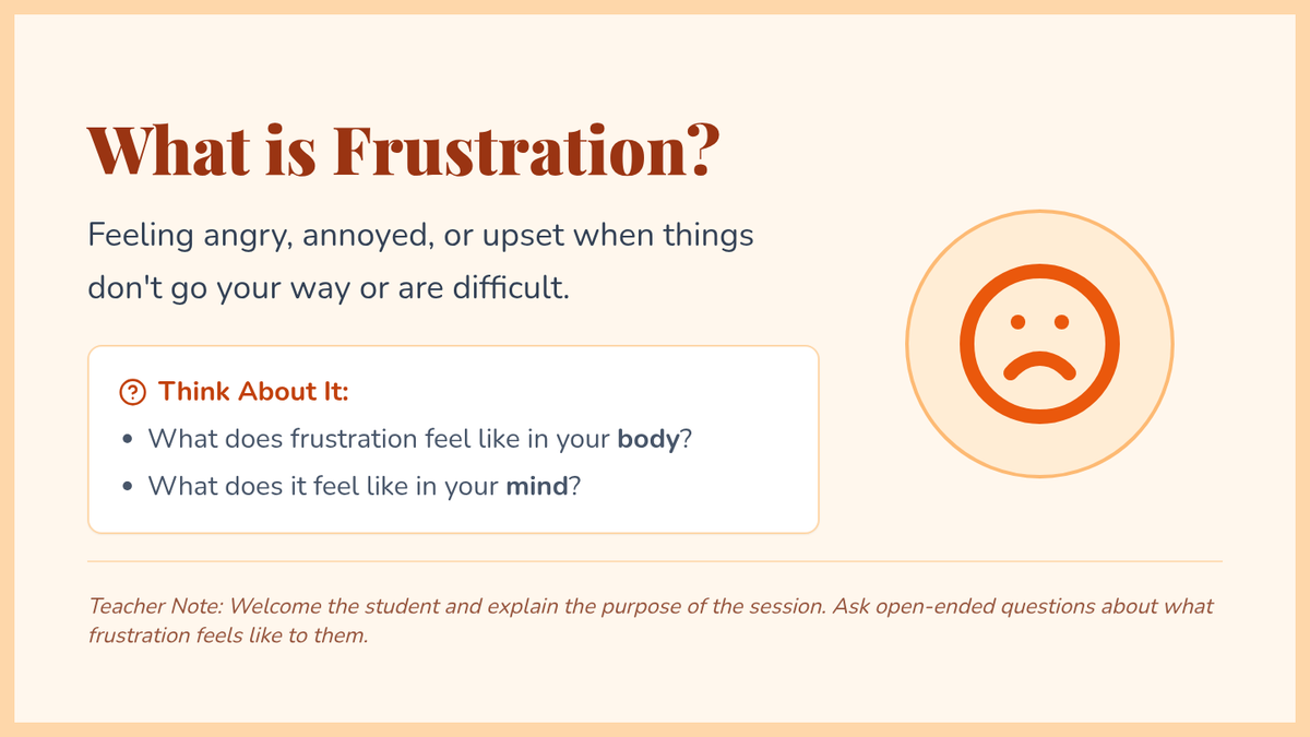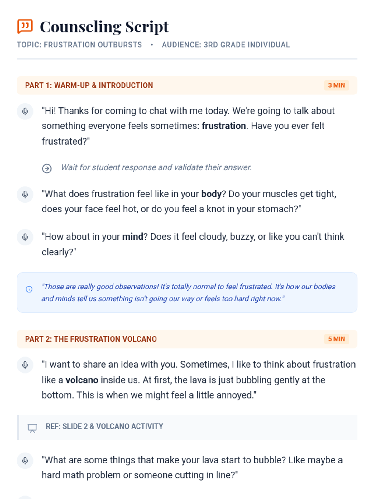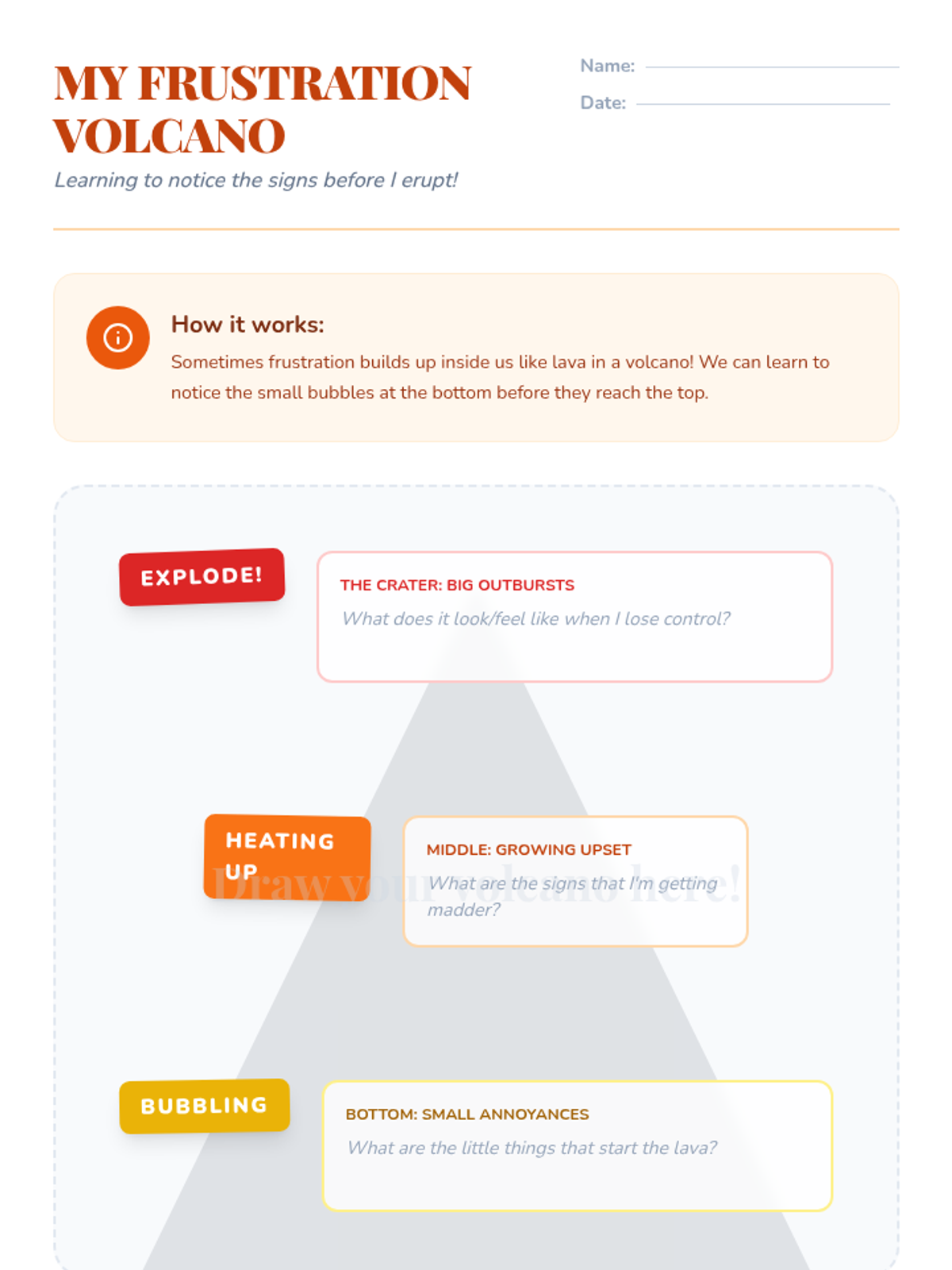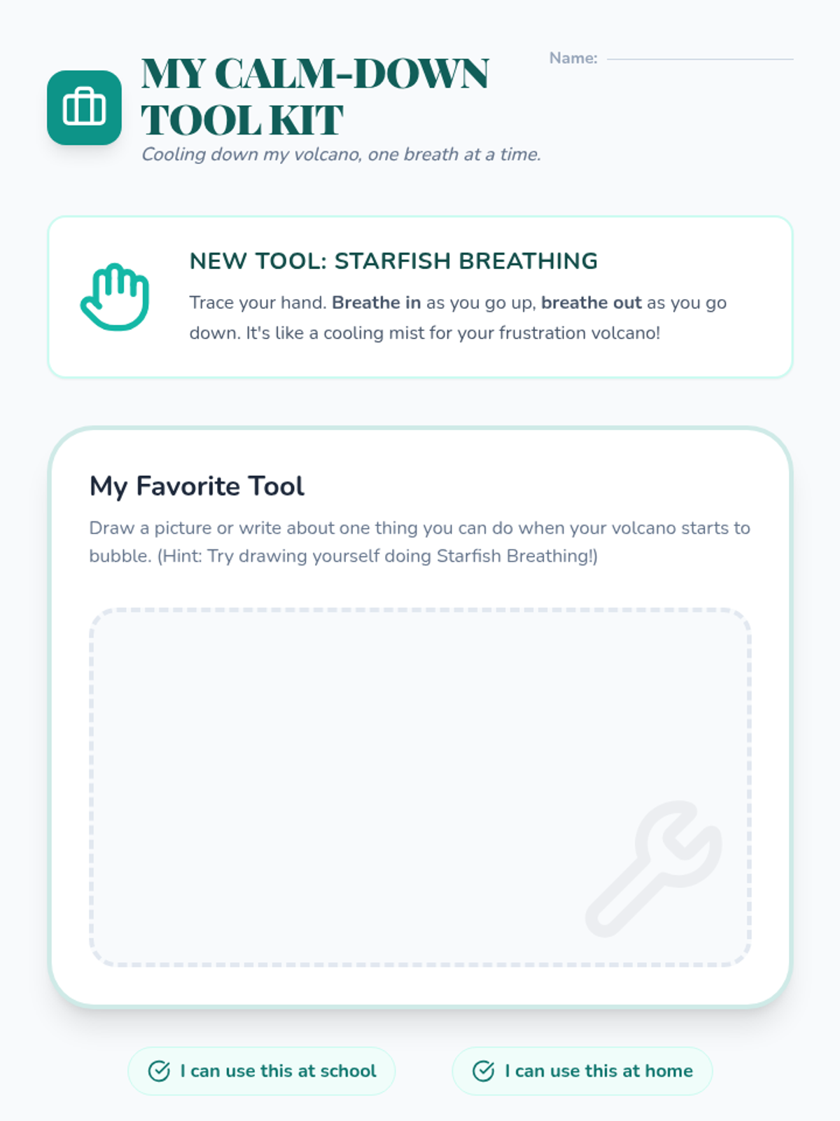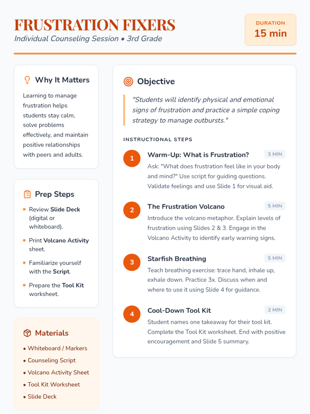 A quick 15-minute individual counseling session for a 3rd-grade student to identify frustration signs and practice Starfish Breathing using a volcano metaphor.