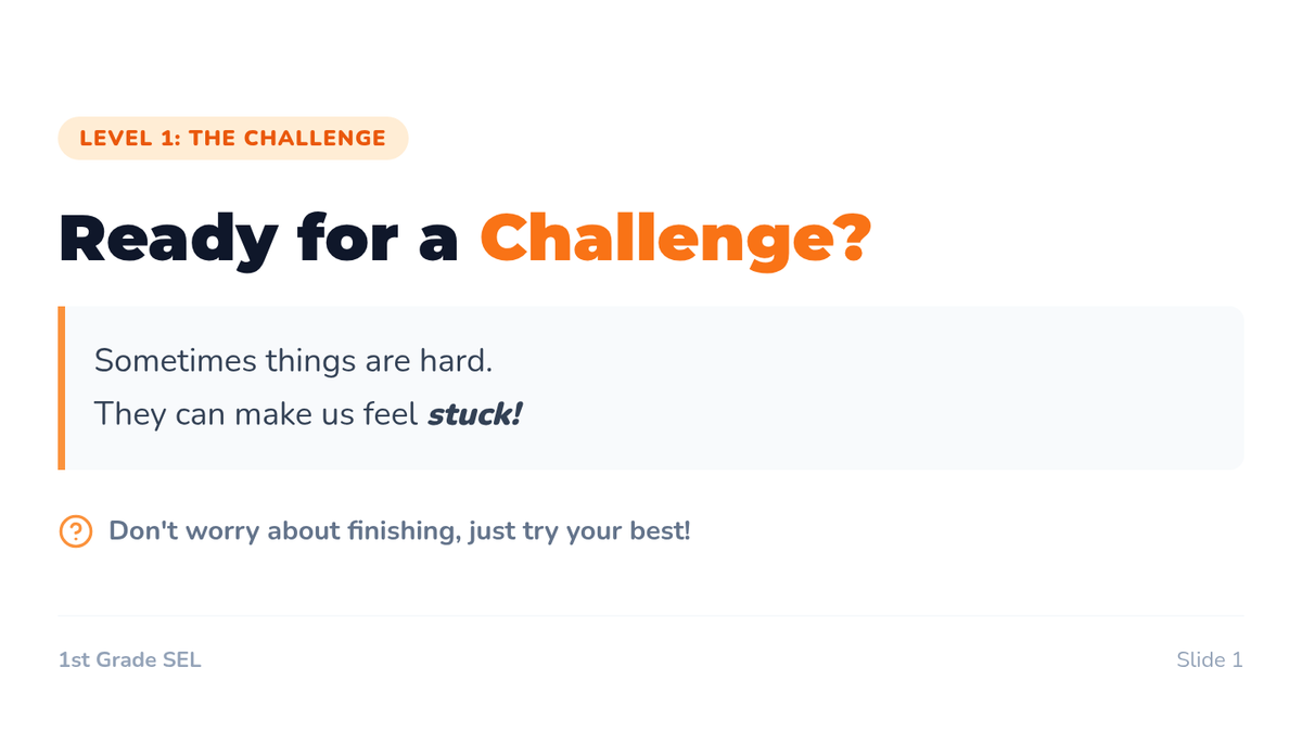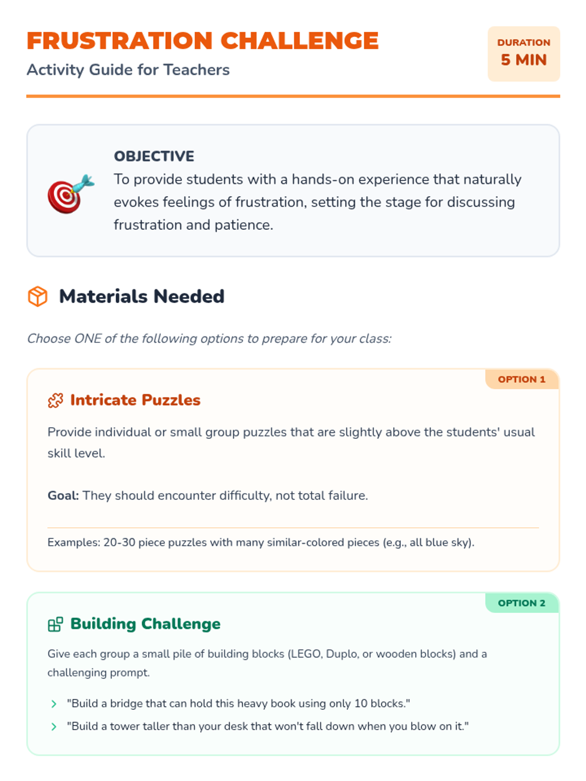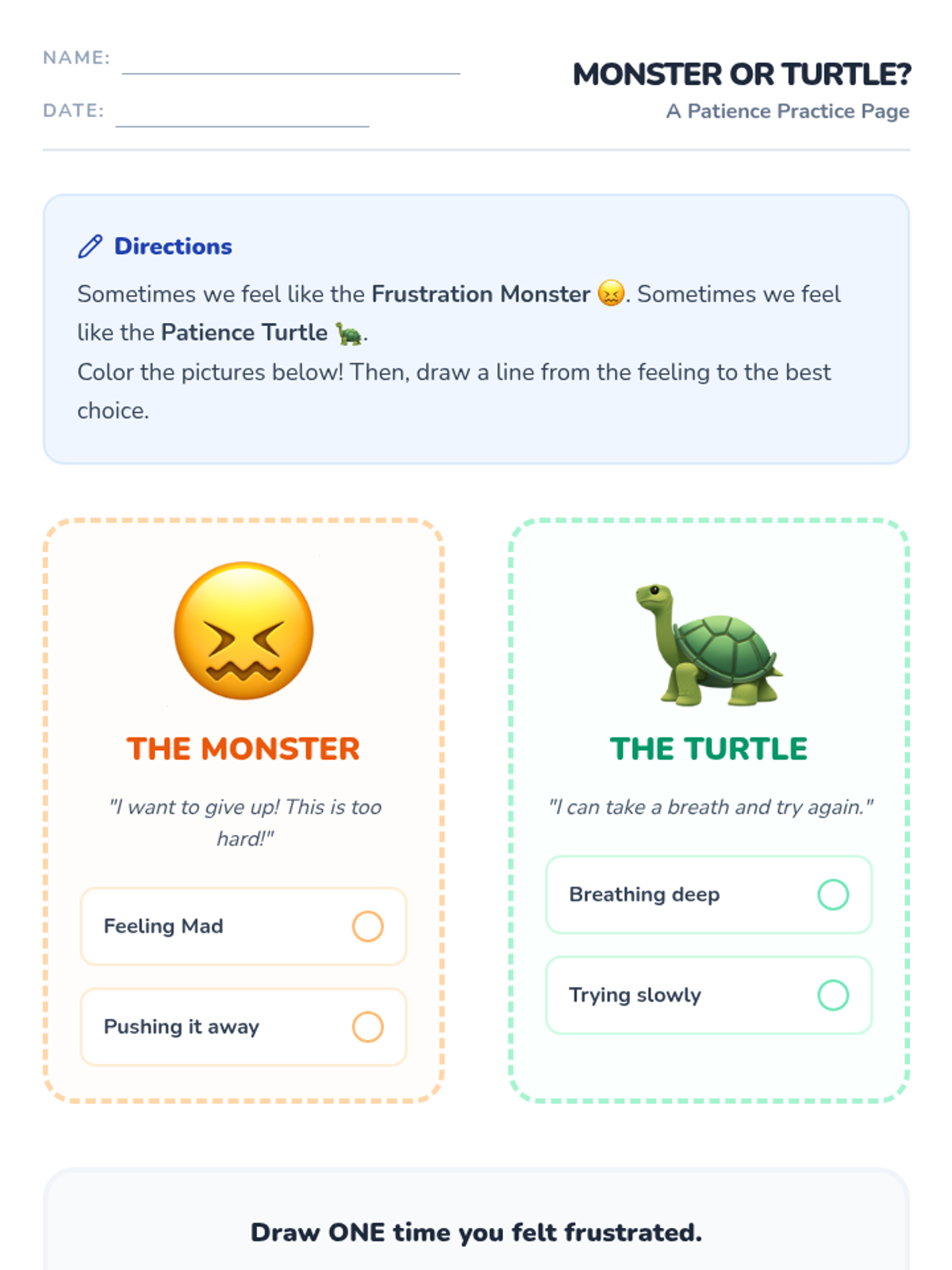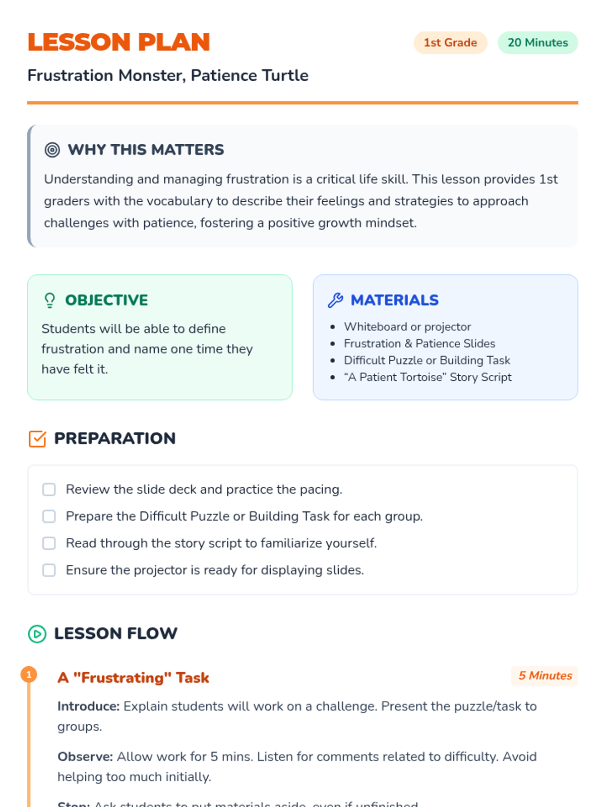 A 20-minute SEL lesson for 1st graders to help them identify frustration and practice patience using character-based metaphors.