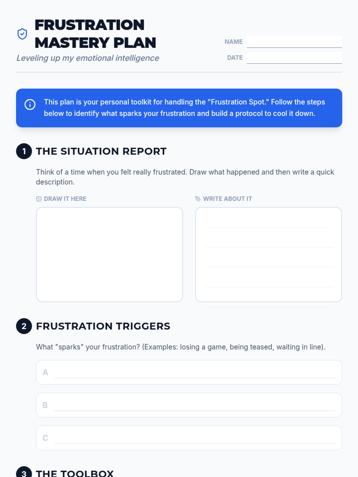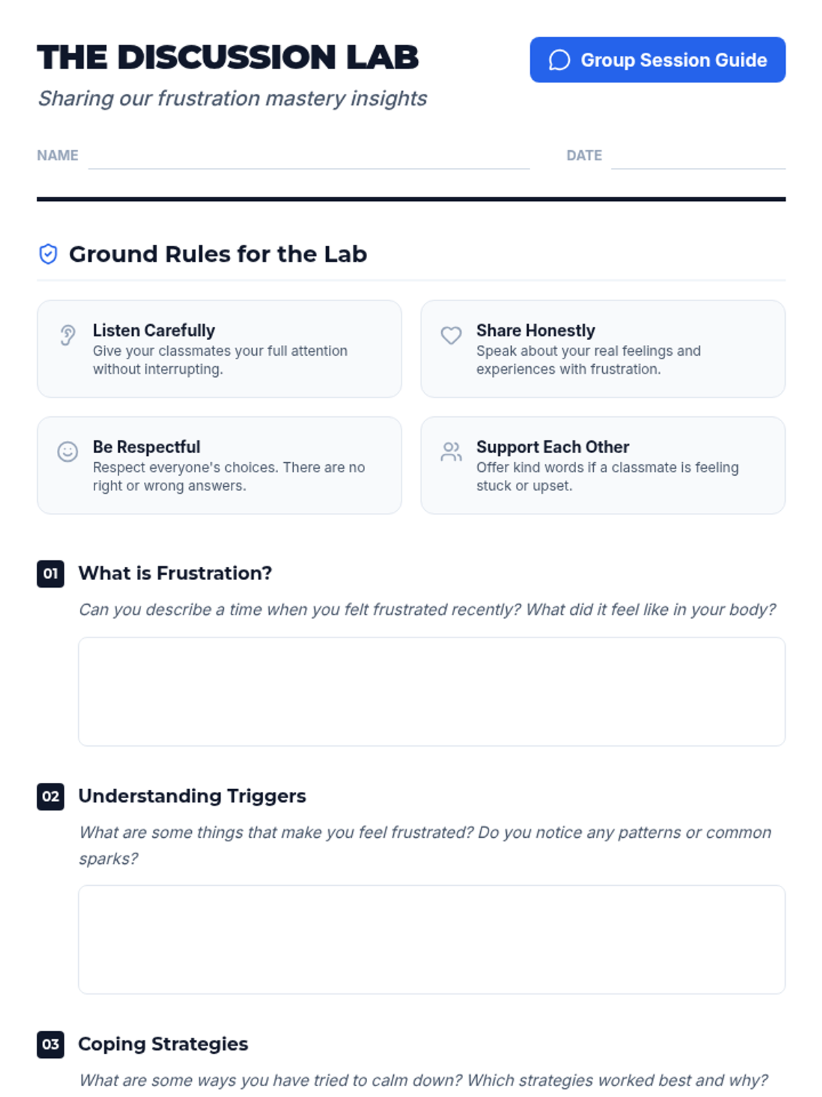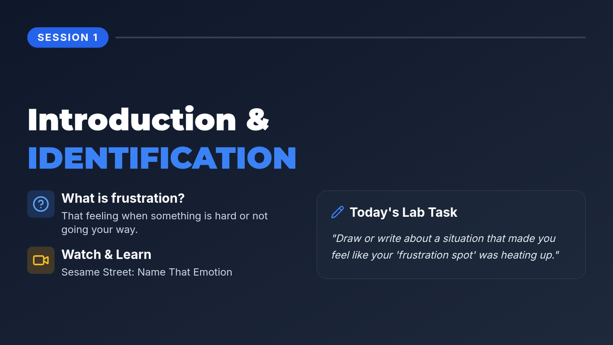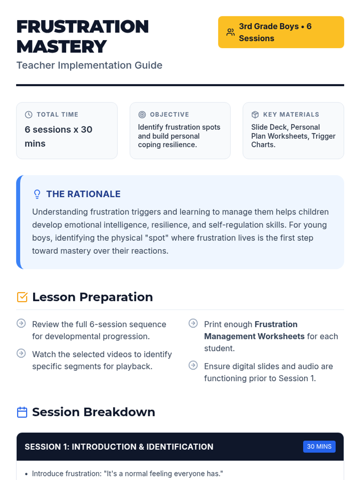 A 6-session series for 3rd grade boys focusing on identifying frustration triggers and developing personalized coping strategies. Students will engage in role-playing, practice mindfulness, and create a personal management plan.