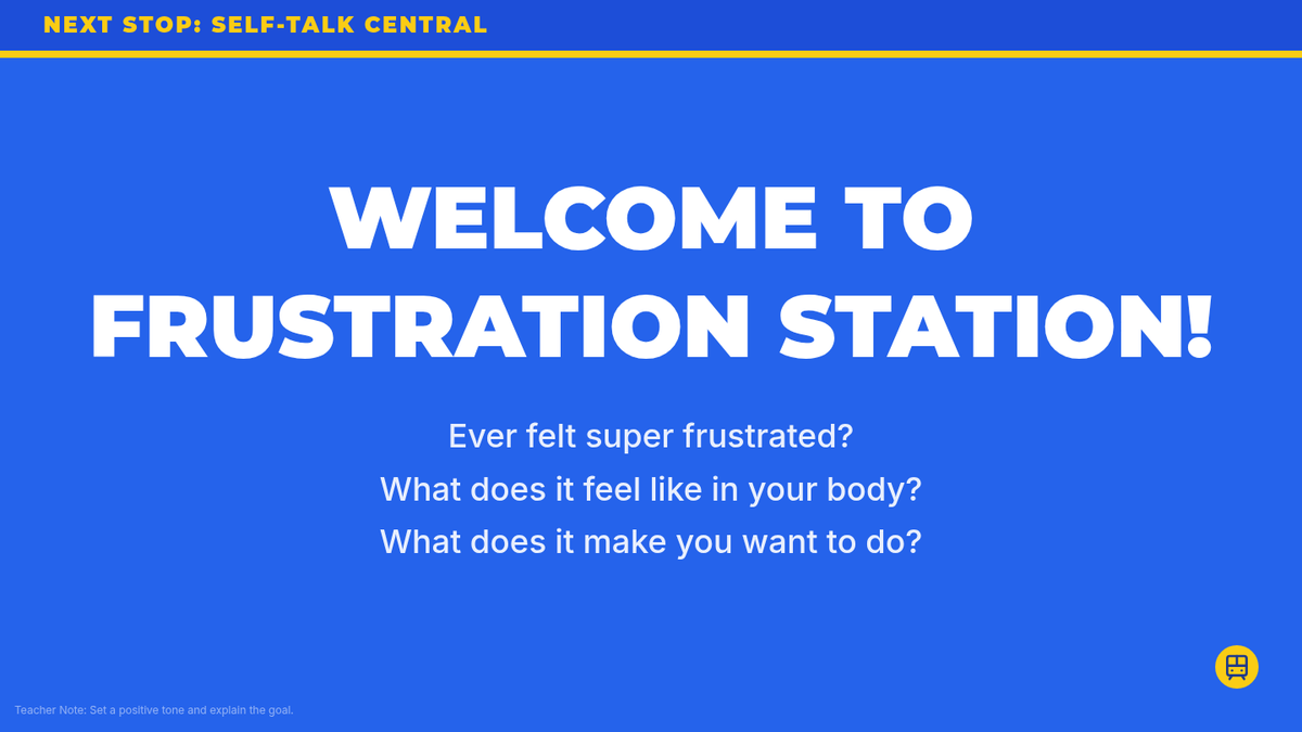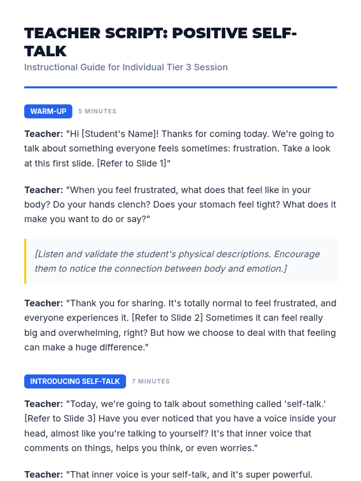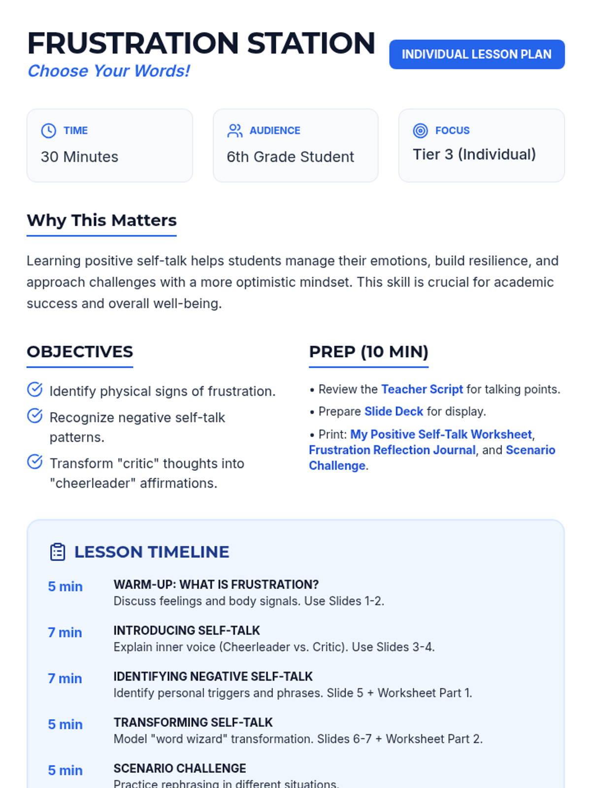 A 30-minute Tier 3 individual lesson for 6th graders to develop positive self-talk strategies for managing frustration, shifting internal dialogue from negative to positive.
