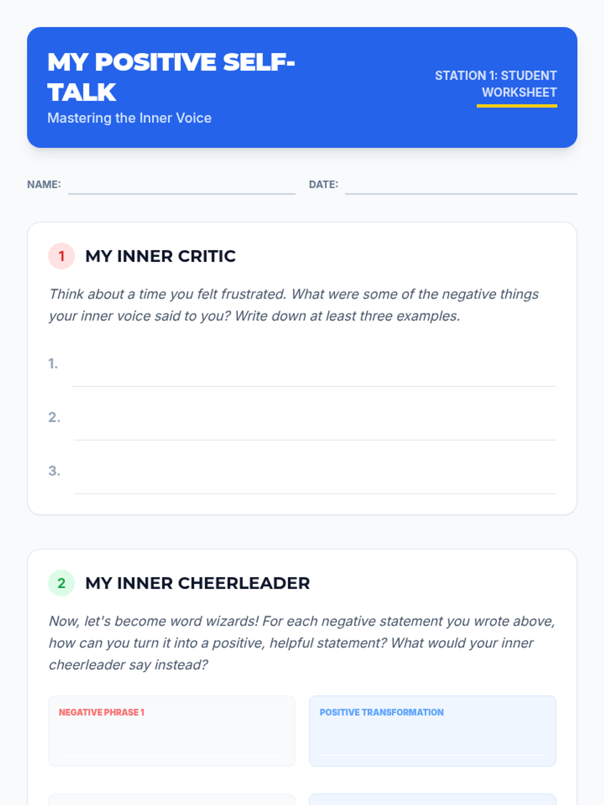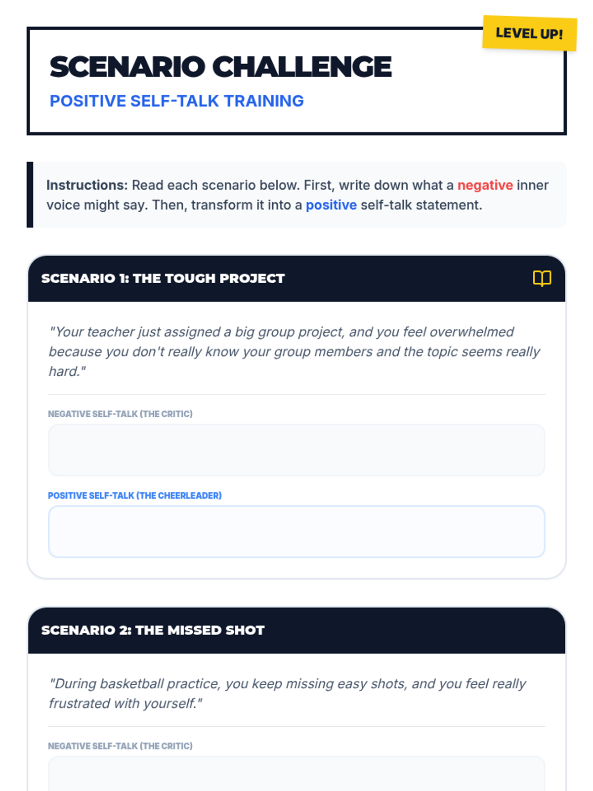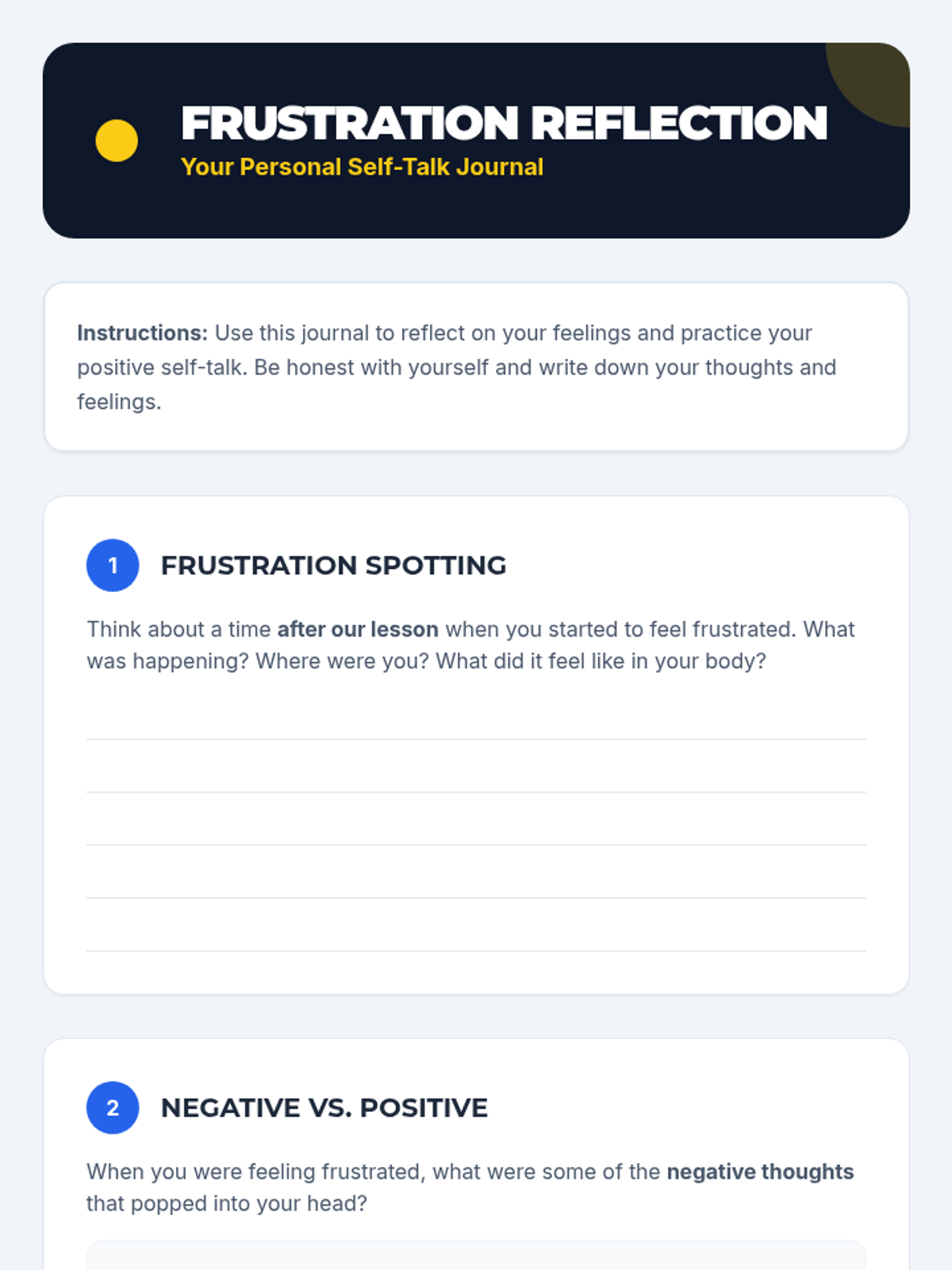 A 30-minute Tier 3 individual lesson for 6th graders to develop positive self-talk strategies for managing frustration, shifting internal dialogue from negative to positive.