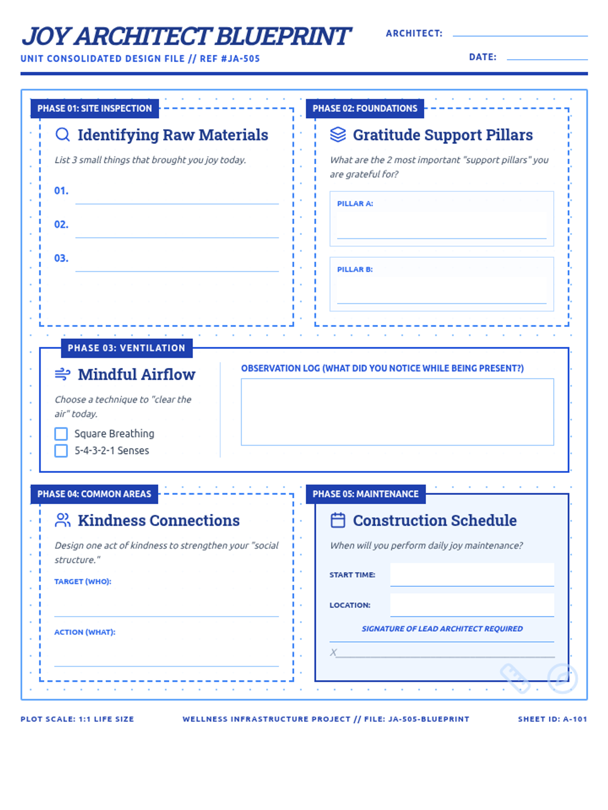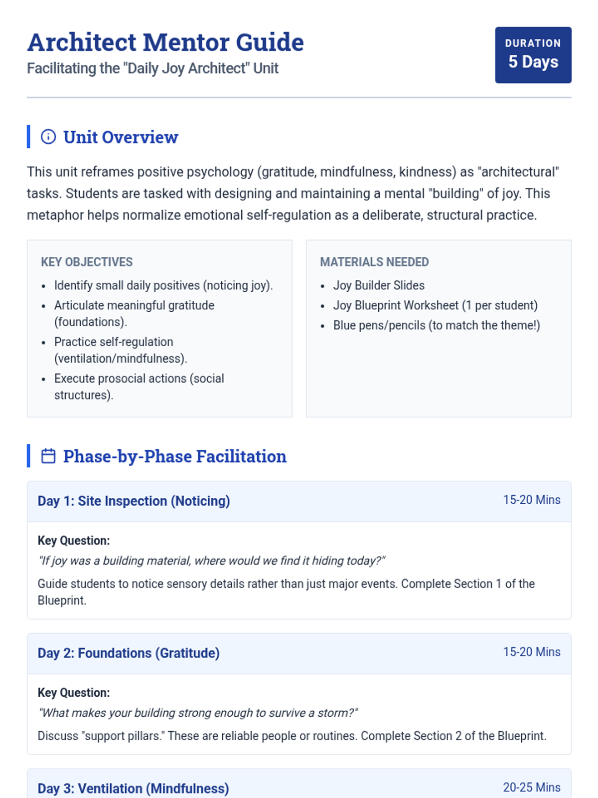 Students learn to identify 'raw materials' of joy—small, positive moments in their daily lives—and begin their joy site inspection.